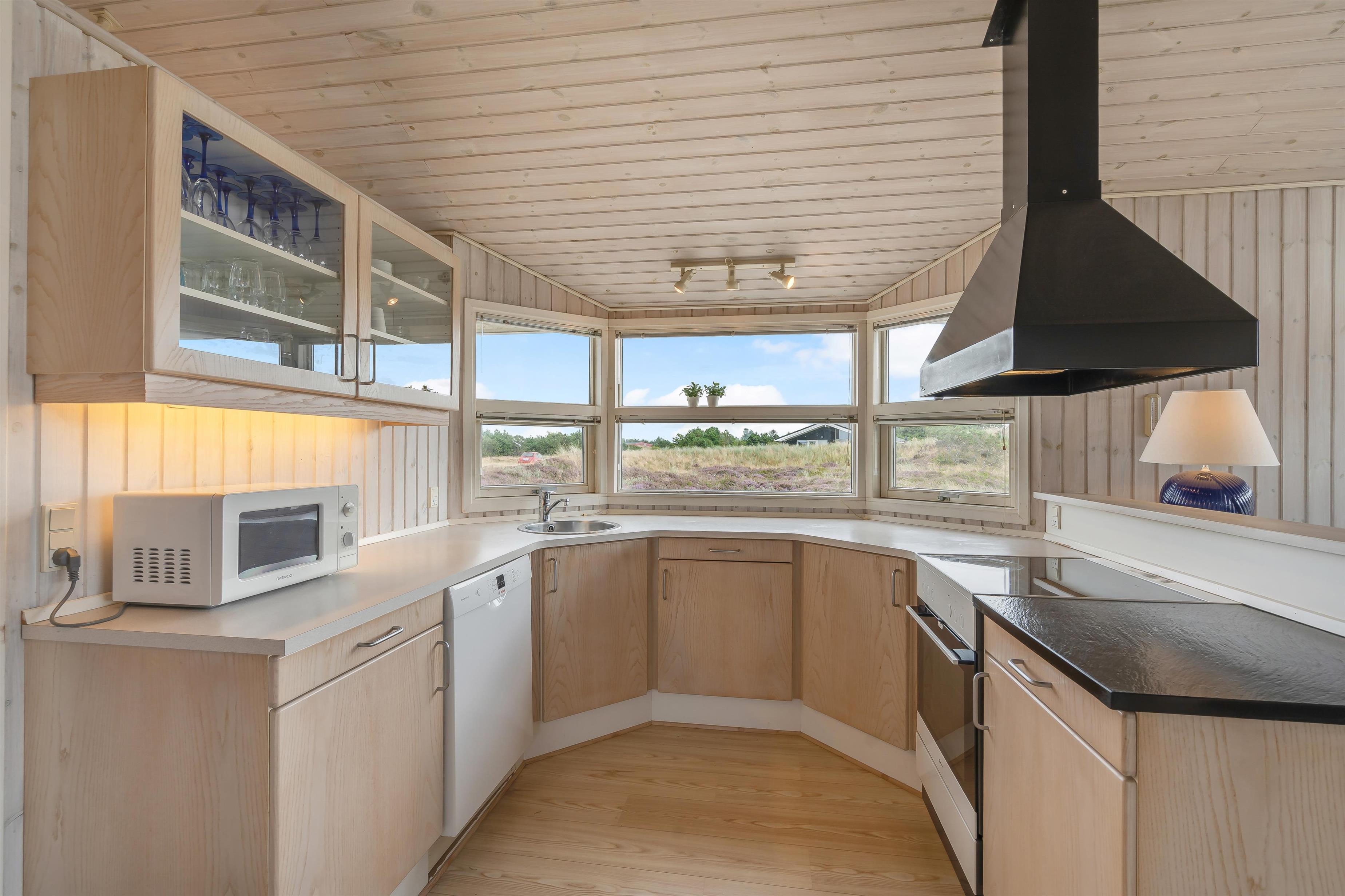 Kernen i det 78 m2 store feriehus er det åbne køkkenalrum med spiseplads og gode komfortable møbler. Lad familiens kok fremtrylle lækkerier i køkkenet, mens familiens mindste hygger omkring spisebordet med et brætspil eller ser en god film i TV'et. Om aftenen kan I tænde op i brændeovnen og nyde flammernes dans, mens den beroligende knitren fylder rummet. Alternativt kan I benytte varmepumpen, som sørger for hurtig og energibesparende opvarmning af feriehuset.