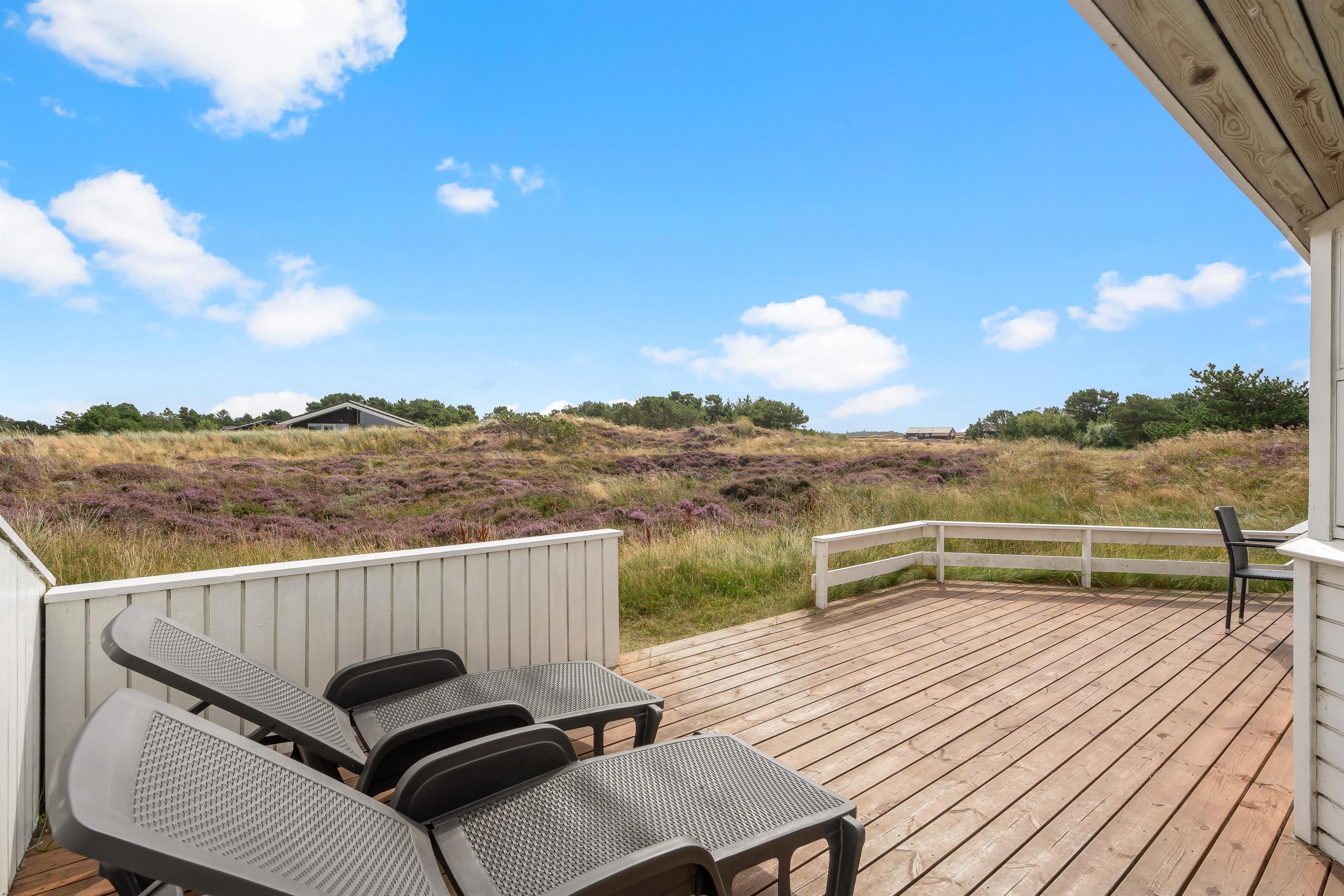 Feriehuset på Hedemarken 9 ligger godt på den 2500 m2 store kuperede naturgrund og har en terrasse, der løber omkring 2 sider af feriehuset på den sydøstlige side. Her står havemøbler, solvogne og en grill klar til at indbyde jer til hyggelige timer på terrassen.