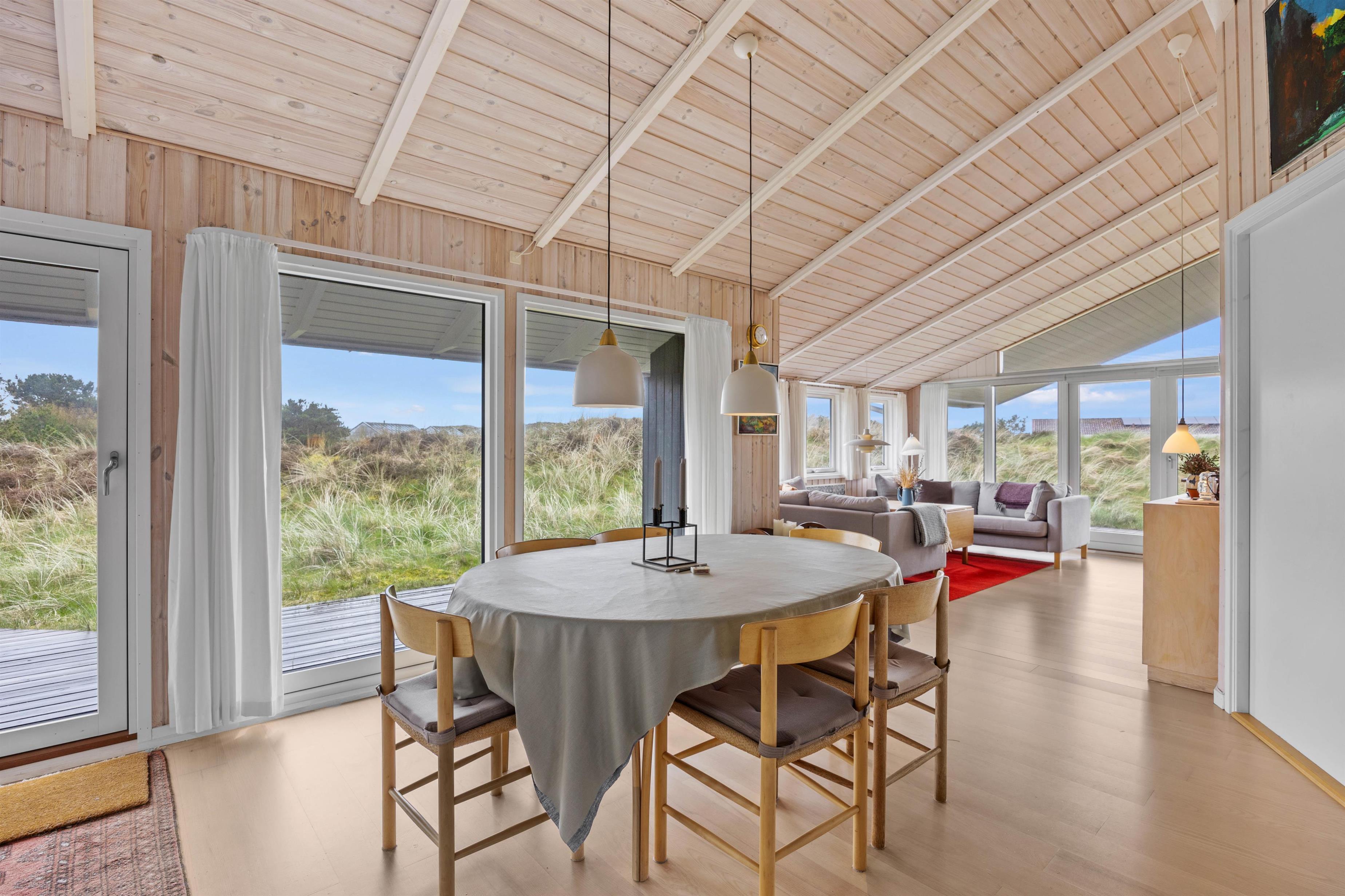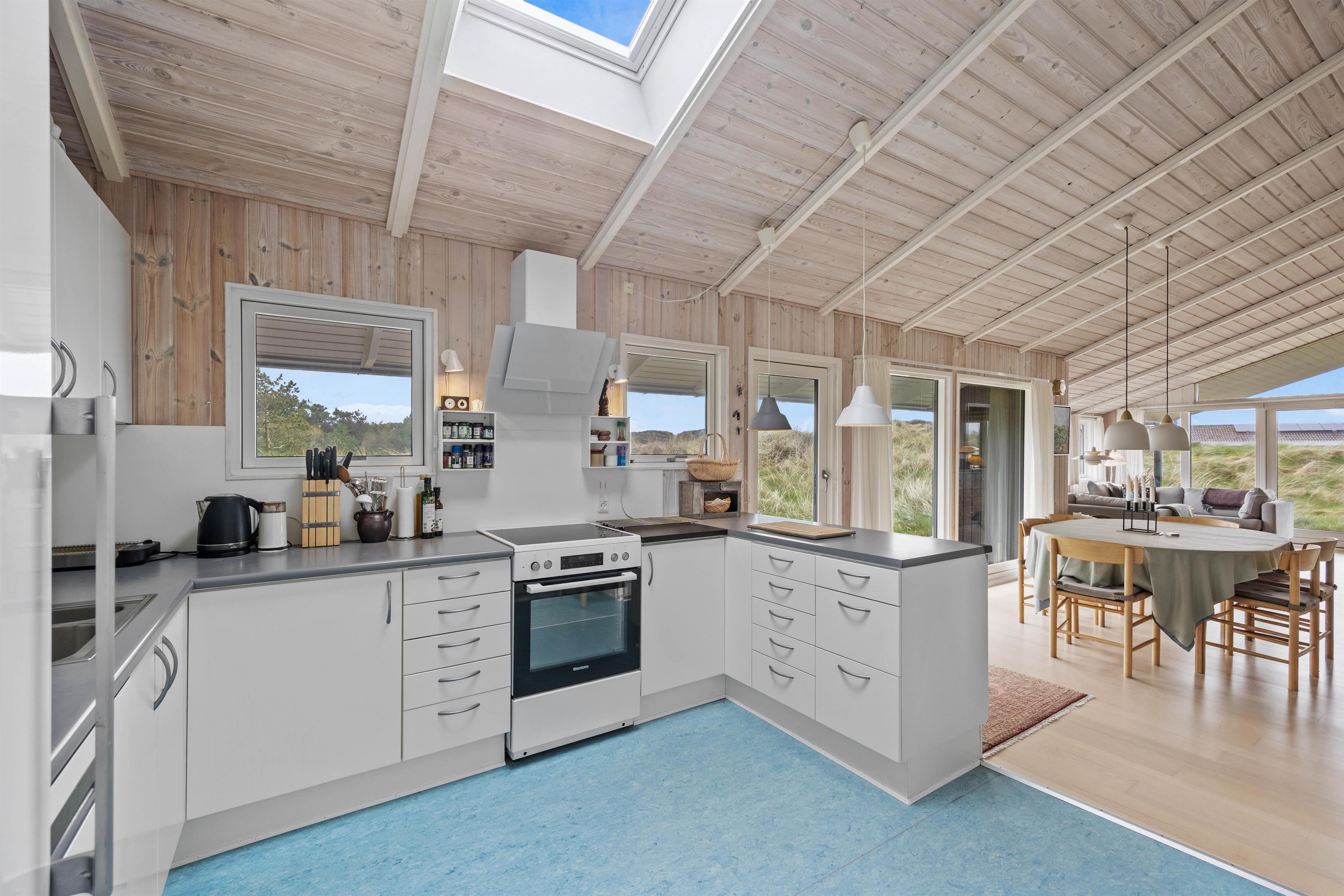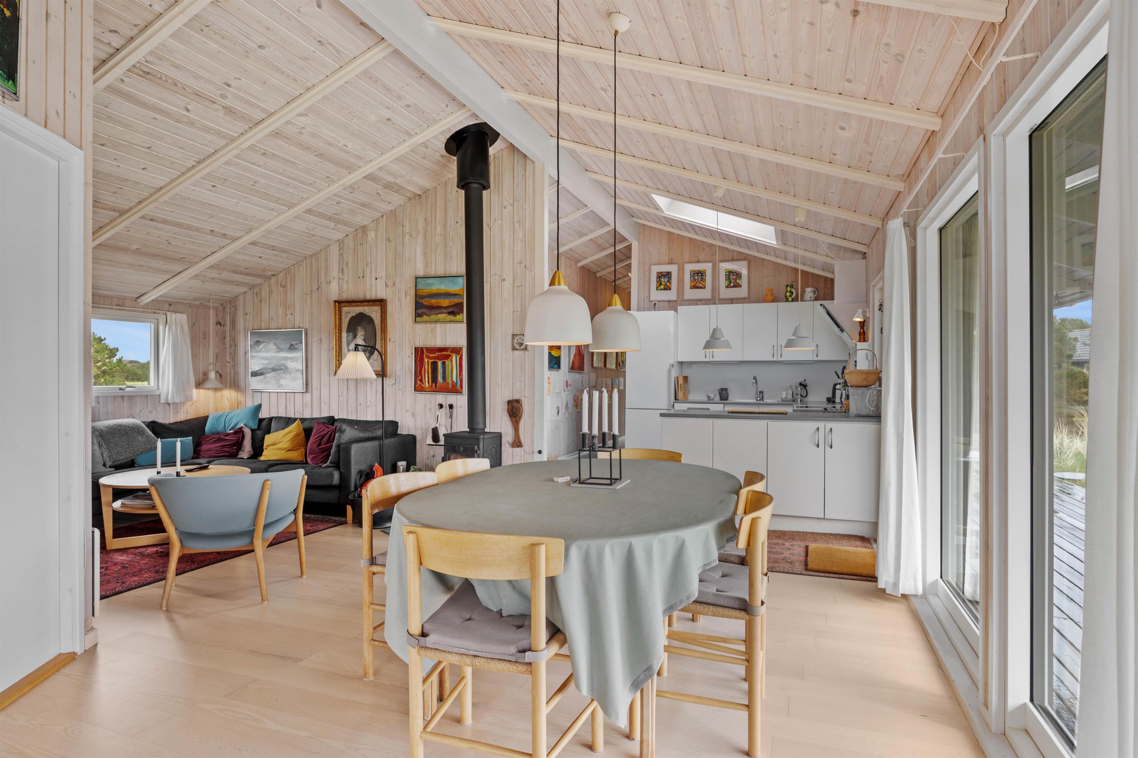 Træd ind i feriehuset og mærk straks den lyse indretning og hyggelige atmosfære sprede feriestemning. Den rummelige stue byder jer velkommen med en brændeovn, perfekt til kølige aftener og hyggelige stunder sammen. Med 3 smagfuldt indrettede soveværelser, alle udstyret med komfortable dobbeltsenge, samt 2 rummelige badeværelser med gulvvarme, er der rigeligt med plads til hele familien eller vennerne på feriehusets 138 velindrettede kvadratmeter. For at sikre jer en behagelig og bekvem ferieoplevelse er feriehuset udstyret med moderne faciliteter, herunder en opvaskemaskine, vaskemaskine og tørretumbler. Den omkostnings- og energibesparende varmepumpe sørger for behagelige temperaturer i feriehuset.