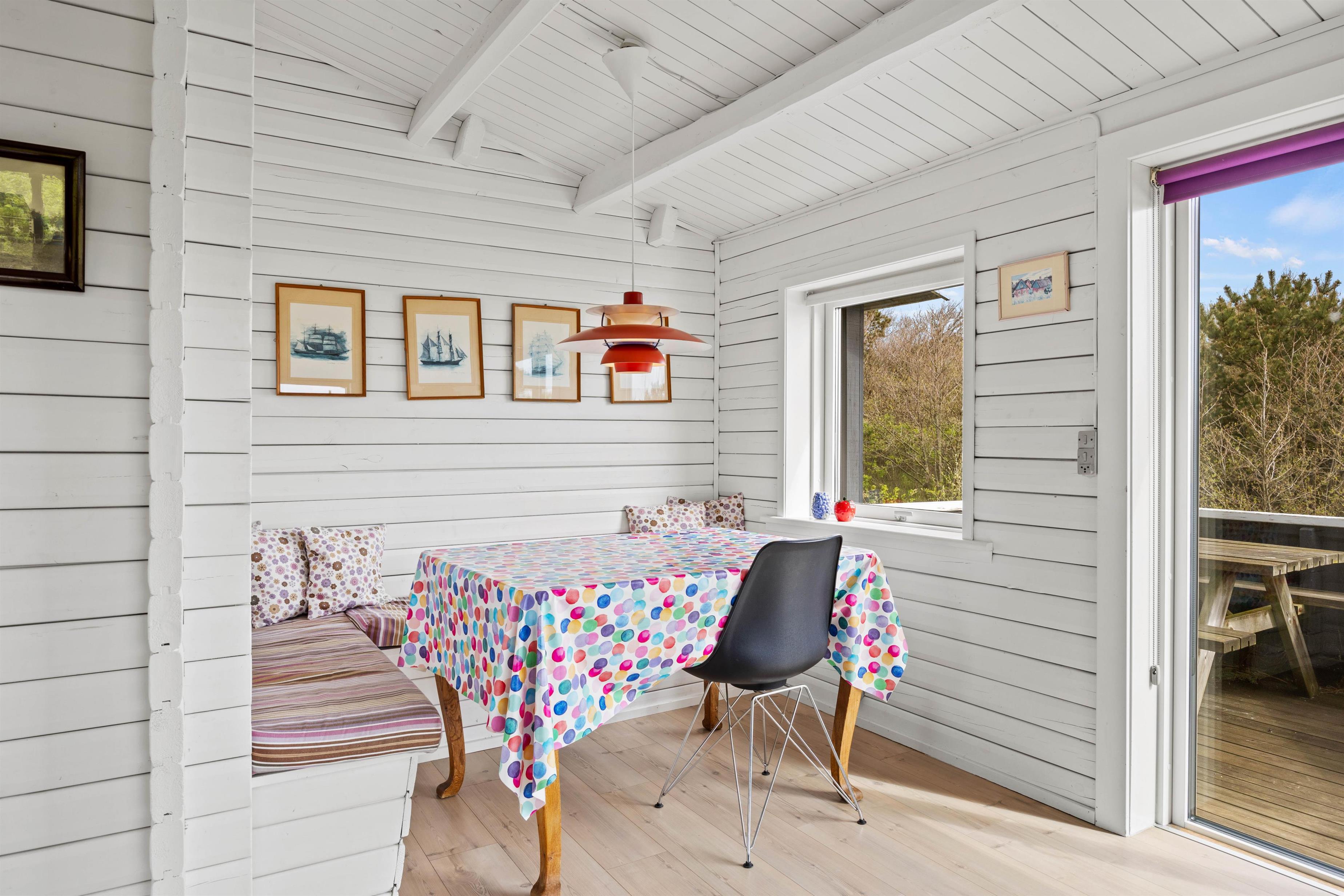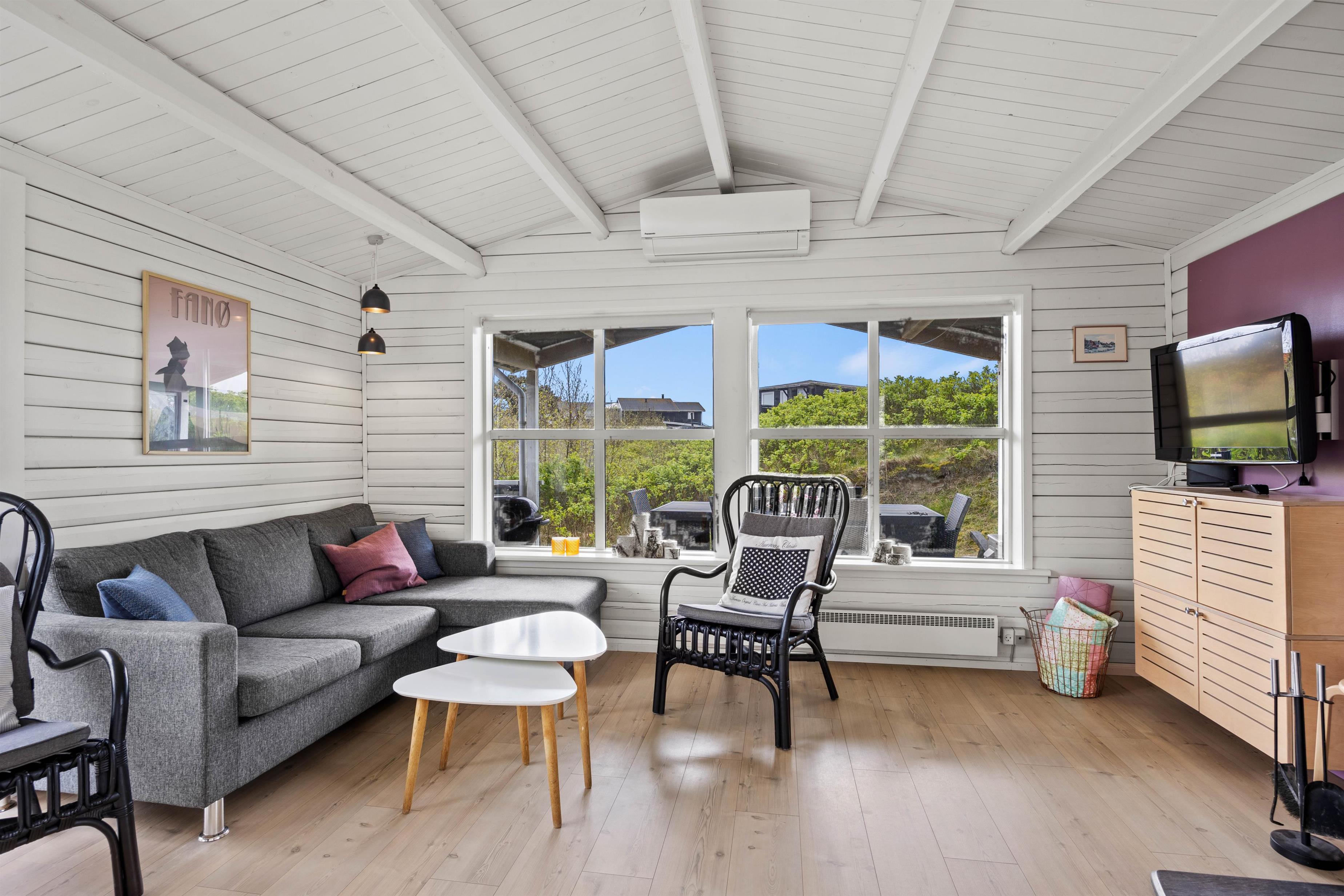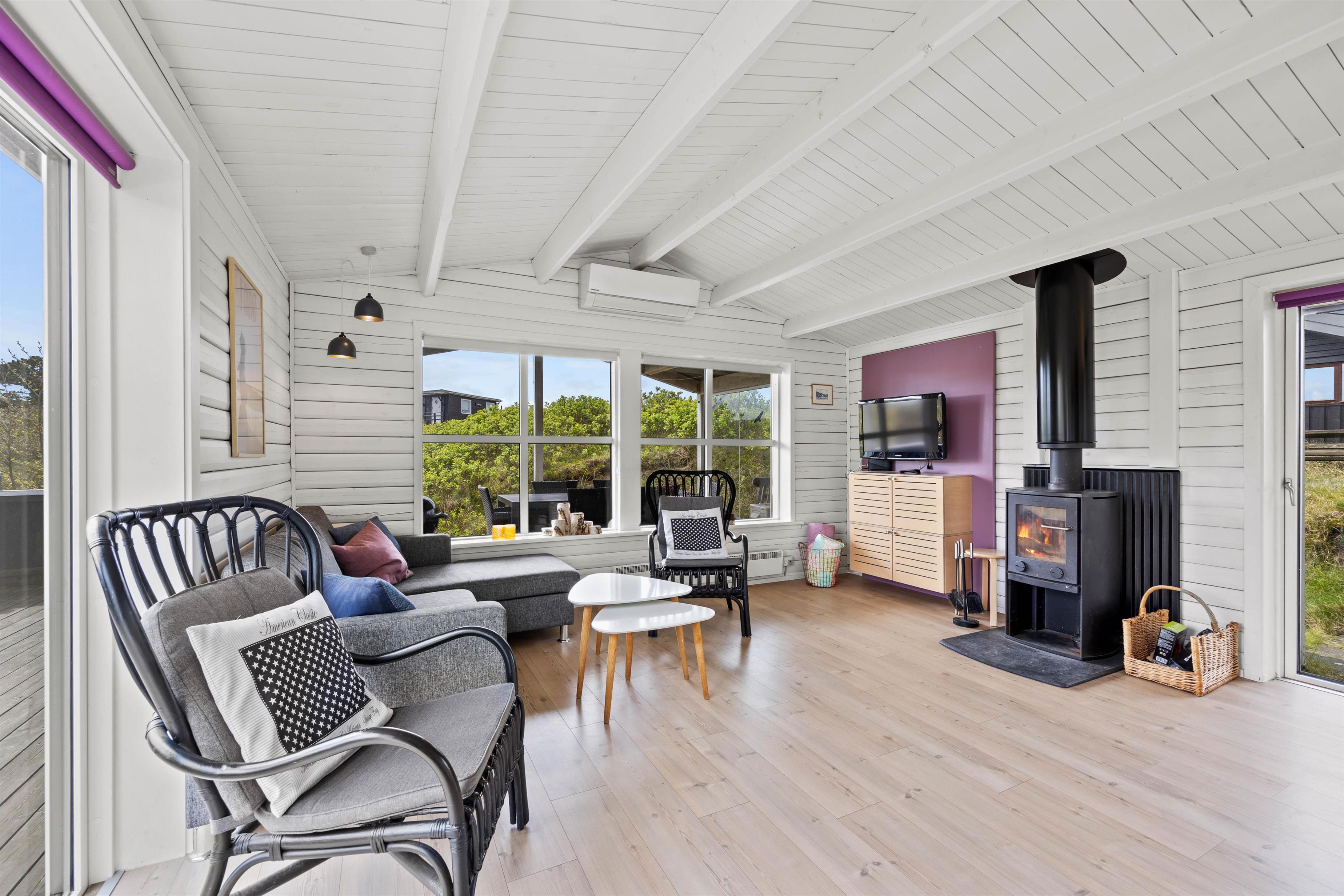 Det hyggelige feriehus på 70 kvadratmeter er funktionelt indrettet og det perfekte sted at slappe af. Du finder alle de faciliteter, du har brug for til en dejlig vesterhavsferie. I opholds- og spisestuen giver de træbeklædte vægge i kombination med de store vinduer og det lyse trægulv en dejlig feriestemning. Her kan I slappe af i sofaen eller spille spil ved spisebordet imens alle hygger sig på en uforglemmelig ferie. Brændeovnen giver en dejlig varme og en hyggelig aftenstemning.