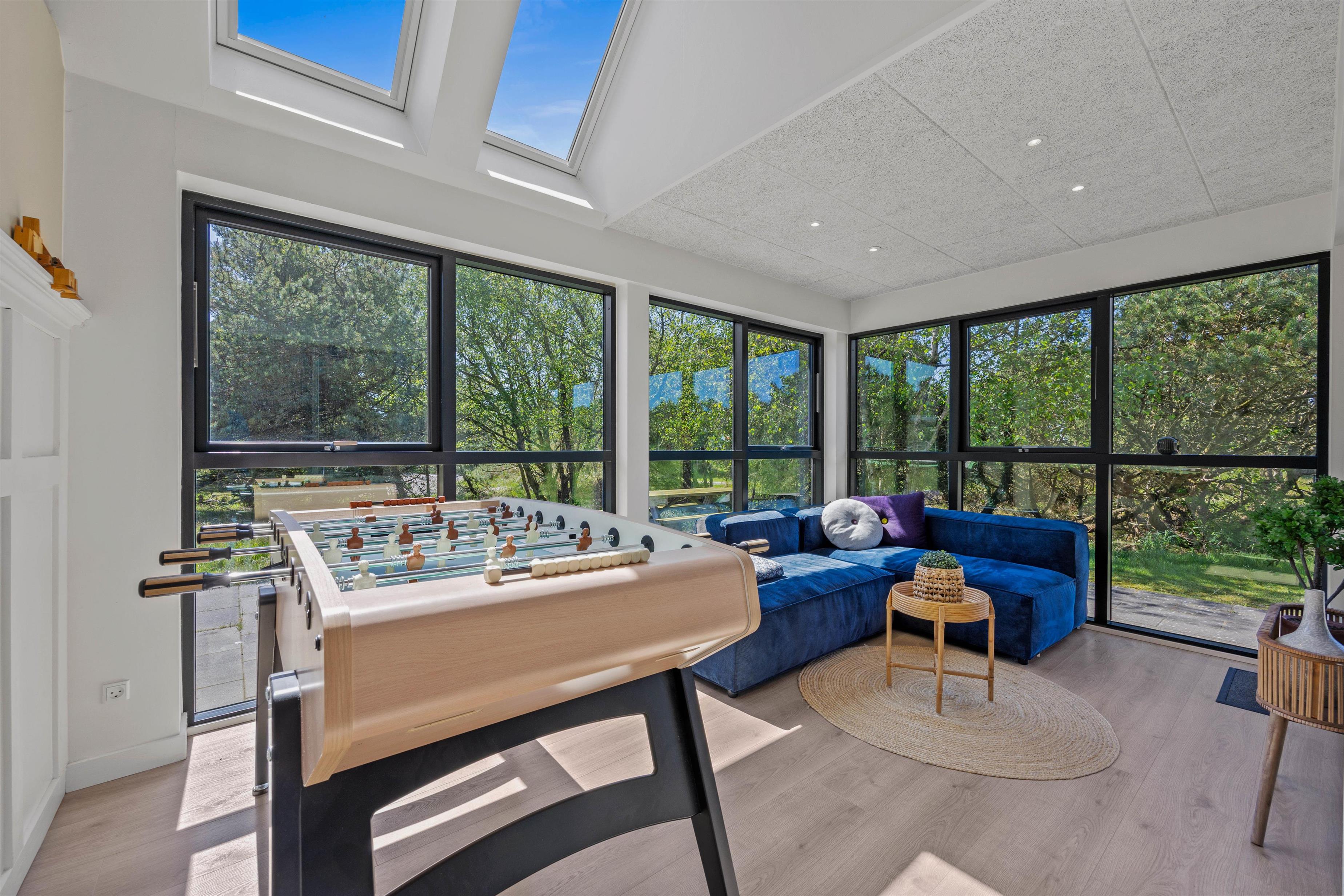 Fra opholdsrummet har I udgang til en lille overdækket terrasse, og herfra kan I let tilgå den skønne udestue. Udestuen forlænger sommerhalvåret, og her kan I sammen nyde forårsdagene og finde feriens bedste bordfodboldspiller.