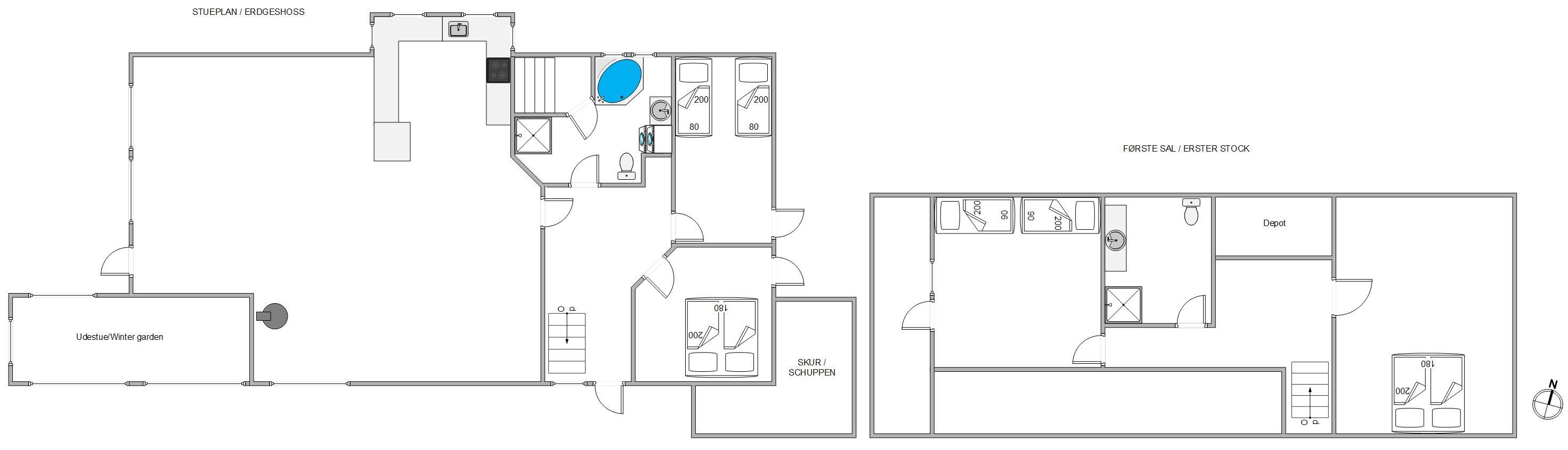 Her er 4 fine soveværelser – 2 i stueetage og 2 på førstesalen. Begge er indrettet med komfortable senge, hvor I kan lade op. Ligeledes finder I på begge etager et badeværelse med brus og gulvvarme. På det ene kan I komme helt ned i gear og nyde både sauna og spa. Mærk vandets varme bobler – perfekt efter en gåtur ved vandet. Praktisk er her også en vaskesøjle med vaskemaskine og tørretumbler, så I kan få friske håndklæder.