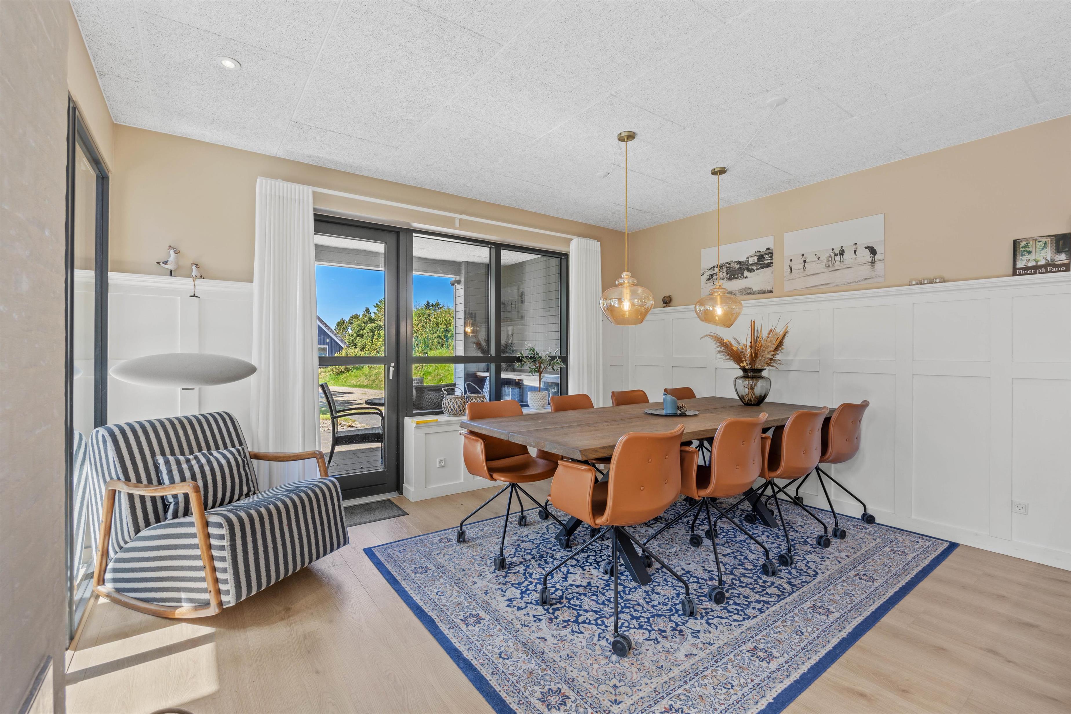 Her kan 6 personer føle sig hjemme på de 168 velindrettet kvadratmeter. Her er en gennemført stil og de smukke vægpaneler findes i de fleste rum. Overalt er der lyst, og dagslyset strømmer ind gennem de mange vinduer. Hjerterummet er det rummelige opholdsrum, hvor man har lyst til at tilbringe mange timer sammen - uanset, om I hygger jer sammen i sofaen, læser en god bog eller laver mad sammen, er der noget for alle her. På de køligere aftner fuldender brændeovnen den hyggelige feriestemning!
