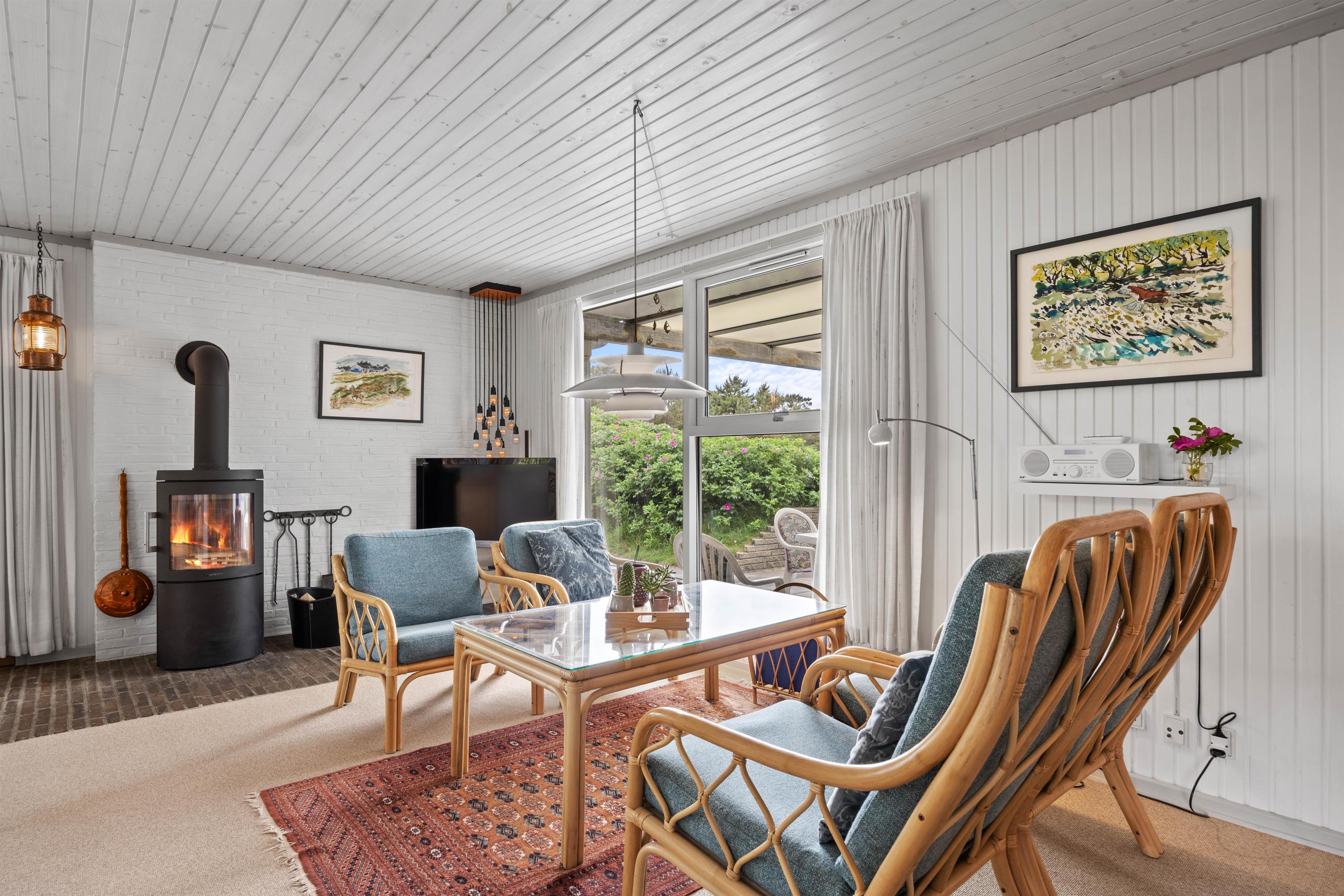 Man føler sig hjemme straks, man træder ind ad døren til Nybyvej 39. De lyse træbeklædte vægge og lofter og den farveafstemte møblering giver straks en dejlig feriestemning. Slap af i den hyggelige stue, hvor en varm brændeovn skaber en dejlig atmosfære til hygge og samtale. I det veludstyrede køkken er alt, hvad I behøver for at tilberede lækre måltider, herunder mikrobølgeovn og opvaskemaskine. Der er også vaskemaskine og tørretumbler i feriehuset, så I kan opfriske håndklæderne i løbet af ferien. Nyd den hyggelige udestue året rundt i, her kan I slappe af og nyde omgivelserne i al slags vejr.