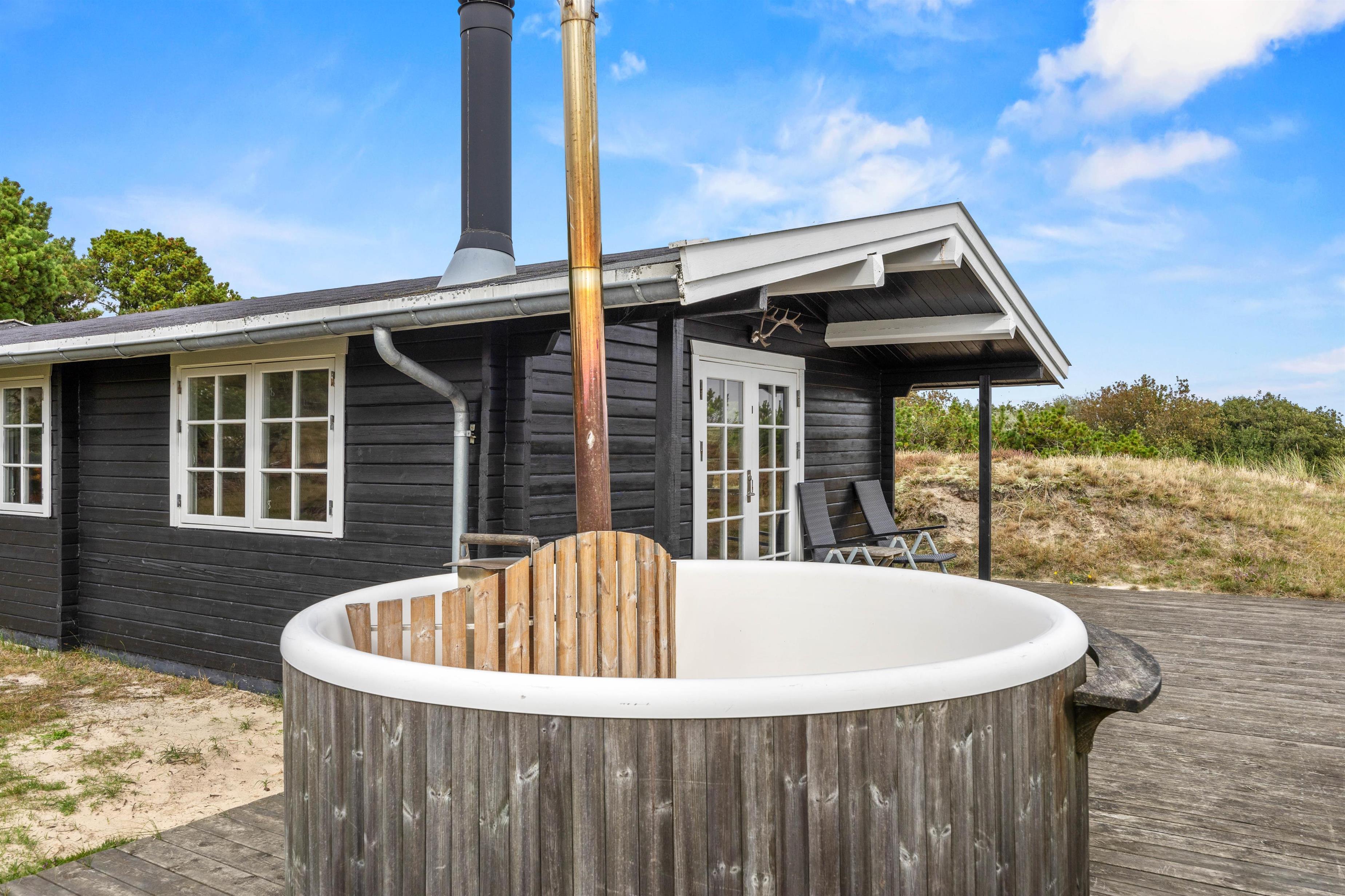 Til feriehuset hører en åben terrasse, der giver jer rig mulighed for afslappende timer i det fri. Start dagen med morgenmad i den friske vesterhavsluft, eller nyd de varme solstråler om eftermiddagen med en god bog i hånden. Et særligt højdepunkt efter en eventyrlig dag, er vildmarksbadet på terrassen. Her kan I slappe af og slutte aftenen af i behagelig varme – en uforglemmelig oplevelse i stjerneskær.