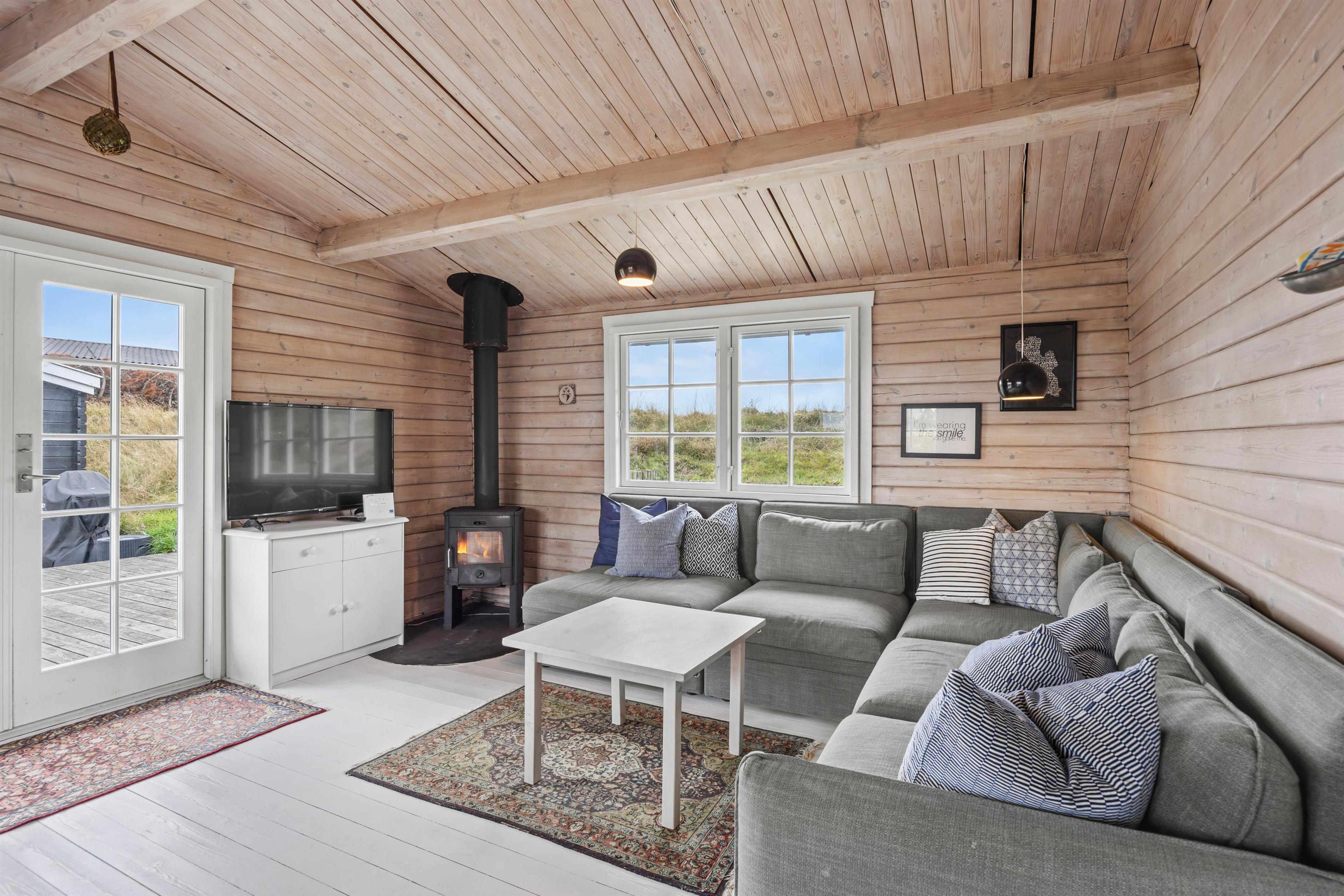 Indvendigt indbyder feriehuset med sin hyggelige atmosfære straks til afslapning. Den hyggelige stue er sommerhusets hjerte. Her sørger en brændeovn for behagelig varme på kølige dage og for ægte feriestemning, når I om aftenen gør det behageligt foran den knitrende ild. Køkkenet er praktisk og minimalistisk indrettet og har blandt andet en opvaskemaskine, så I ikke skal bruge tid på opvasken efter måltiderne. Der er også en vaskemaskine til rådighed, hvilket er ekstra praktisk ved længere ophold.