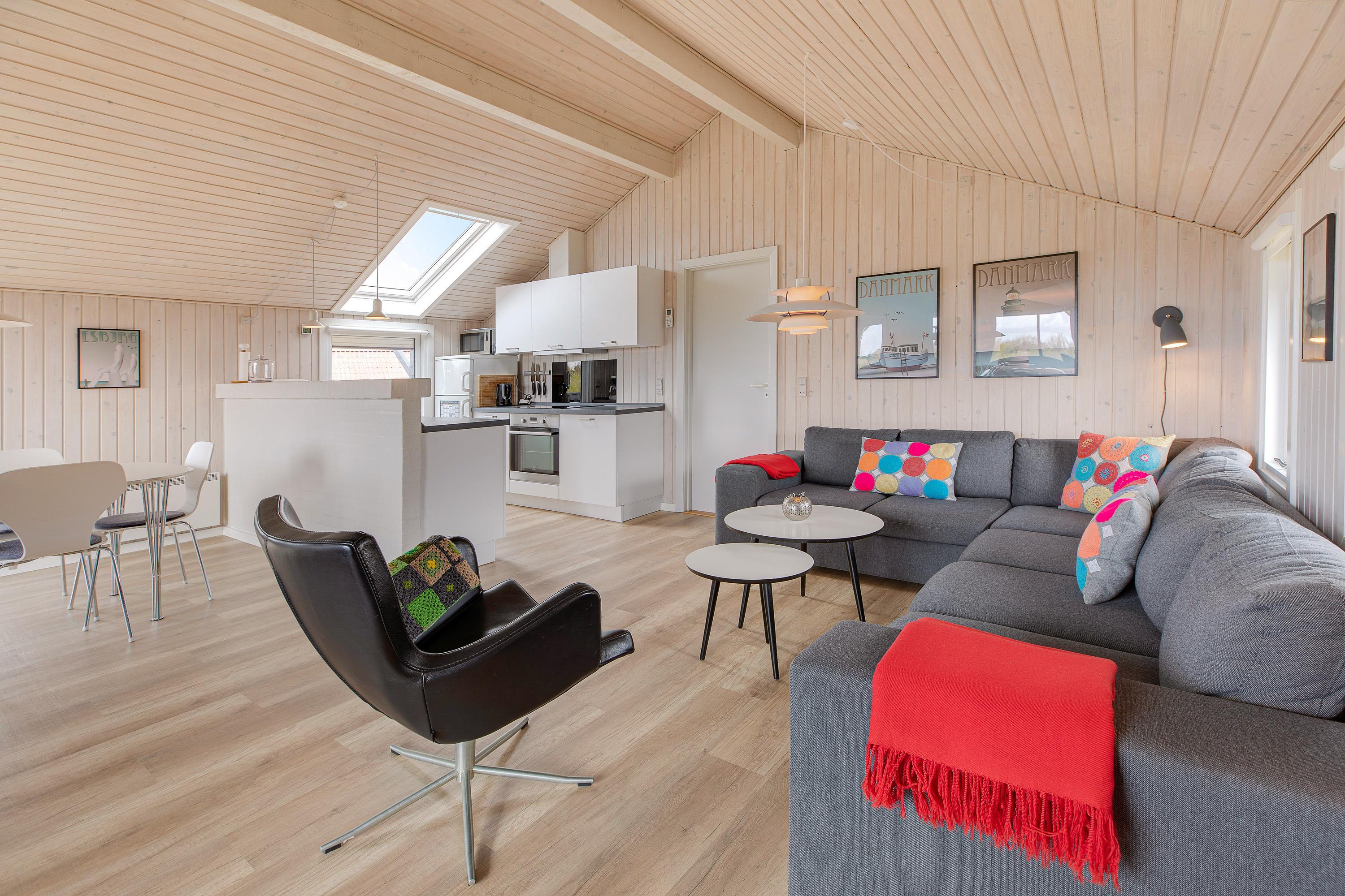 Jeres store samlingspunkt i feriehuset bliver uden tvivl alrummet, hvor der er åben forbindelse mellem køkken, stue og spiseplads. Her kan I både være sammen om at lave mad, spille sjove spil og se gode film – I kan streame jeres favoritfilm via Chromecasten. Alt imens fuldender brændeovnen feriestemningen med sine knitrende flammer i baggrunden.