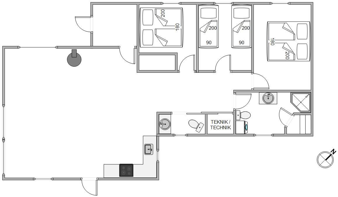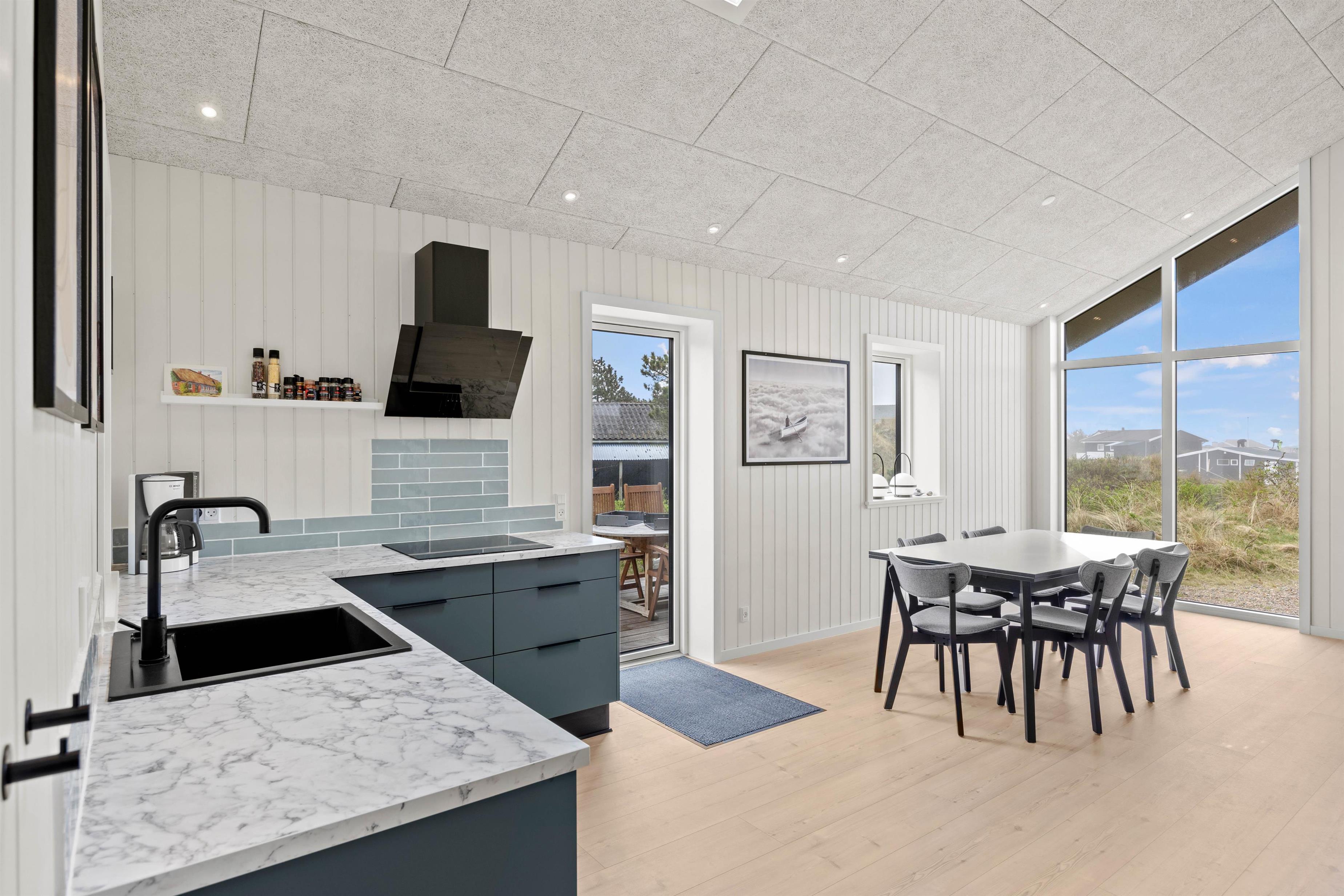Det åbne køkken er moderne og veludstyret – perfekt til de madglade sommerhusgæster. Her finder I både opvaskemaskine, mikroovn, køleskab med fryser og induktionskogeplade.