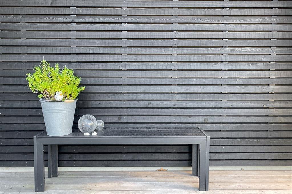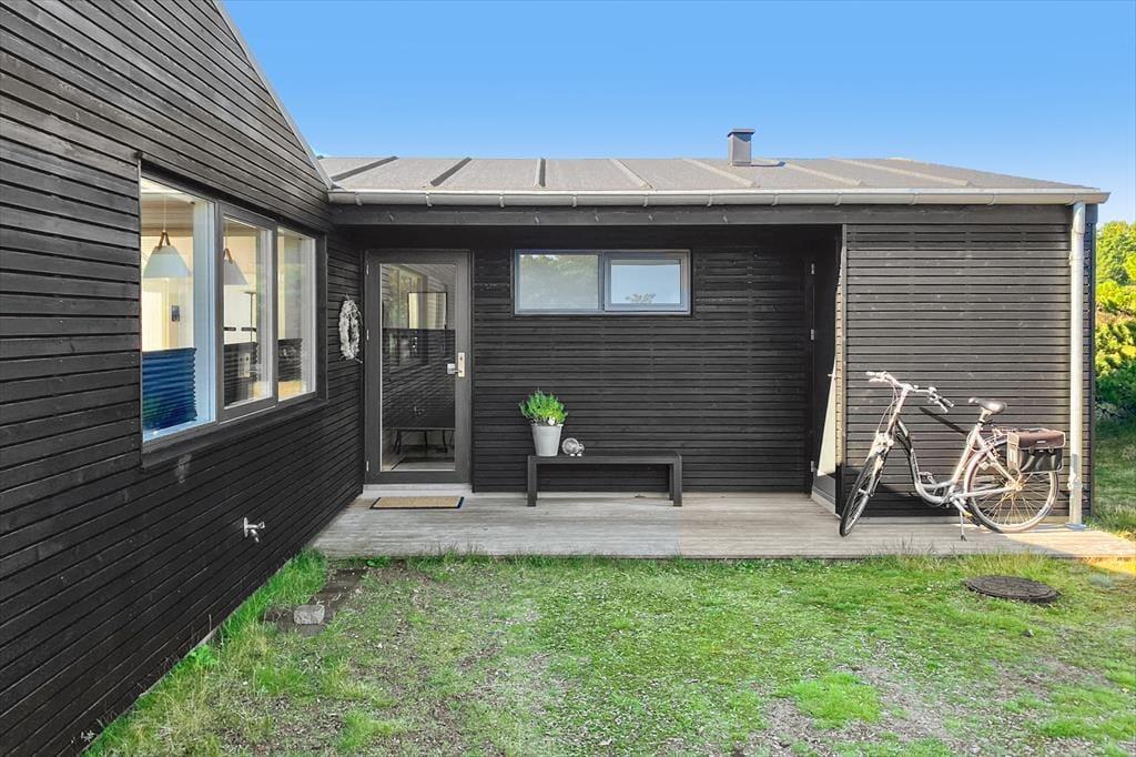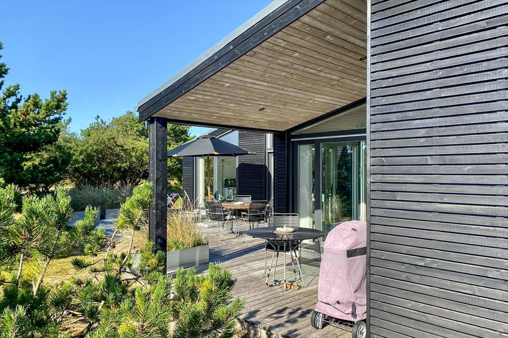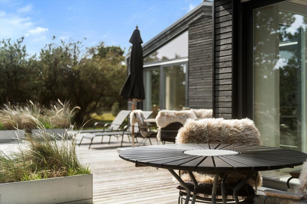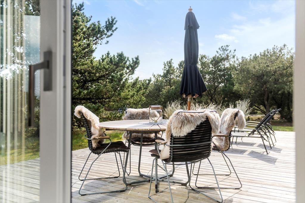 Fra stuen og to af soveværelserne har du direkte adgang til en stor træterrasse, der breder sig langs med huset mod syd og vest. En mindre del af opholdsarealet er overdækket, mens resten er helt åbent, og der er stort set garanti for at finde den helt rette siddeplads, hvor du kan nyde freden og det tilbagelænede ferieliv. En stor og smuk naturgrund breder sig rundt om huset, og det er nemt at føle sig i pagt med det på en gang viltre og smukke landskab – ikke mindst hvis du ser en fasan eller kanin komme på visit mellem grundens bevoksning.
