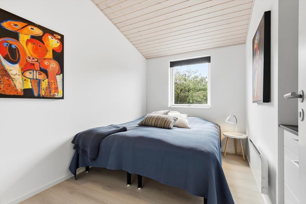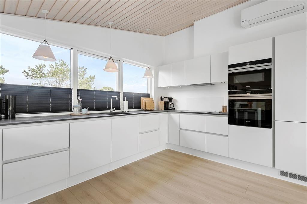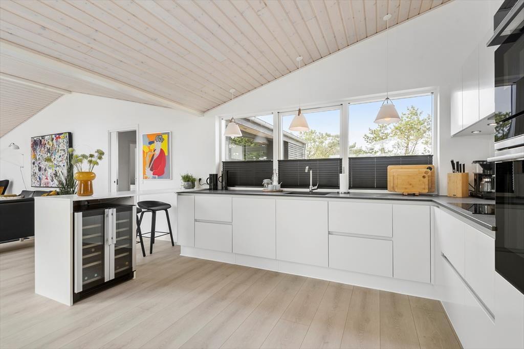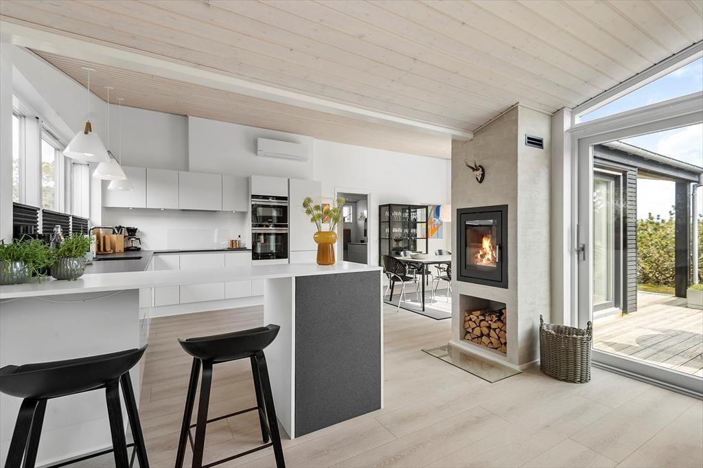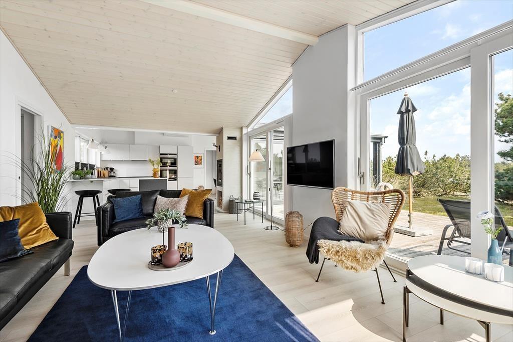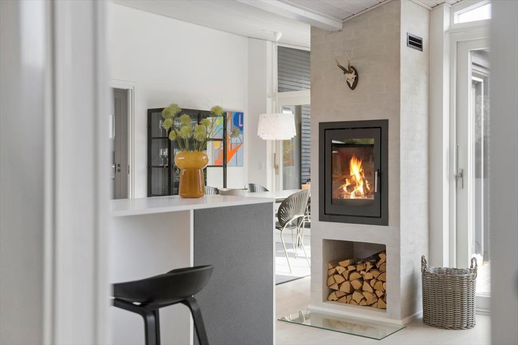 Det er en ren fornøjelse at opholde sig inden døre, lige fra du slår øjnene op på et af de tre soveværelser, og selv når du tager morgenbad på et af badeværelserne. Med kunst på væggene og moderne møblement er der altid noget skønt at fæstne blikket ved, og gennem vinduerne kan du ovenikøbet se ud på den grønne naturgrund. Det allerbedste sted at være er nu opholdsrummet, der ligger midt i sommerhuset som et naturligt samlingspunkt. Hvis du elsker at lave mad, kan du straks begynde at glæde dig til at kræse om feriens måltider i det åbne køkken – for eksempel når der er ild i indbygningspejsen, og din hjertenskær sidder på en af barstolene for at holde dig med selskab eller hjælpe til med snitteriet. Og uanset om du sidder i sofaafdelingen eller ved spisebordet, kan du nyde det smukke lys, der falder ind gennem rummets store glaspartier.