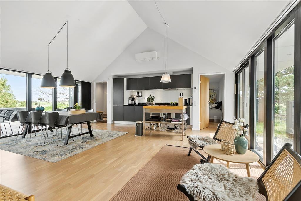 Hvis du elsker moderne arkitektur og smagfuldt design, vil du sikkert falde for det flotte feriehus, der er tegnet af Cebra Arkitekter. Med tre soveværelser og to badeværelser passer planløsningen godt til seks personer, og du får rig mulighed for at trække dig lidt tilbage – for eksempel kan du forkæle dig selv med et varmt karbad, hvis du trænger til en rolig stund. Feriens sociale stunder kan udspille sig i tv-stuen eller i det højloftede køkken-alrum, der byder på en hyggespredende brændeovn, store panoramavinduer. Er der rigtige madører og foodies i din familie, vil de sikkert blive vilde med at arbejde i det moderne køkken, der har hvidevarer fra Gaggenau og en skøn køkkenø. Og når maden snart står klar, kan I selvfølgelig selv bestemme, om I vil dække op ved spisebordet eller ude på en af terrasserne.