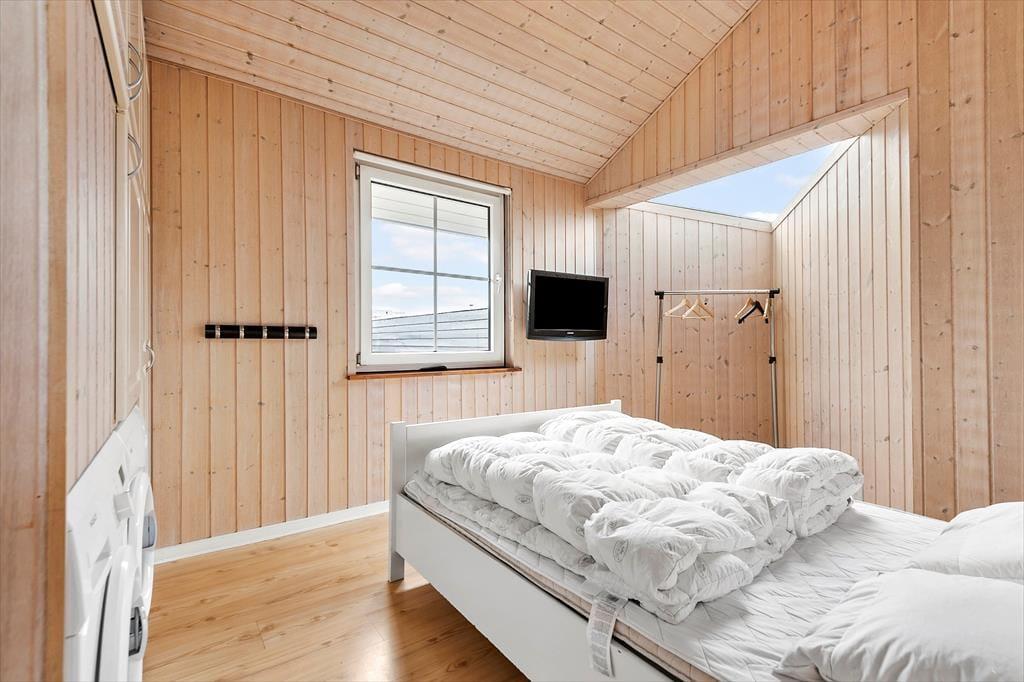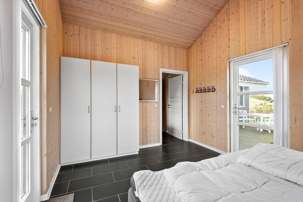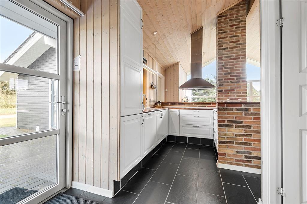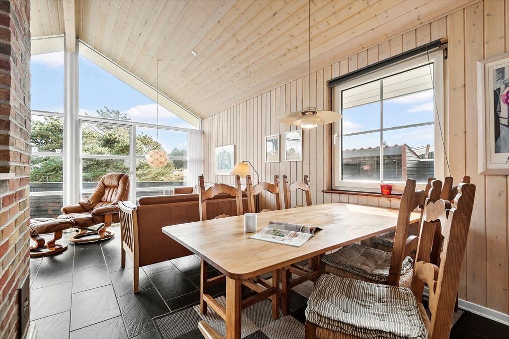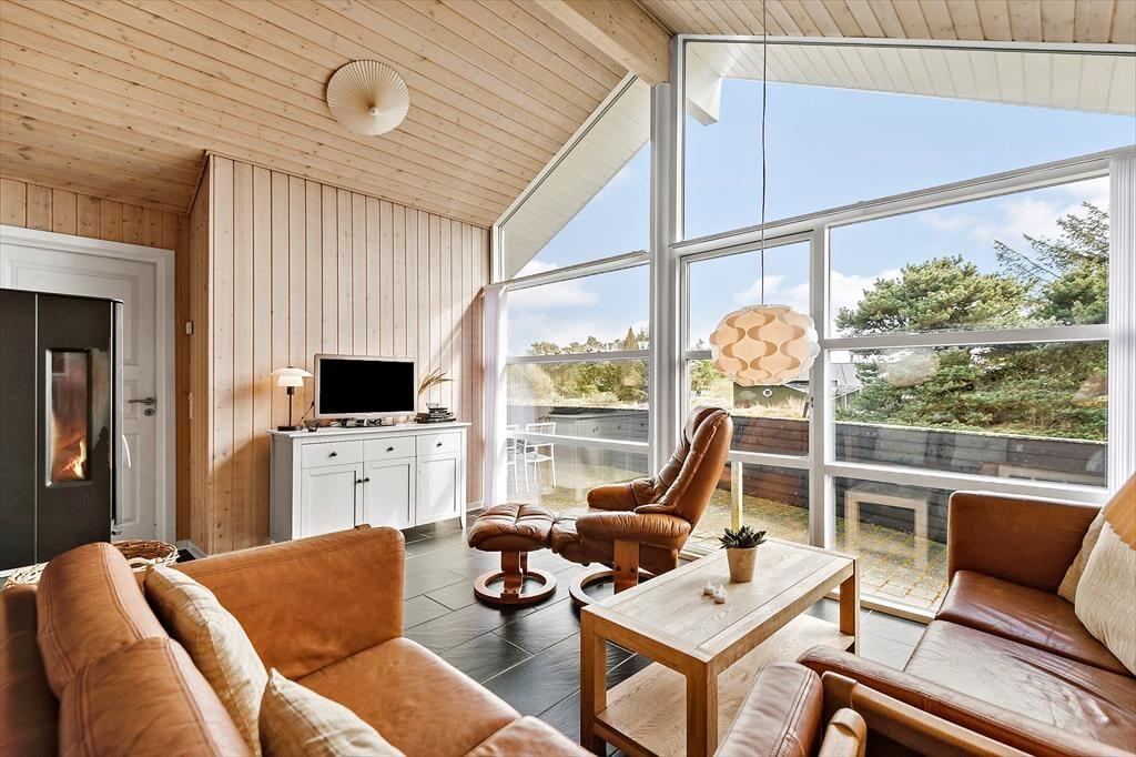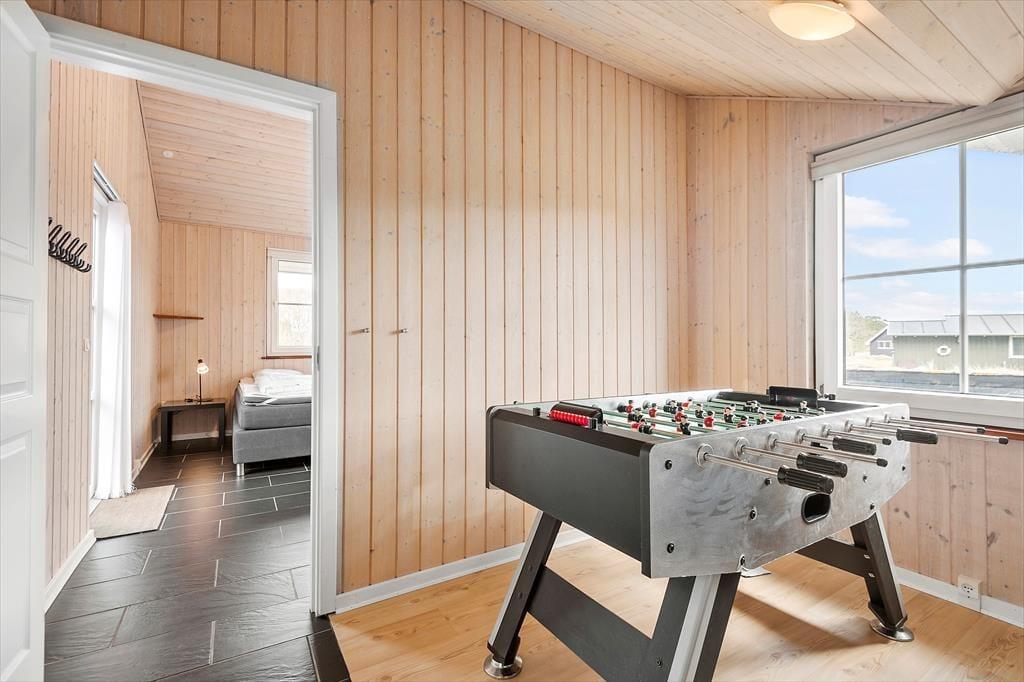 I ferieboligens stue går et kæmpe vinduesparti fra gulv til loft i gavlen, så selv på en kølig efterårsdag kan du blive badet i sol og nyde det naturskønne sommerhusområde fra sofaen eller lænestolen. Du kan endda tænde op i den væghængte brændeovn og lade varmen sprede sig – og hvis vejret er alt for sommerligt til det, kan du i stedet åbne havedøren op og smutte direkte ud på terrassen. Uanset årstiden har du gode arbejdsforhold, når du vil lave mad i det åbne og moderne indrettede køkken, og bordfodboldbordet skal nok vække glæde i familien blandt både store og små.