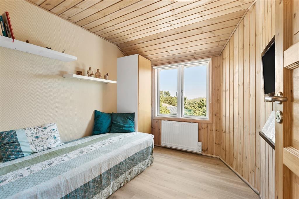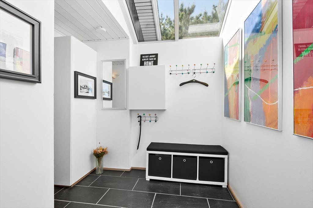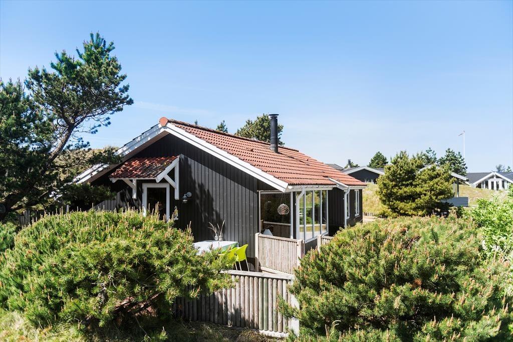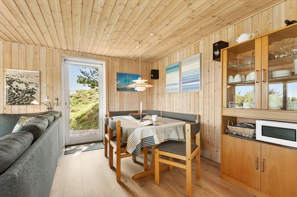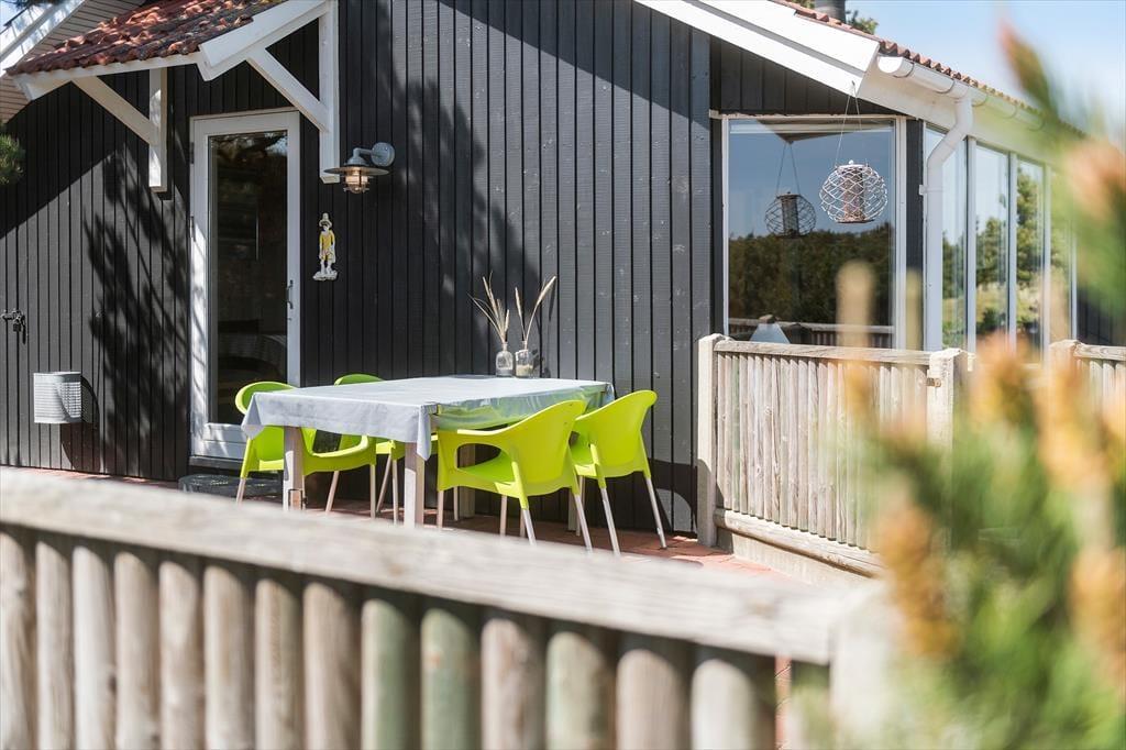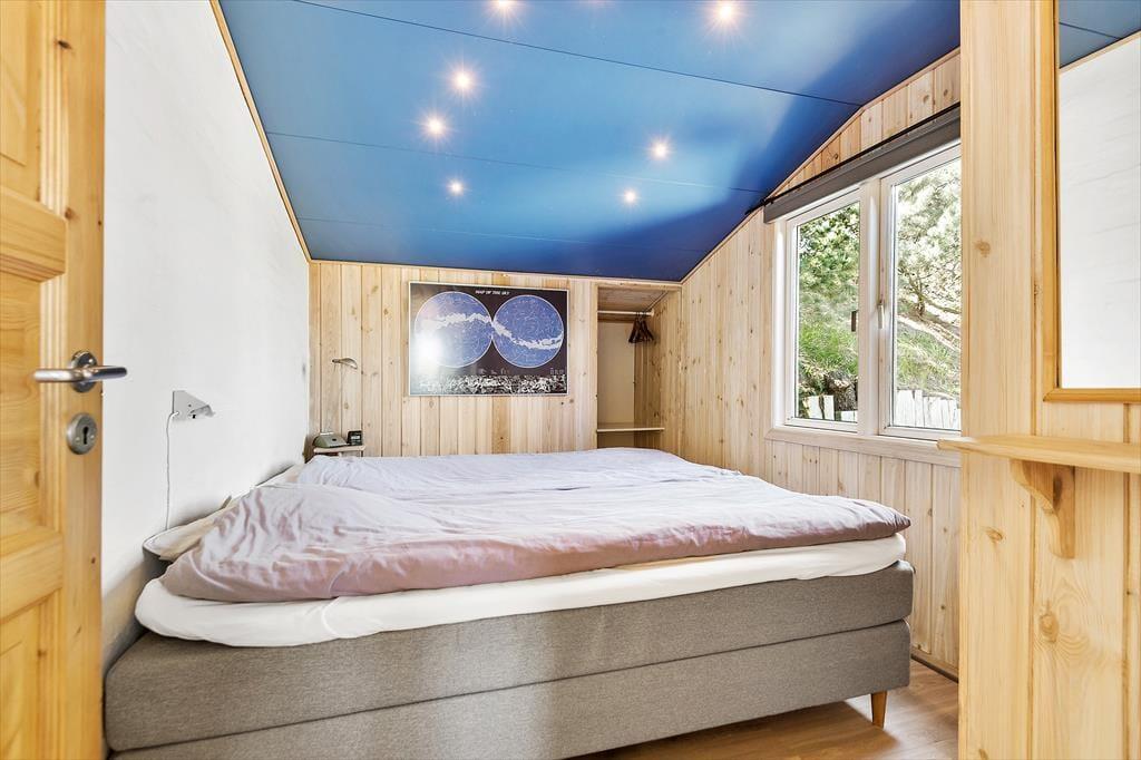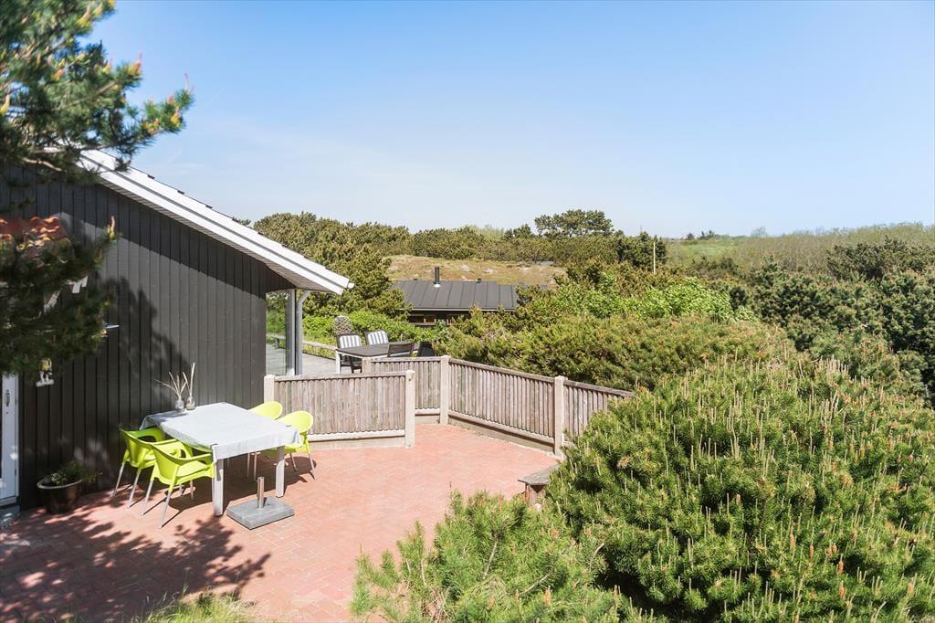Når vejret er lunt og sommerligt, er det oplagt at flytte feriehyggen ud i det fri på den 2400 m2 store naturgrund. Rundt om sommerhuset er der flere gode terrasser at vælge imellem, så der er gode chancer for at finde både sol og læ i de ugenerede omgivelser. Hvis du sætter dig på det træklædte terrassedæk på den nordøstlige side af huset, kan du se langt ud over områdets hybenbuske og nyde synet af de drivende skyformationer højt på himlen. Det er en glimrende udsigt at have, når du sidder der med morgenkaffen og nyder freden på den lille, lukkede sidevej.