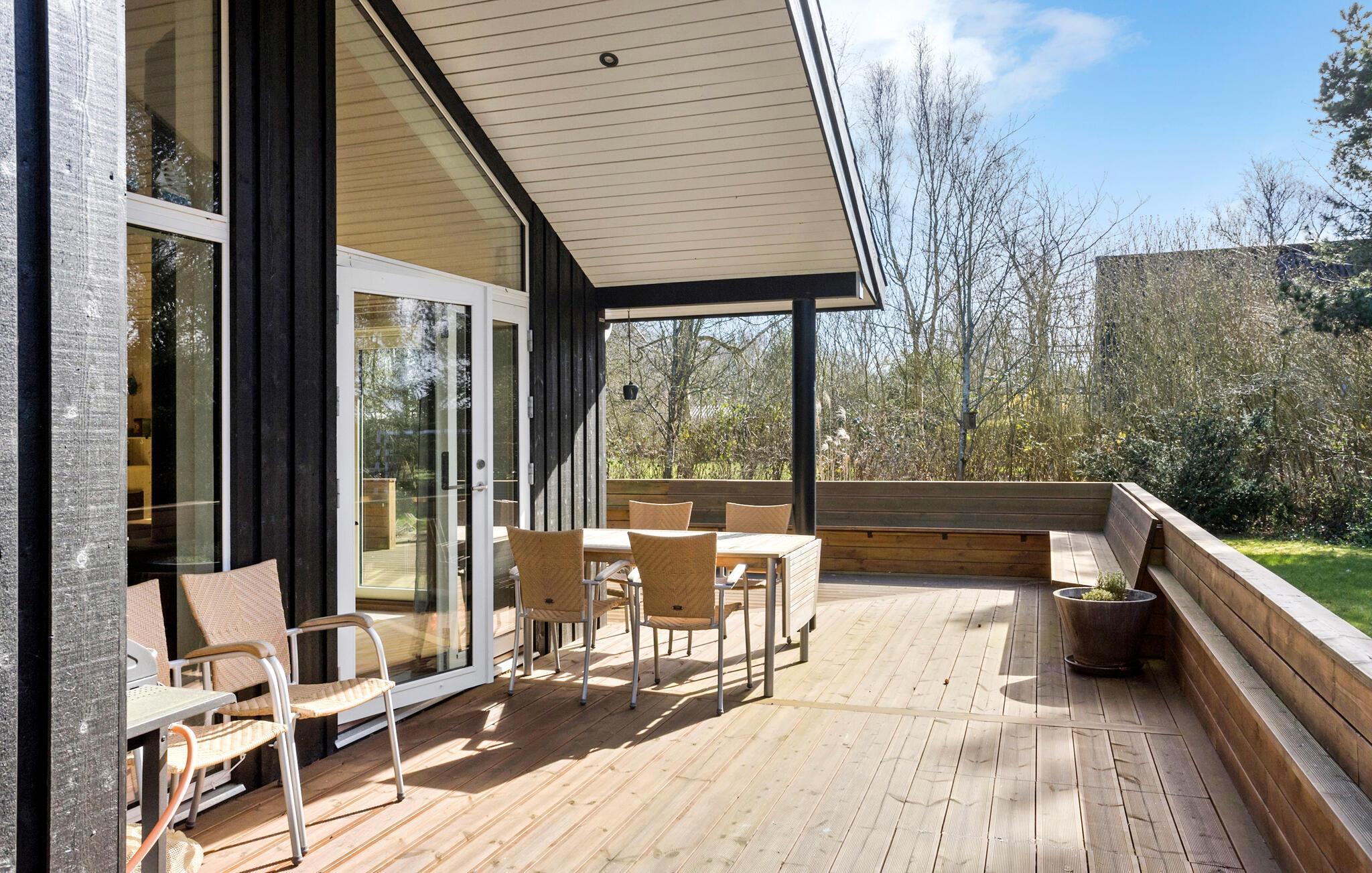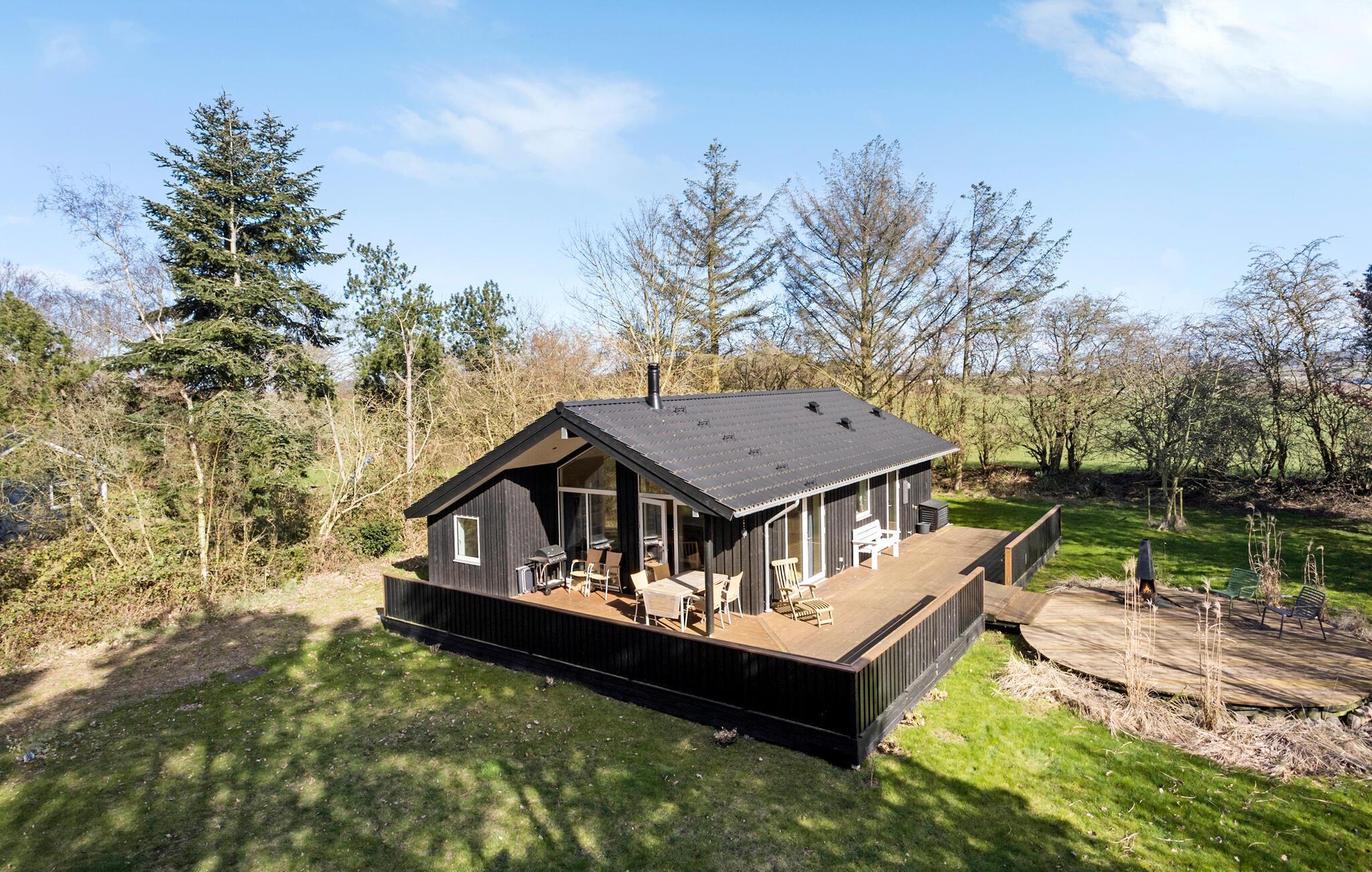 Dejligt træhus på Langeland med store vinduer, brændeovn og stor terrasse nær Ristinge og Hesselbjerg.
