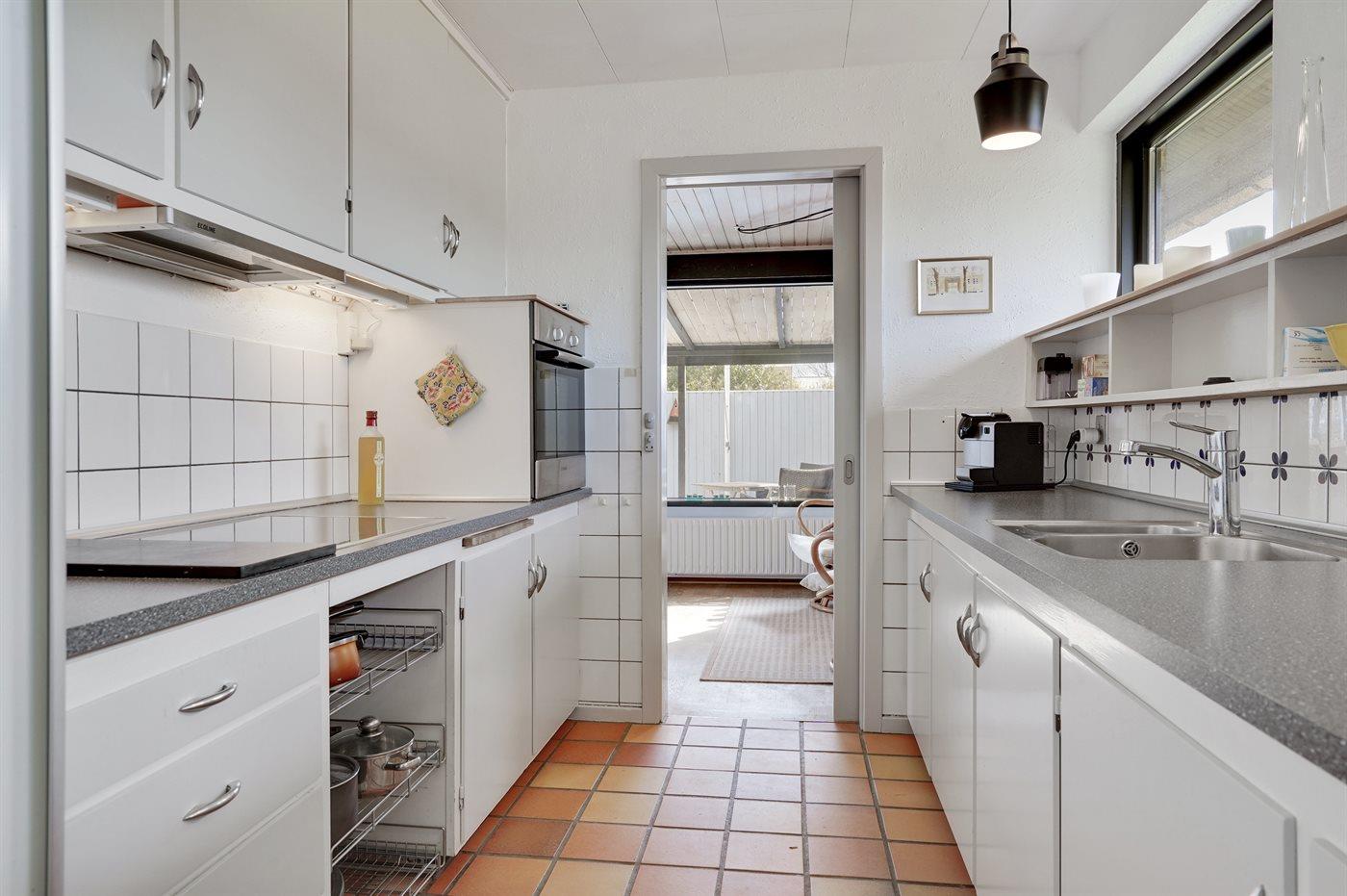 Køkkenet er udstyret med 1 køleskab. Der er 4 induktionskogeplader, varmluftovn samt opvaskemaskine.