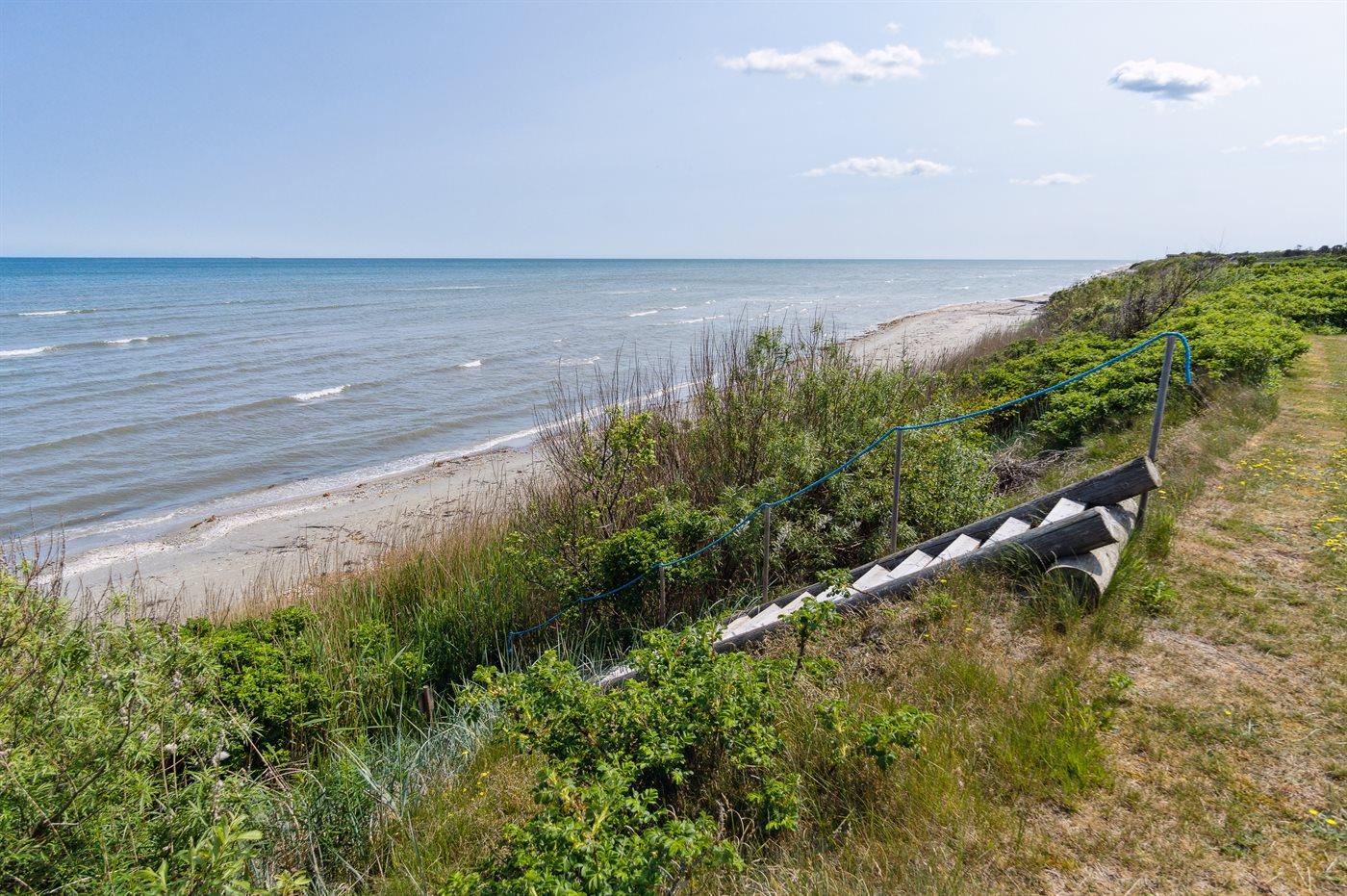 Der er kun ca. 50 meter til havet og til den gode badestrand med ganske fint sand, som nås via en trappe for enden af grunden - en mere unik placering ud til denne smukke kyststrækning er svær at finde.