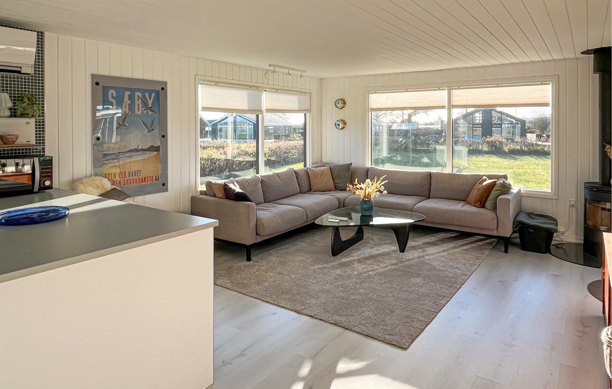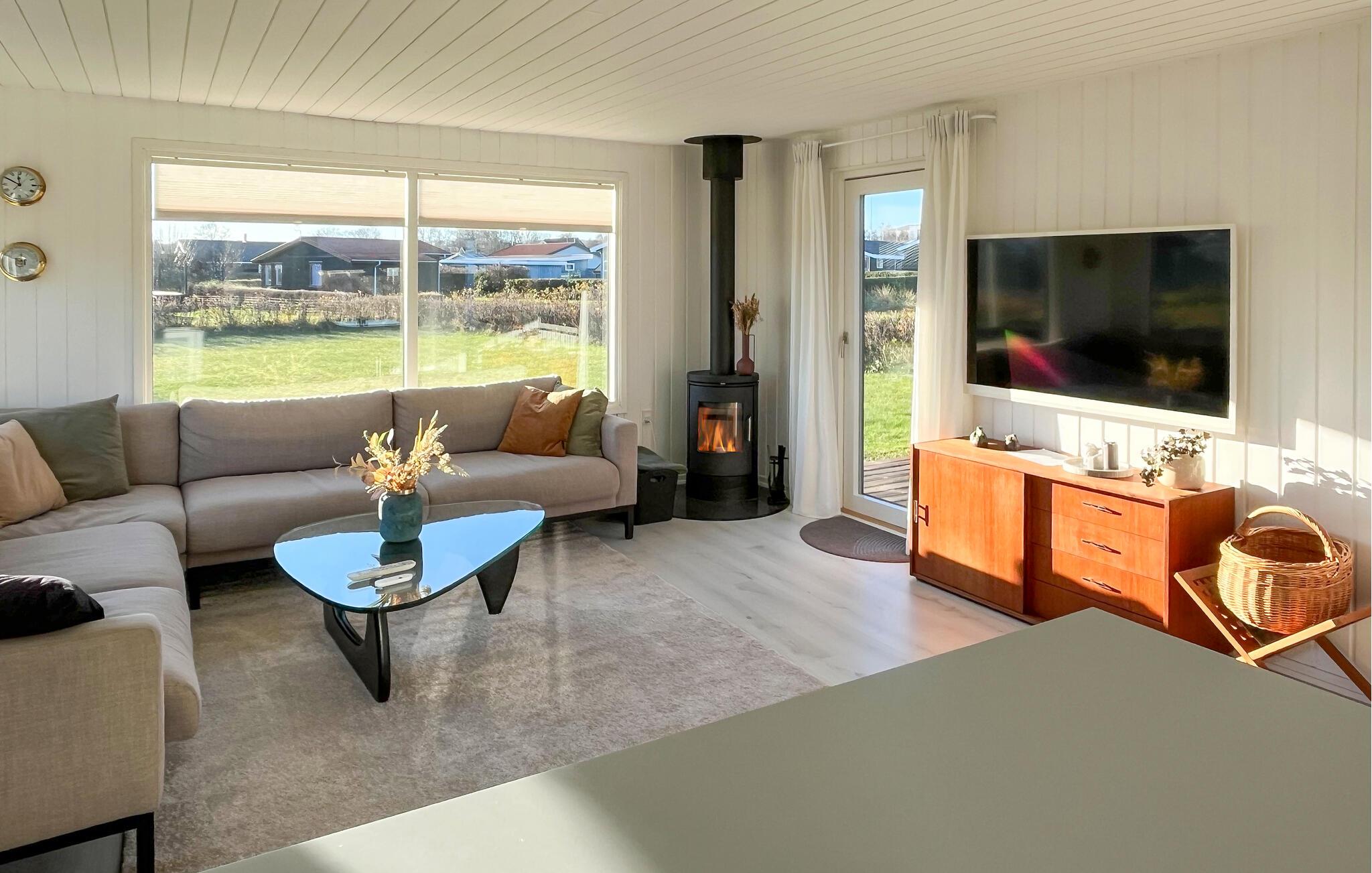 Hyggeligt feriehus i Sæby med panoramaudsigt over vand og bålplads til afslappende stunder.