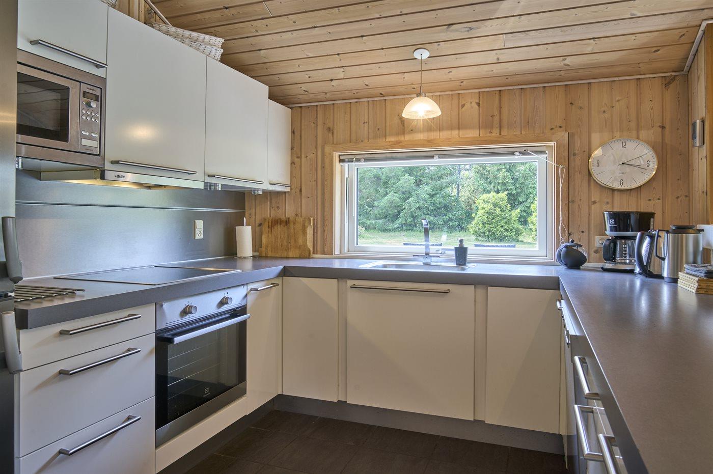 Køkkenet er udstyret med 1 køleskab. Der er 4 keramiske kogeplader, varmluftovn, mikrobølgeovn samt opvaskemaskine Der er gulvvarme i køkkenet.