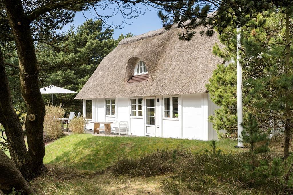 Det stråtækte sommerhus er gennem årene blevet renoveret løbende, og hele vejen igennem har der været øje for at bevare husets sjæl og charme. Derfor er der eksempelvis stadig synlige loftsbjælker i den stemningsfulde stue – samtidig med at rummet er moderniseret med varmepumpe, en veludstyret køkkenafdeling og pænt møblement. Når I slapper af i sofaen nær brændeovnen, kan I nyde udsigten til haven, og måske ser I endda et rådyr eller en fasan, der kommer trippende forbi i det grønne. I stueplan hører et soveværelse og et badeværelse også med til planløsningen, mens førstesalen byder på yderligere to soveværelser og et toilet.