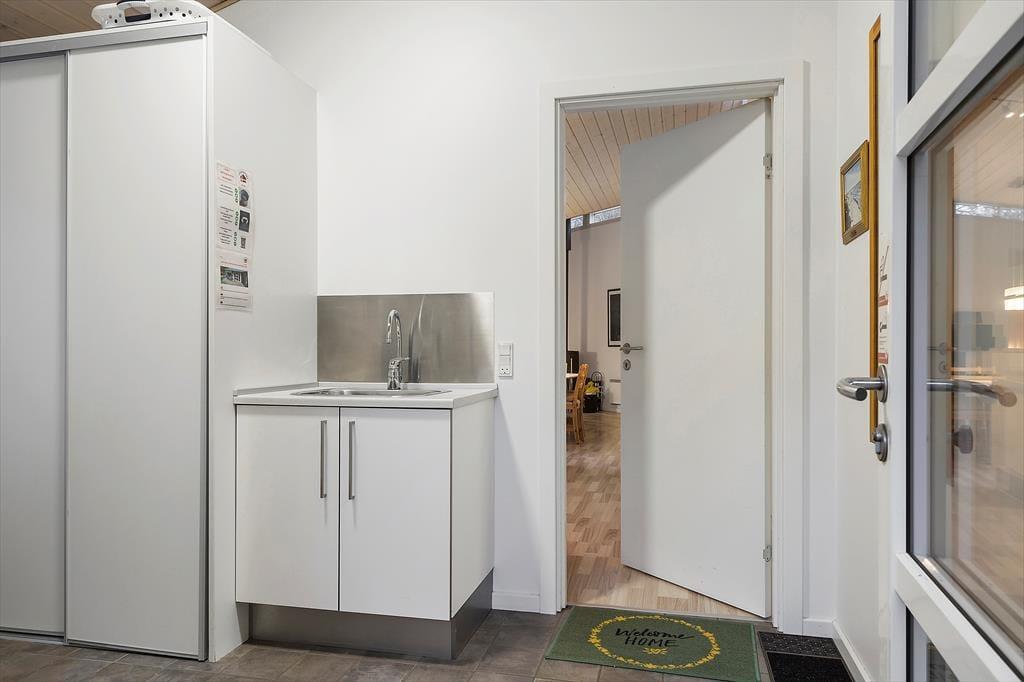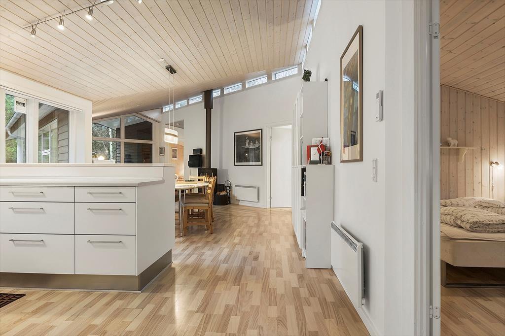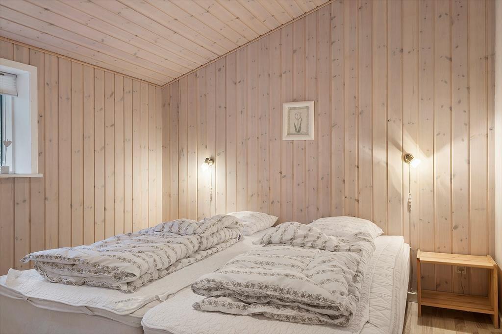 I sommerhuset, der er opført i 2009, kan du brede dig på hele 130 m², og indretningen er lys og indbydende. Planløsningen byder på to badeværelser og fire soveværelser, som alle er udstyret med komfortable dobbeltsenge og garderobeskabe, så selv sidstevælgerne kan se frem til at sove godt. På det ene badeværelse er der skruet ekstra op for luksusfornemmelsen, for her er der nemlig badekar og sauna, mens de praktiske hensyn er taget i entréen, som har vaskemaskine og tørretumbler samt god plads til sko og overtøj. Køkken og stue ligger i åben forbindelse, og det er et dejligt stort opholdsrum, så I alle kan samles – uanset om det er tid til at lave mad, spille brætspil ved spisebordet eller slappe af i sofaen med yndlingsserien i tv og ild i brændeovnen.
