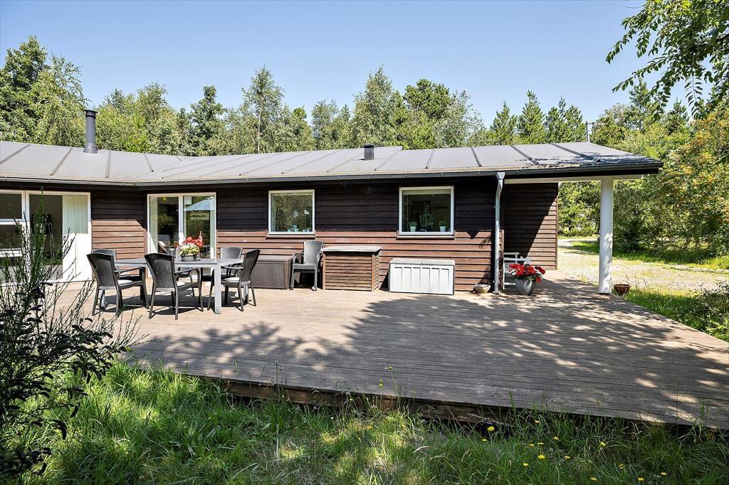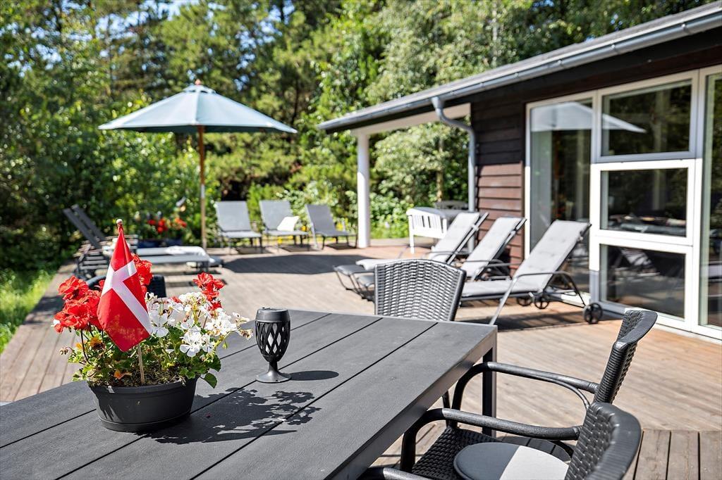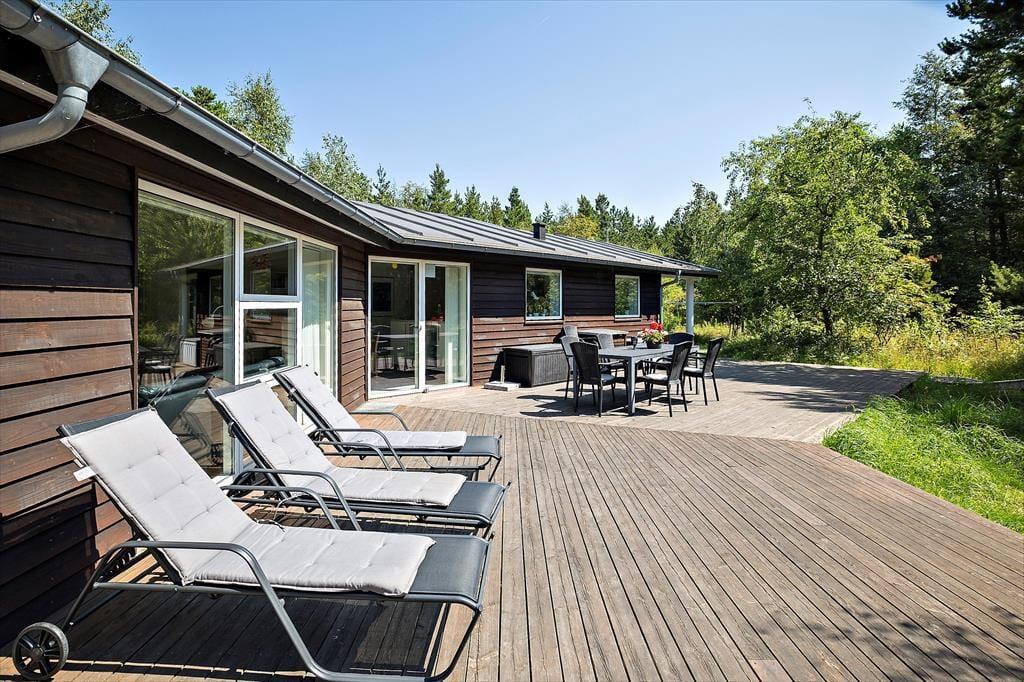 Syd for sommerhuset ligger en stor og åben terrasse, og det er den oplagte siddeplads, når du vil sole dig, grille og nyde udsigten til naturgrundens grønne træer. Der er også et overdækket areal, hvis der skulle komme en byge forbi, men du ikke har lyst til at trække helt indenfor. En lille sandkasse står klar til børnene, og hvis du kommer i elbil, er der mulighed for at oplade den.