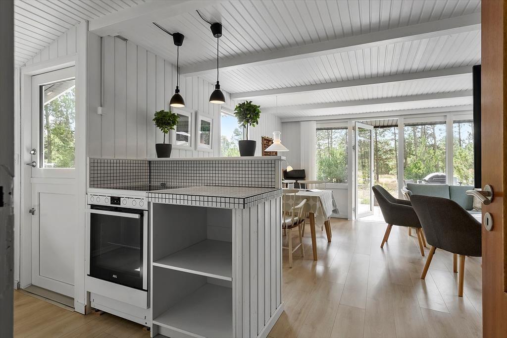 Drømmer du om et hyggeligt sommerhus, hvor naturen er lige udenfor døren, og hvor lyset strømmer ind gennem panoramavinduer? Dette nyligt renoverede sommerhus på Dværgternen ved Sønderstrand inviterer dig indenfor i et lyst og venligt hjem, der kombinerer moderne komfort med den autentiske ø-stemning. De hvide trævægge og loftet giver rummet en let og frisk atmosfære, mens det lyse eg gulv og de lyse farver skaber en varm og indbydende stemning. Her er god plads til hygge i stuen med brændeovn, hvor du nemt kan slappe af efter en dag på stranden eller i naturen. De to gode værelser tilbyder komfortable sovepladser med mulighed for at ændre sengenes konfiguration, og der er plads til en ekstra barneseng i det ene værelse. Det nyrenoverede badeværelse i sandfarvede fliser med gulvvarme, stort bruserum og vaskemaskine byder på både funktionalitet og komfort. Det komplette køkken er bl.a. udstyret med glaskeramisk komfur og mikroovn. Gratis Wi-Fi og Internet TV gør underholdningen nem at få adgang til.