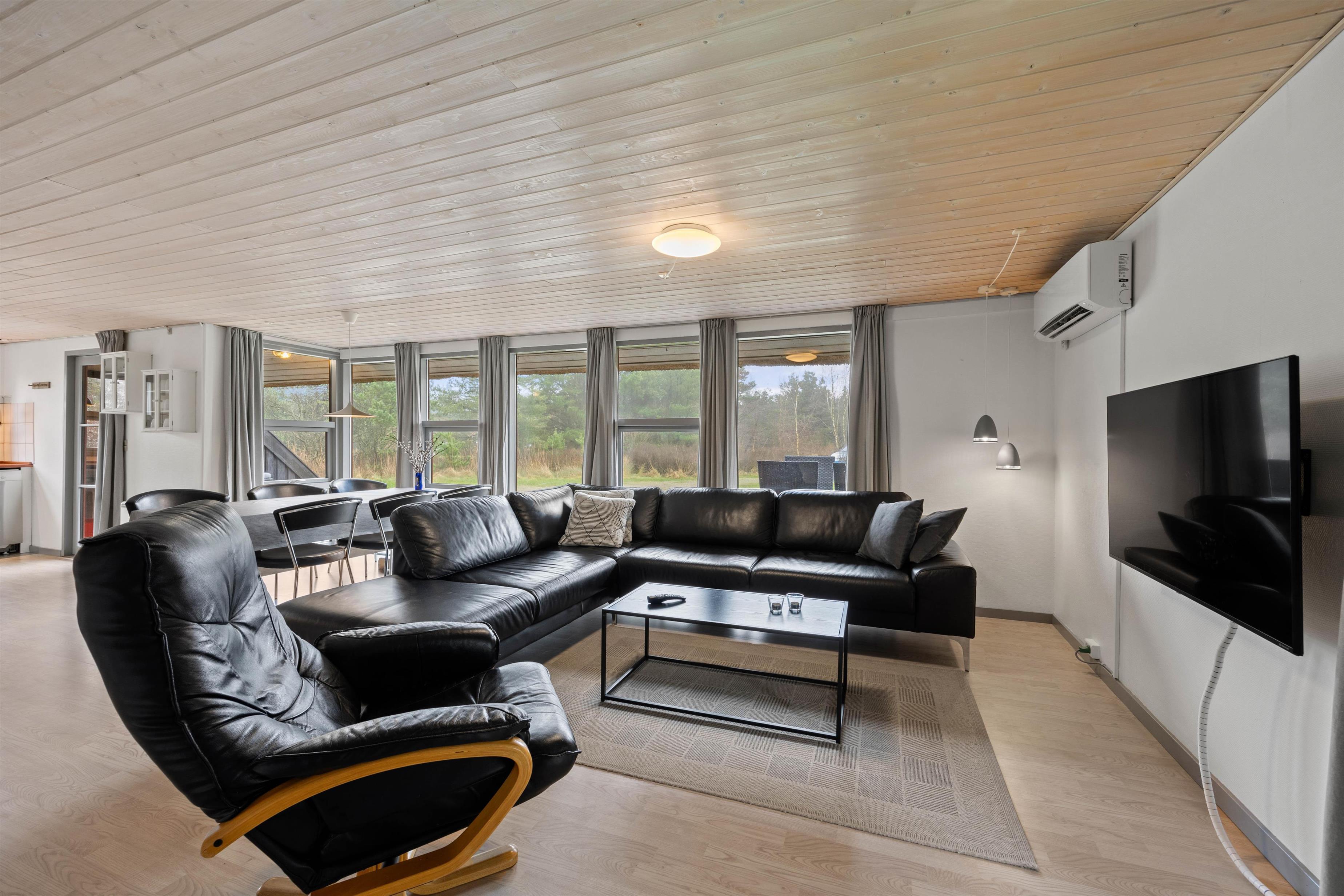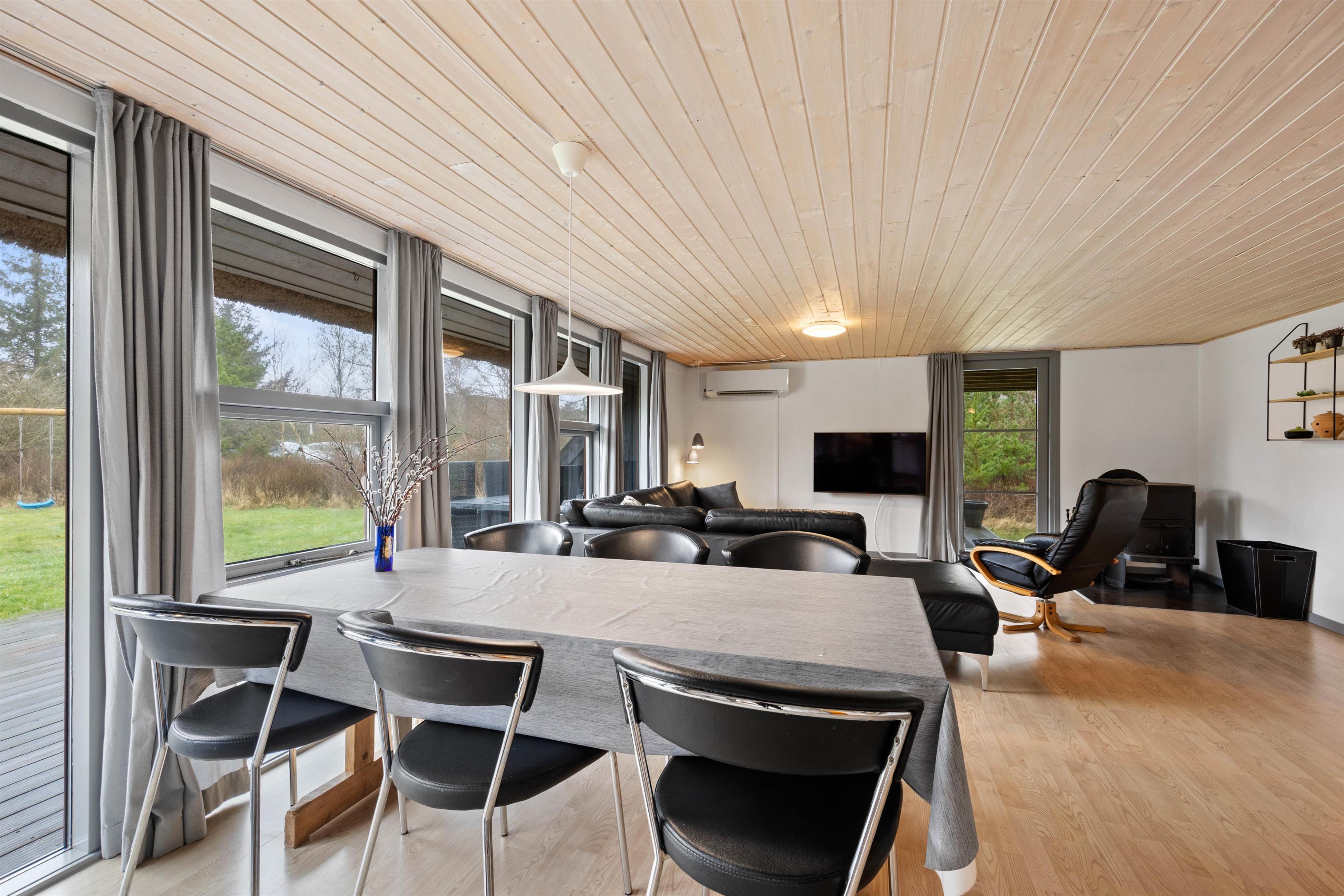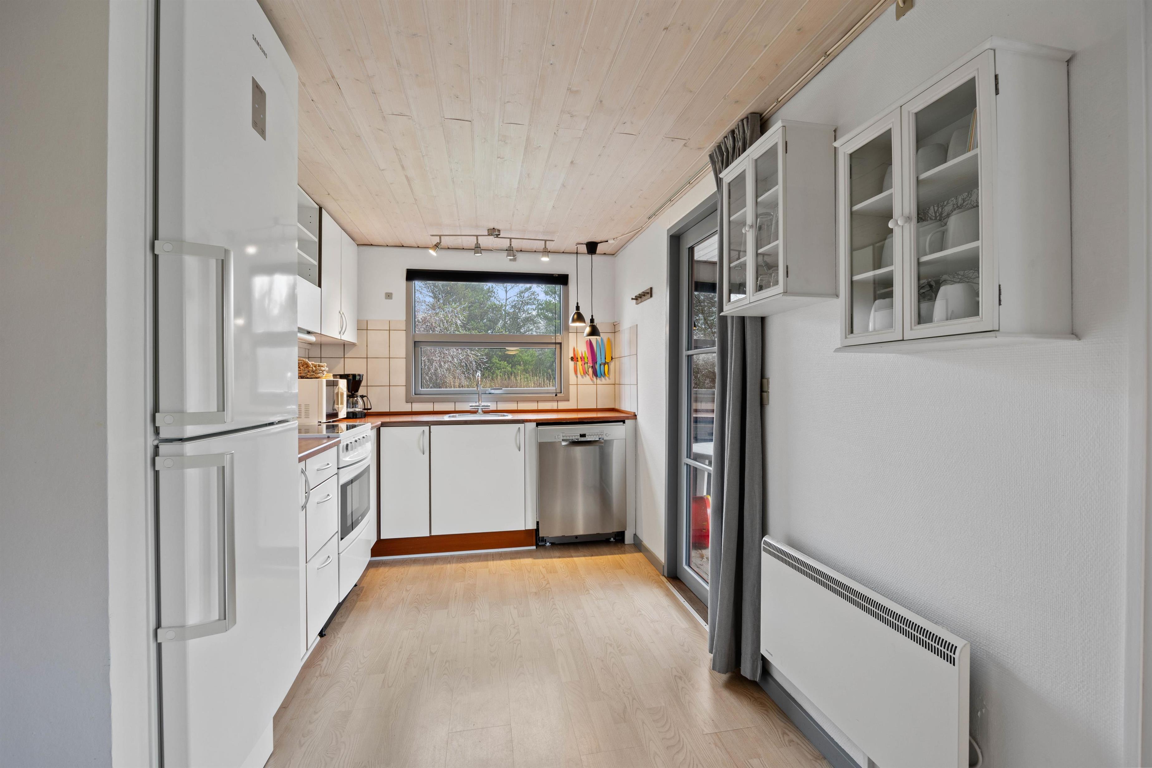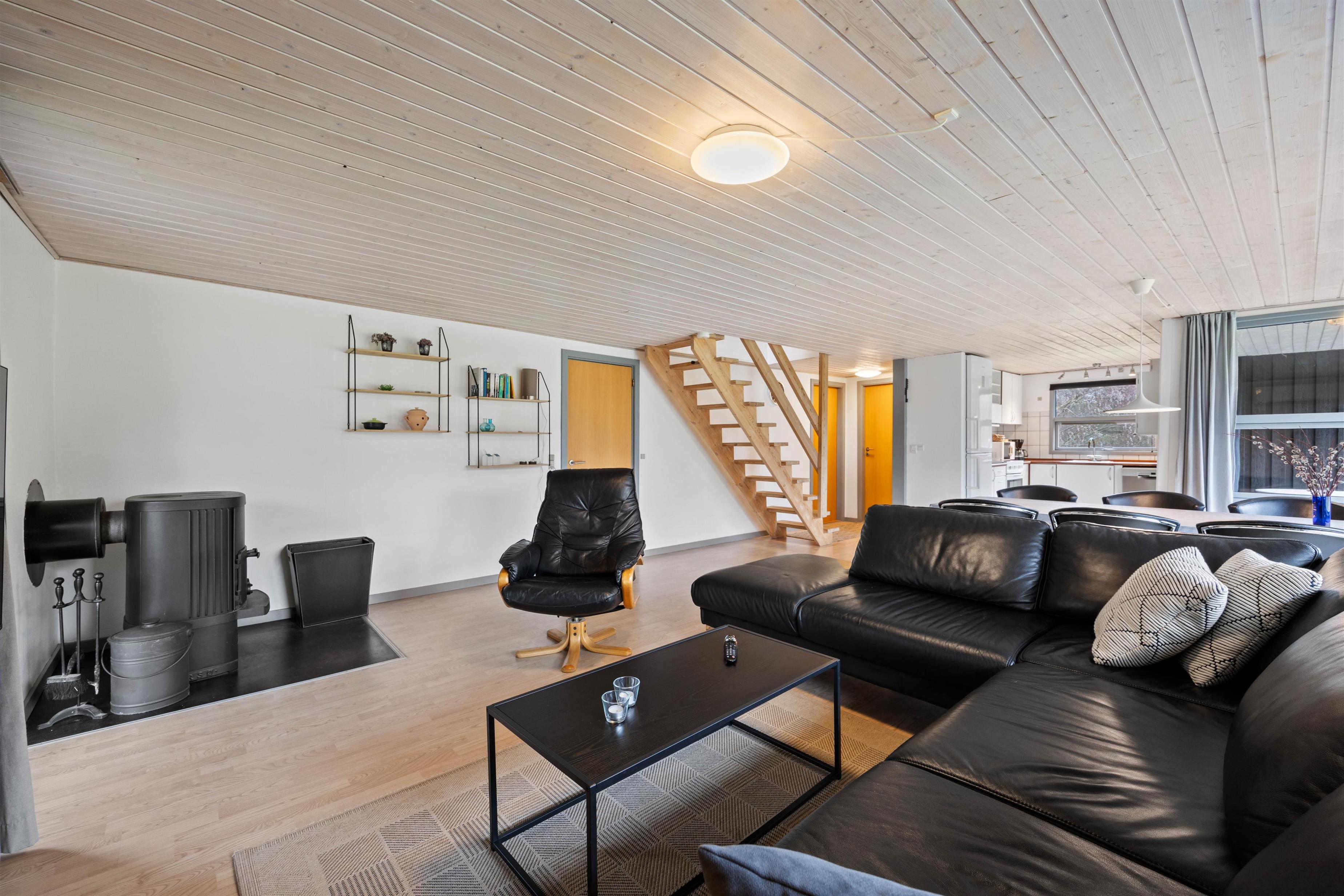 I stuen er der brændeovn, som ikke blot spreder varme, men også en ekstra hyggelig feriestemning. Her er desuden en energibesparende varmepumpe, som I med fordel kan benytte jer af.