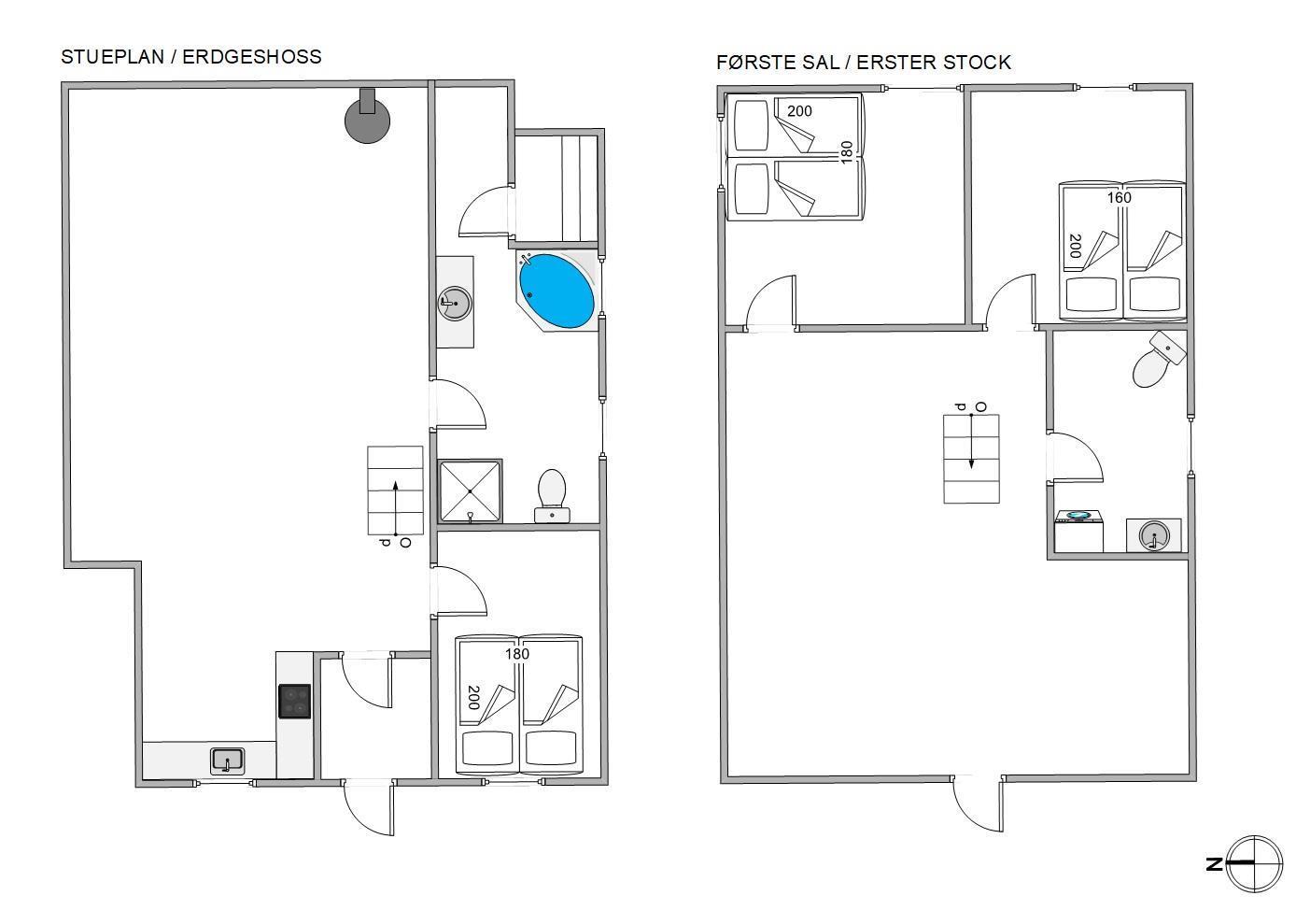 I sommerhusets stueplan finder I alrummet, hvor stue, køkken og spiseplads ligger samlet i ét. Her kan hele familien samles til hyggelige stunder, og selv når der skal laves mad, kan kokken i familien følge med i samtalen grundet den åbne planløsning.