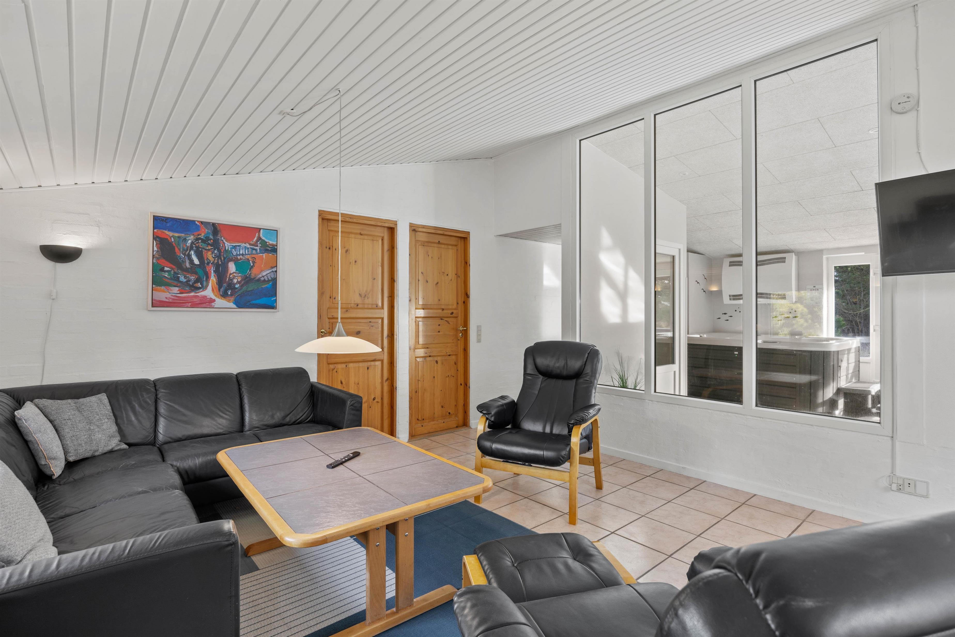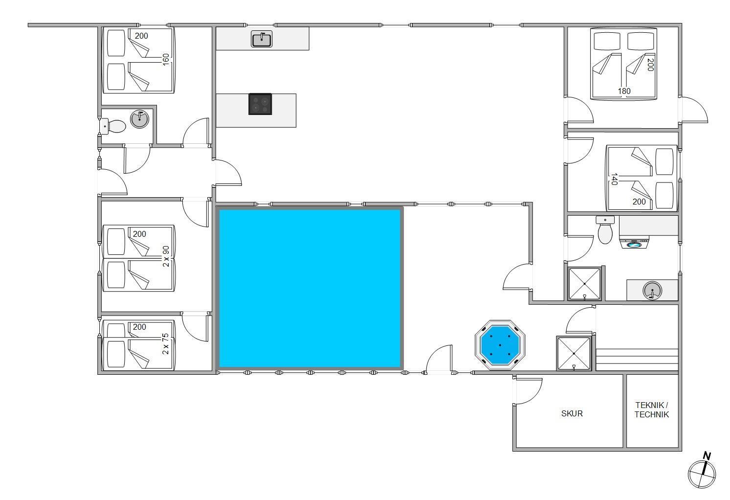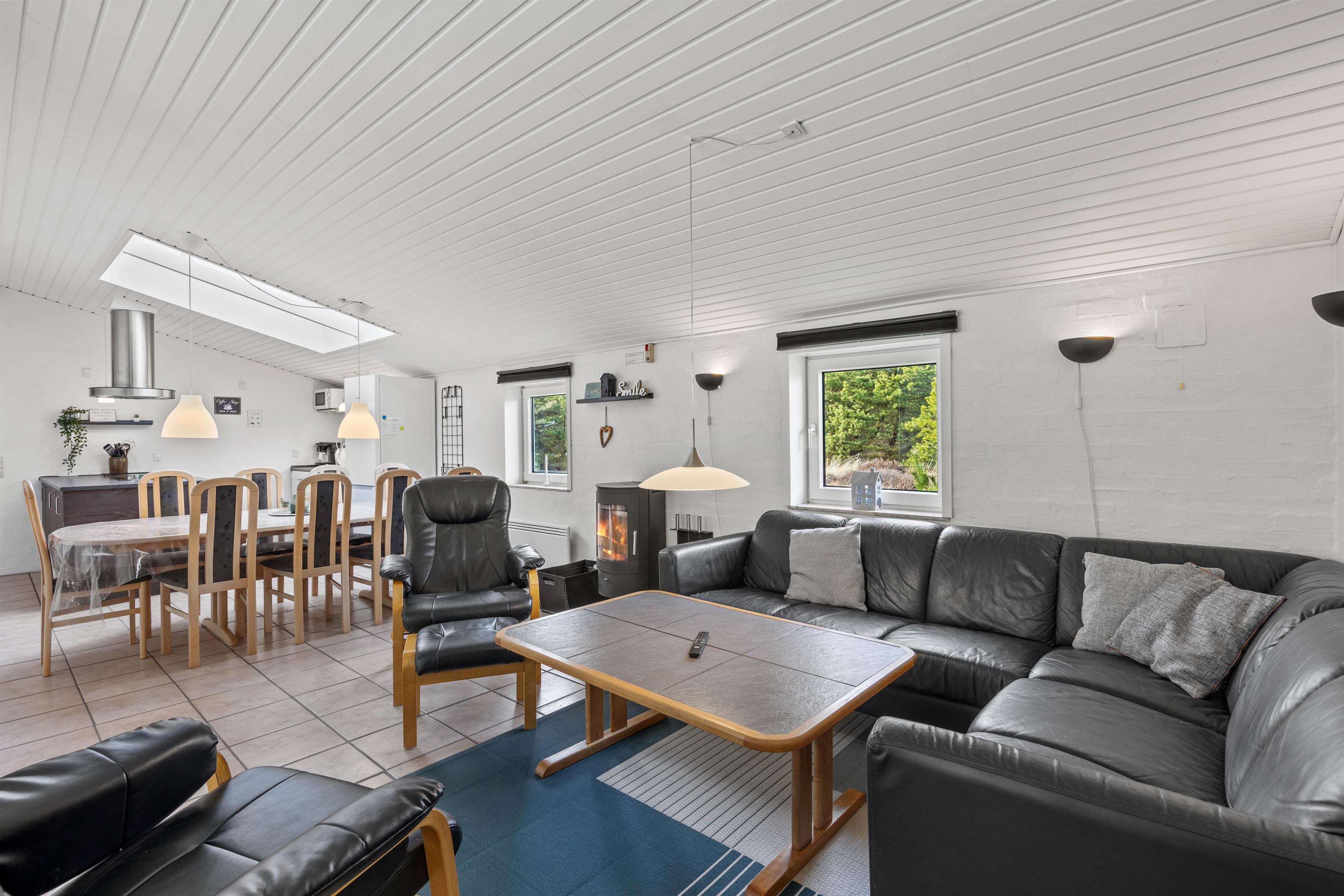 Perfekt til afslapning, hygge og sjov. Der findes en ekstra bruser i poolrummet. Huset er velegnet til alle årstider og har desuden en brændeovn i stuen, der skaber en hyggelig atmosfære i hele huset. Den store stue med åbent køkken giver en skøn udsigt til poolområdet. Ved det store spisebord kan alle samles til fælles måltider og hyggelige spilleaftener.