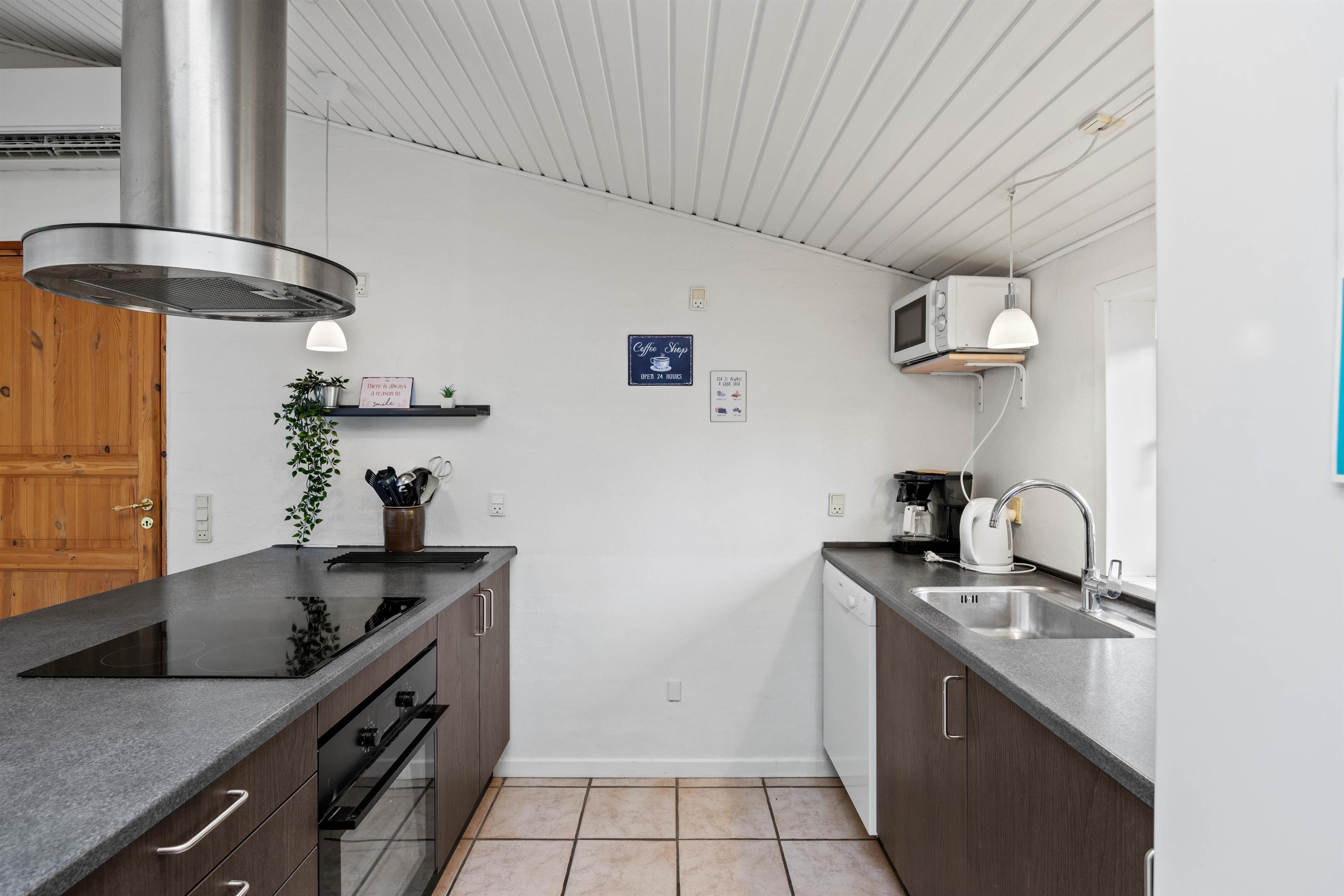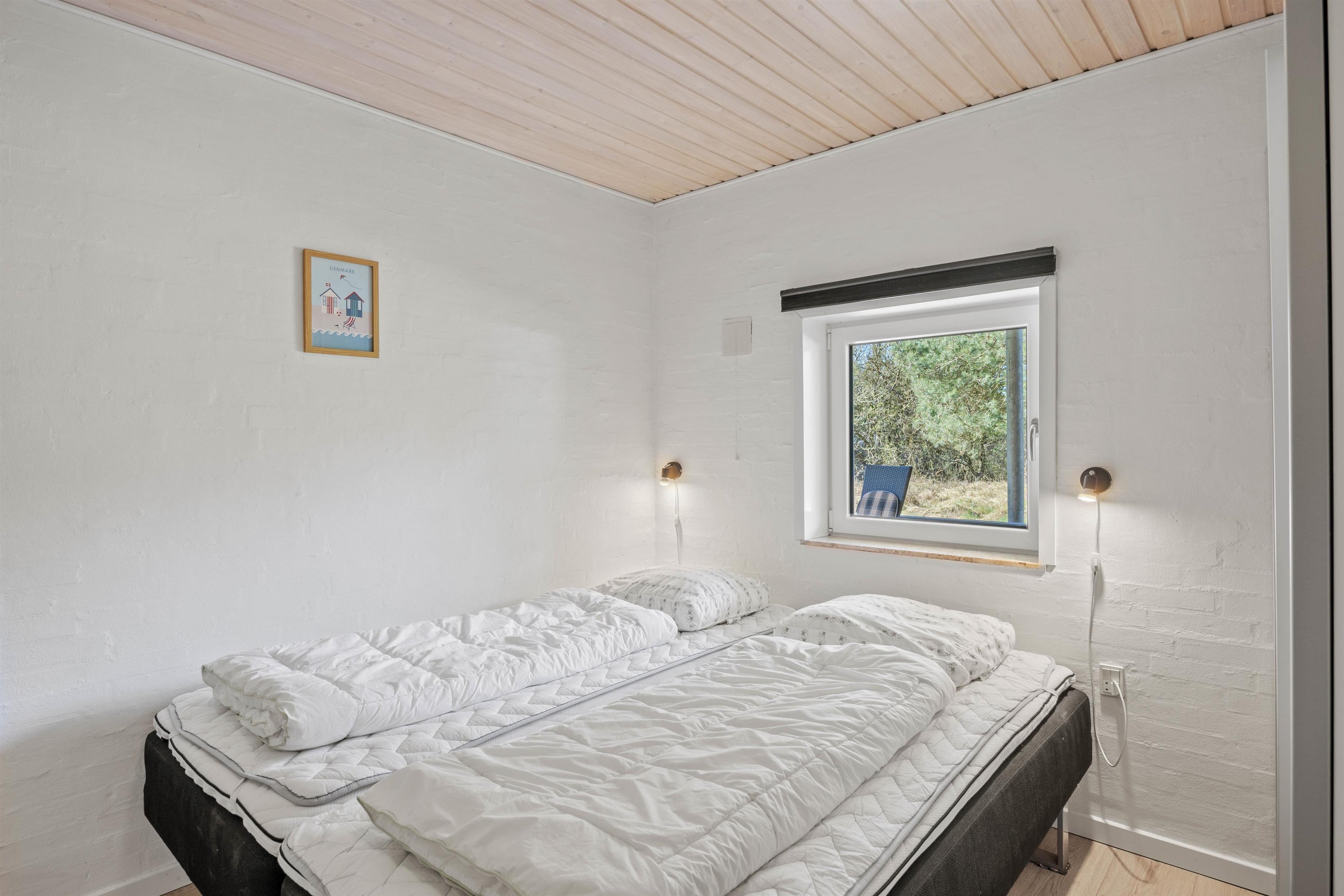 Køkkenet er udstyret med en stor kogeø, opvaskemaskine, mikrobølgeovn, køleskab og fryser. Feriehuset har 5 soveværelser, herunder 4 dobbeltsenge og en køjeseng. Der er et stort badeværelse med bruser, vaskemaskine og tørretumbler samt et ekstra gæstetoilet. Begge badeværelser har gulvvarme.