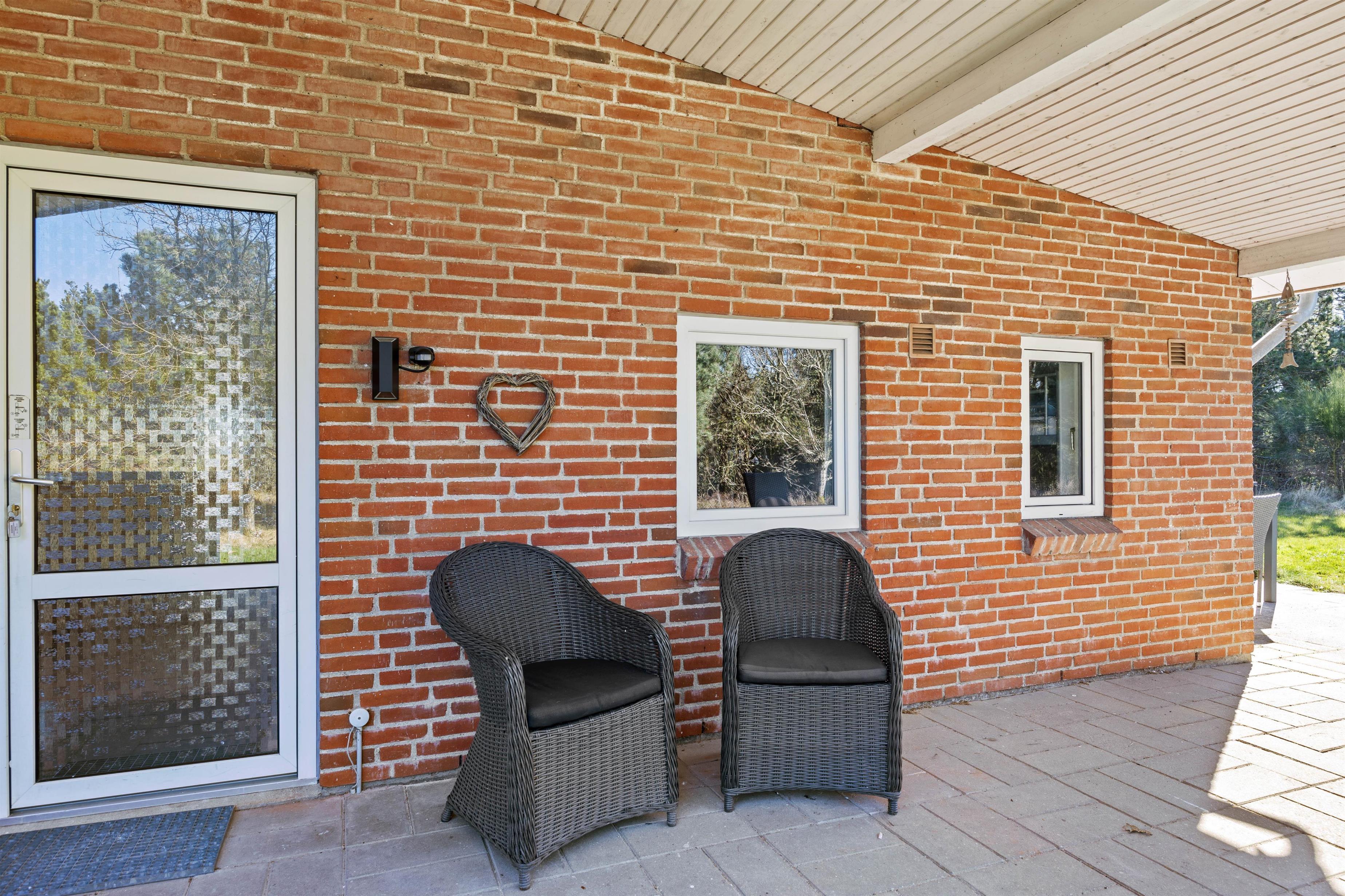 Terrassen omkring huset er udstyret med havemøbler, solvogne og en grill. Her kan I nyde den friske Nordsøluft, mens børnene leger i haven, hvor der er både en gynge og en sandkasse. 30 m² af terrassen er overdækket, så I kan grille og hygge jer, selv i lidt ustadigt vejr – måske med et glas vin eller en kold Tuborg. Fra terrassen har I en skøn udsigt til det grønne hedelandskab.