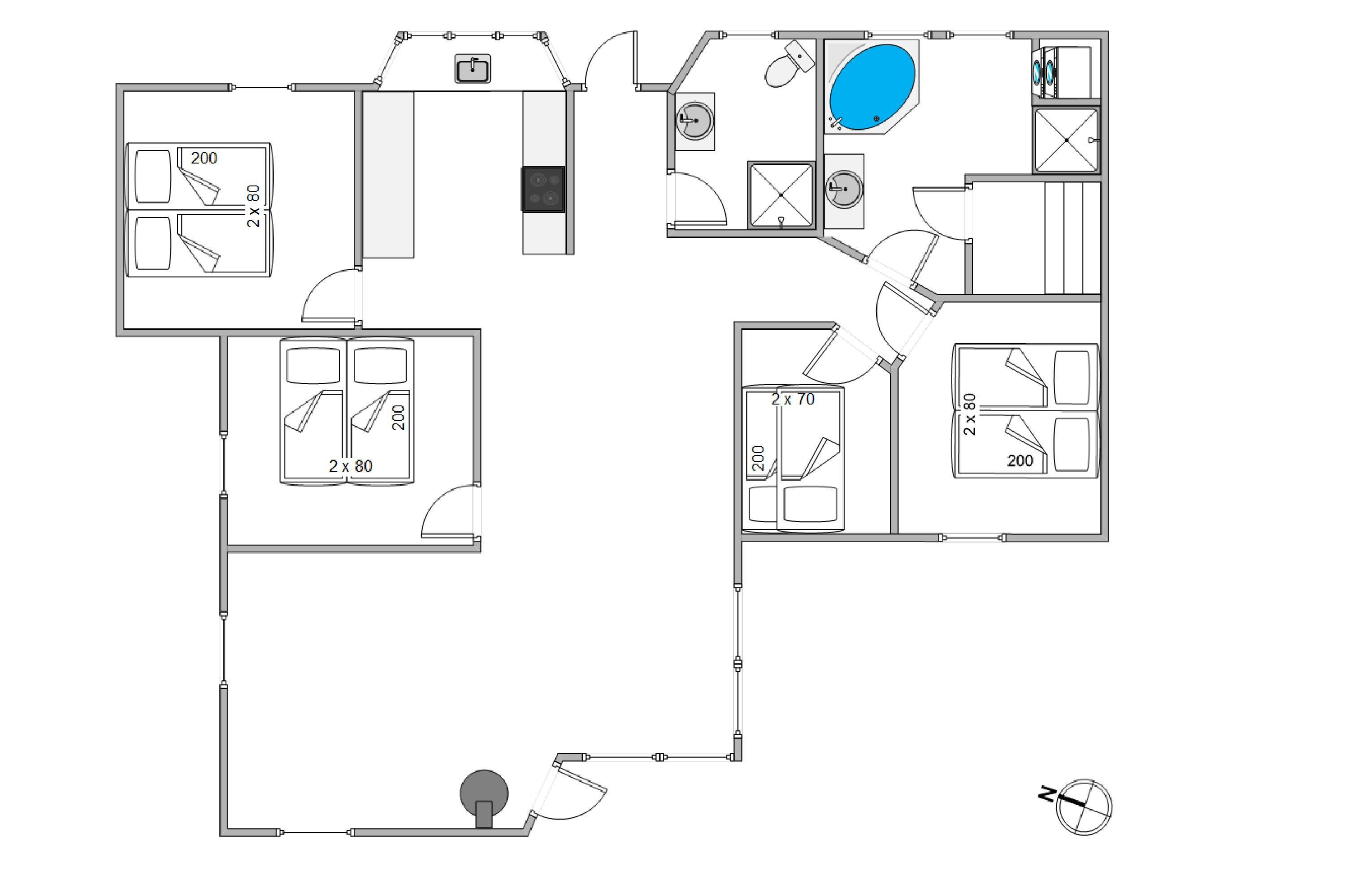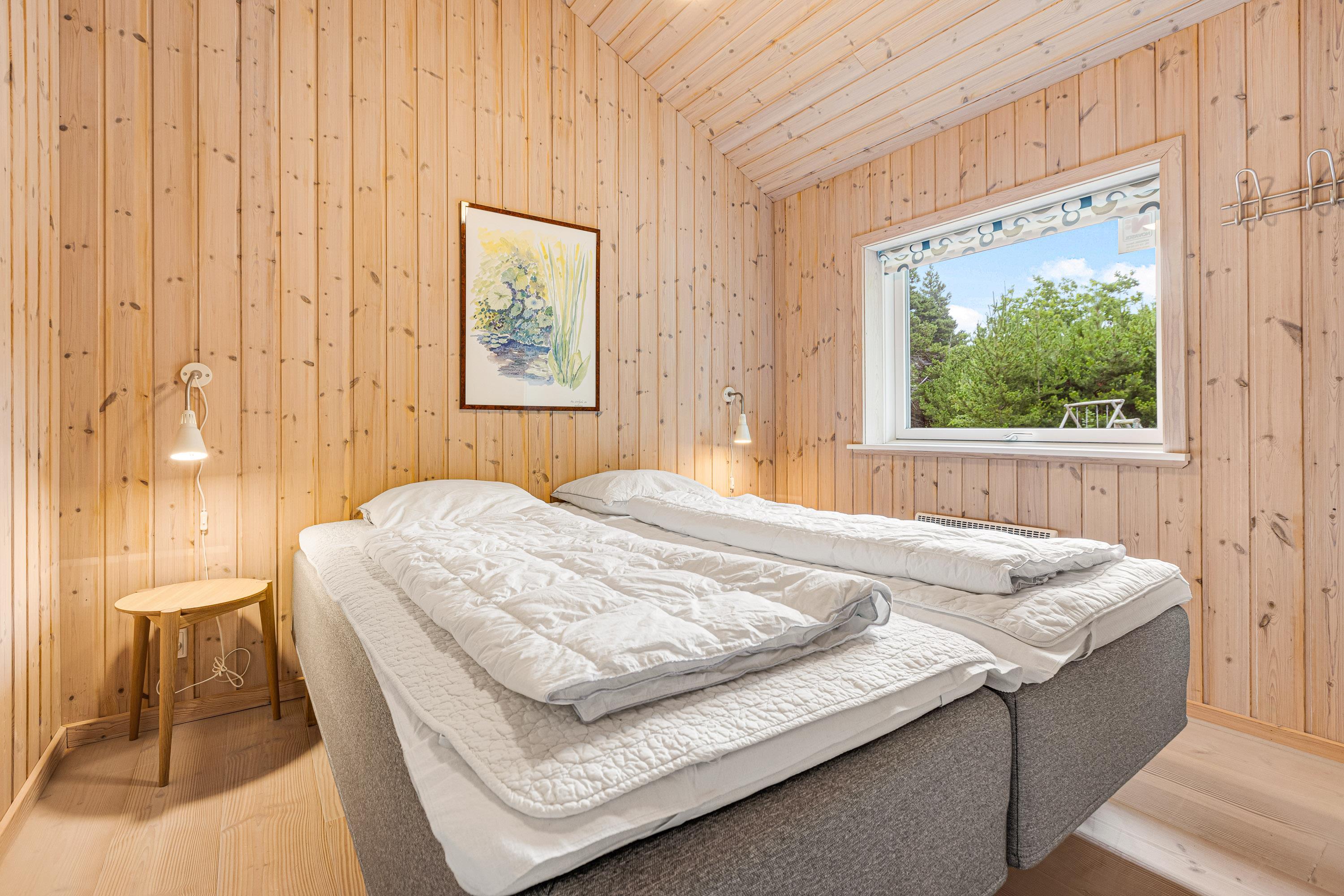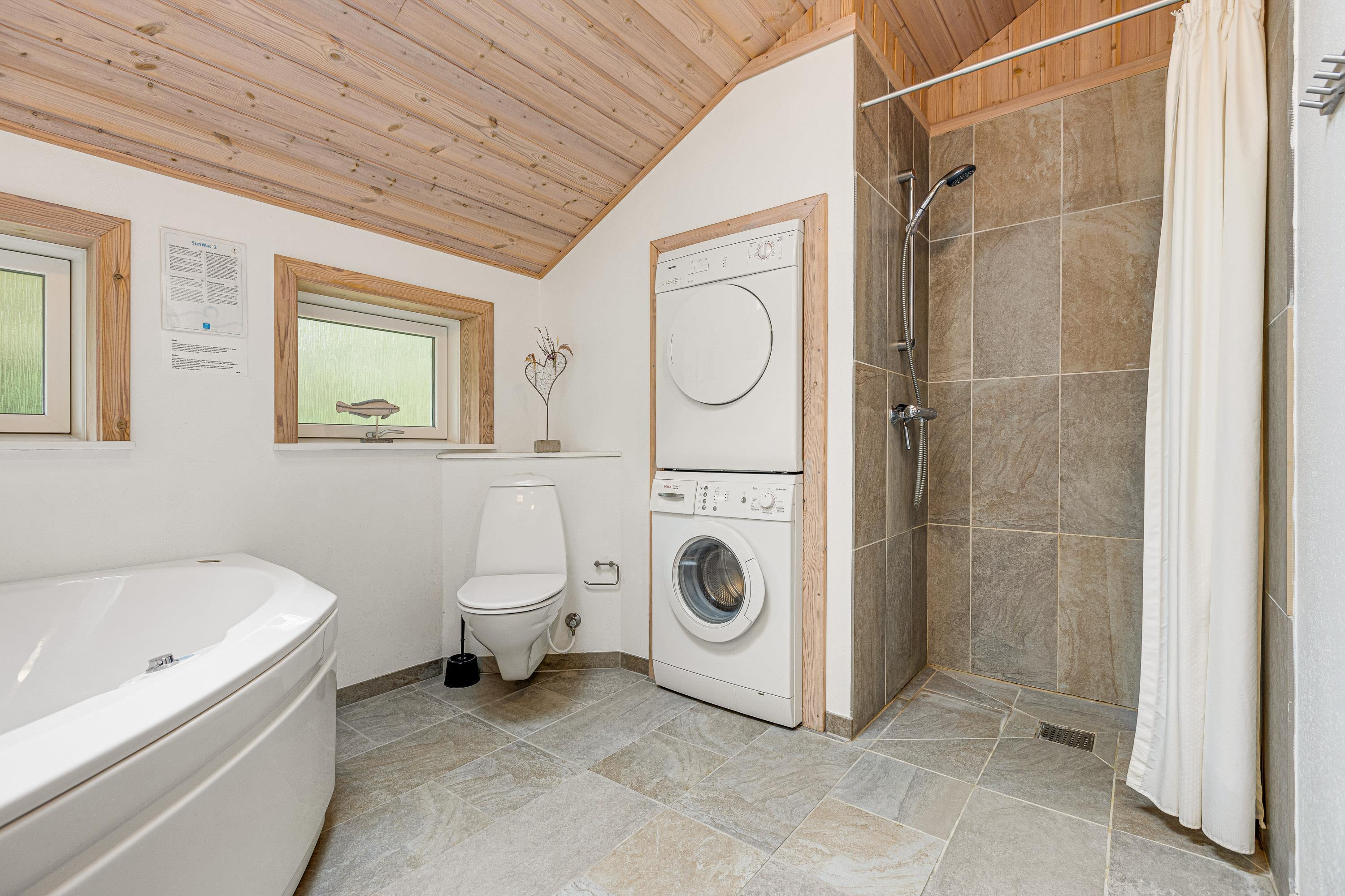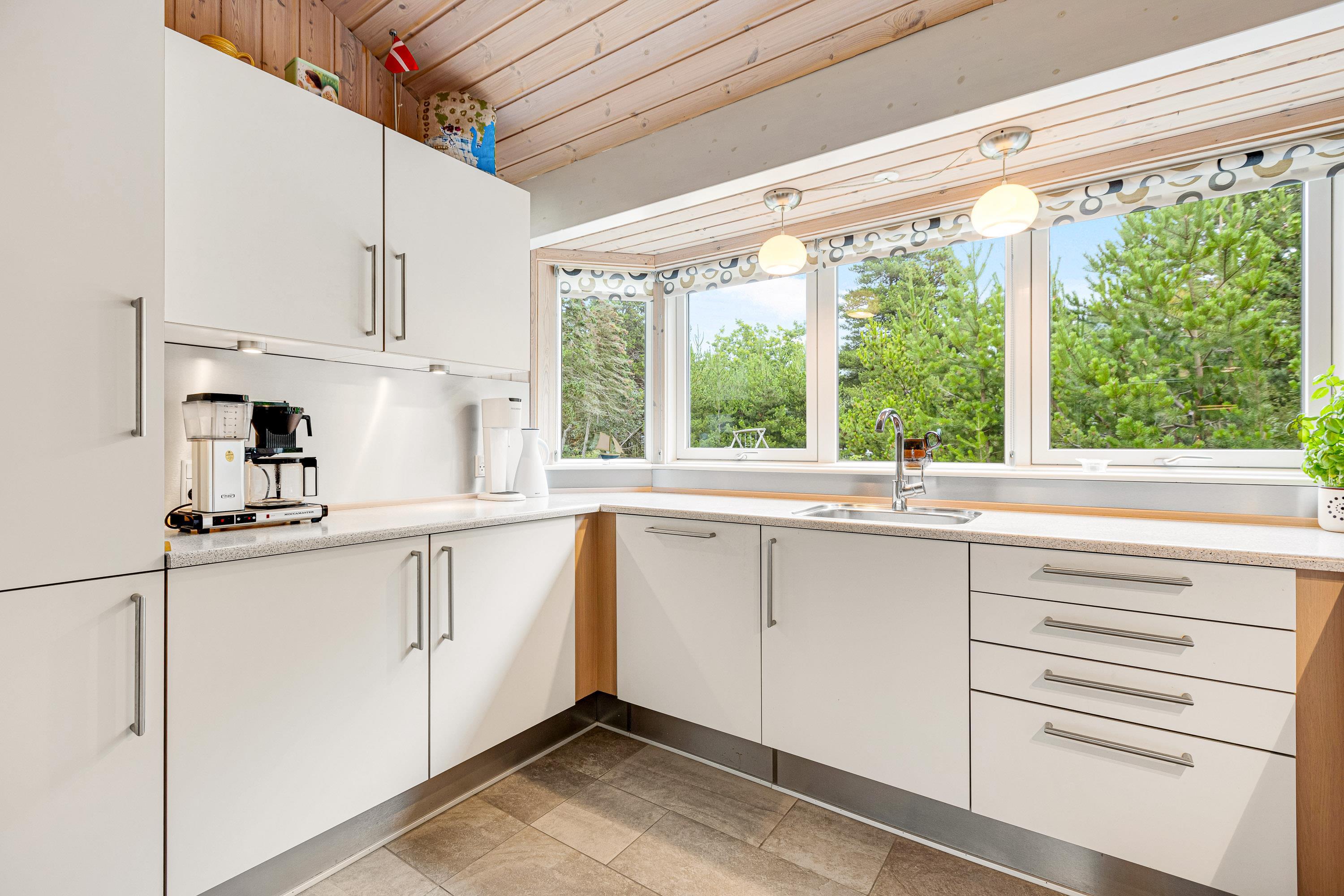 Feriehusets køkken er fyldt med lys, har en varm og indbydende atmosfære, og byder på behagelig gulvvarme. Her kan flere familiemedlemmer slå sig sammen og lave en lækker middag, som man kan nyde rundt om spisebordet med udsigt til den grønne natur. De 4 soverum er hyggeligt indrettet med træ vægge og loft, hvoraf 3 af dem indeholder en dobbeltseng samt et enkelt værelse med køjeseng. Feriehuset rummer også 2 badeværelser, hvoraf det ene indeholder både vaskemaskine og tørretumbler samt en lækker spa og sauna, hvor man kan læne sig tilbage og nyde ferien. Begge badeværelser er udstyret med komfortabel gulvvarme.