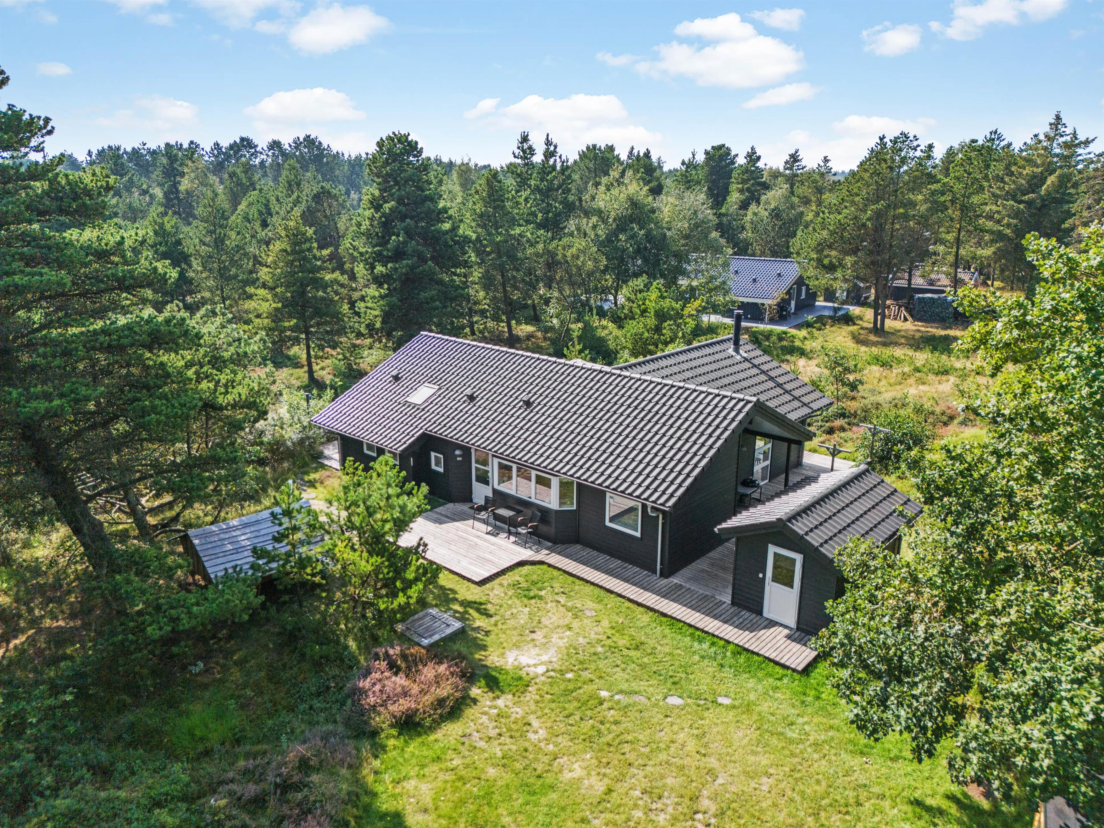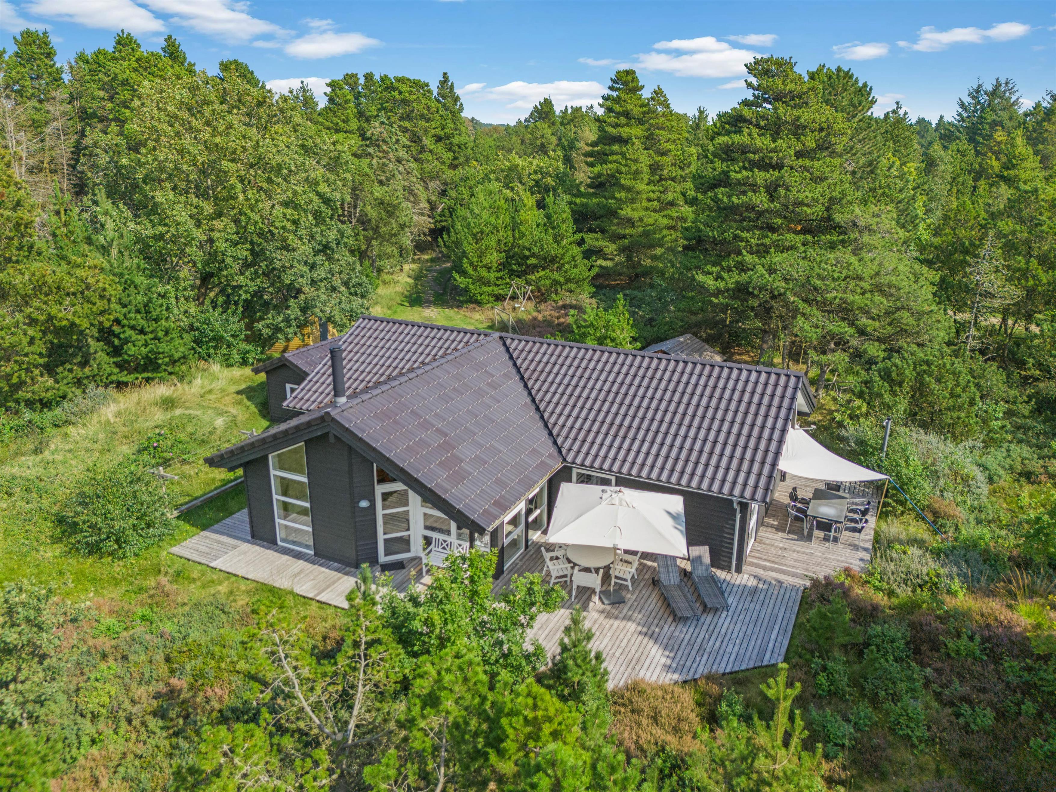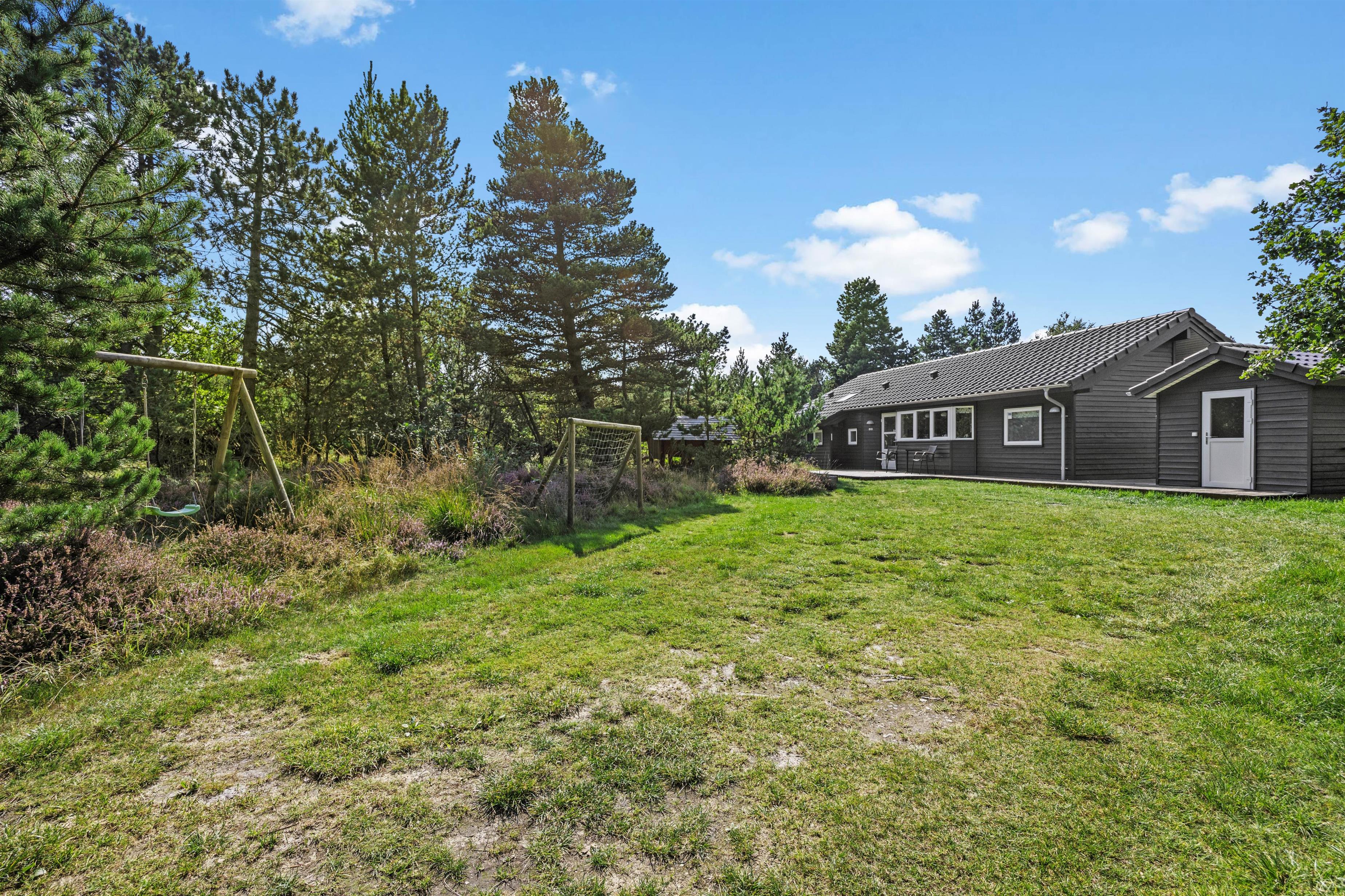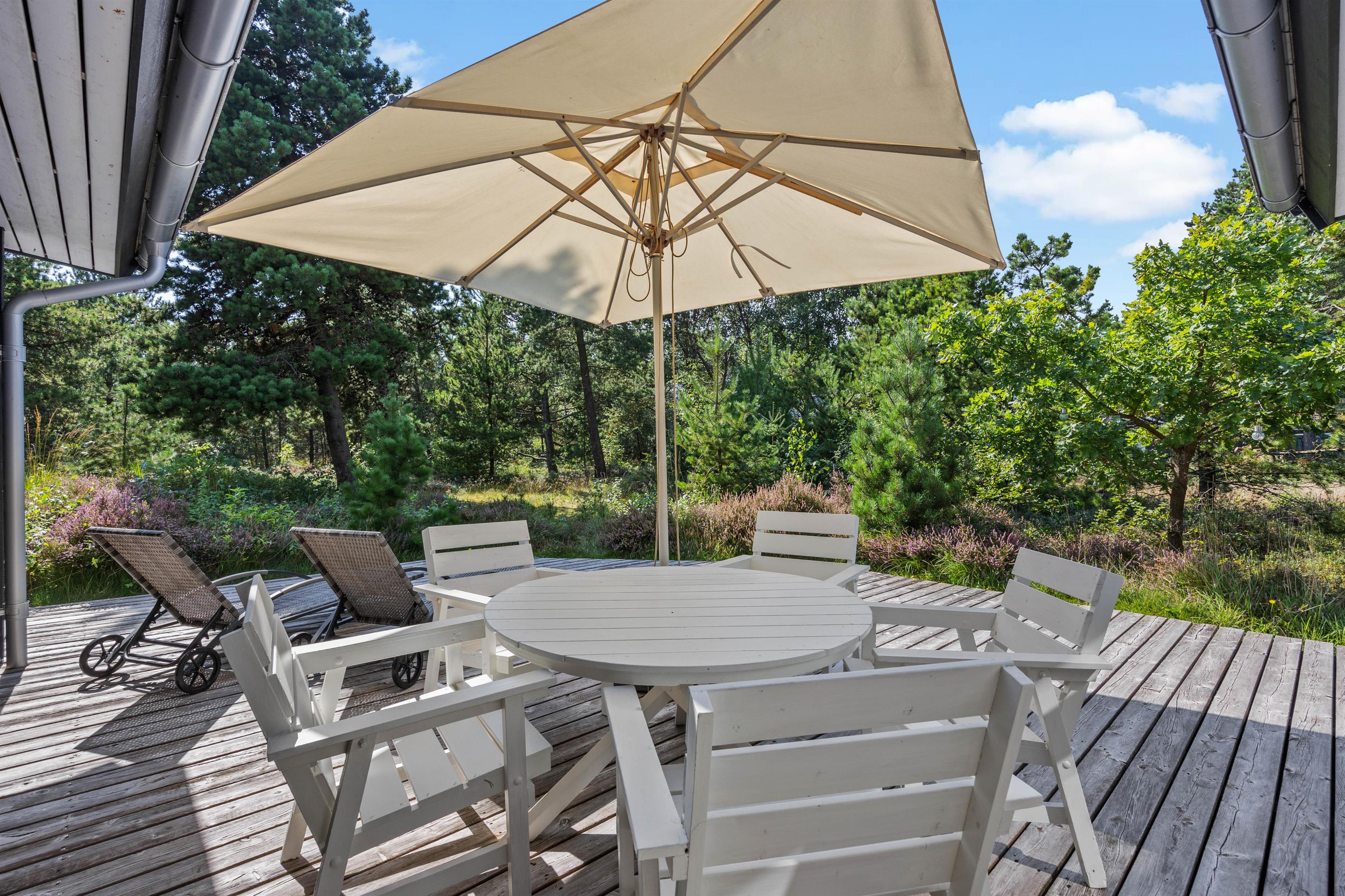På den store og åbne træterrasse kan I nyde en god bog og en dejlig kop kaffe, imens børnene kan lege i husets sandkasse og på gyngerne. Derudover har de også rig mulighed for at more sig på den store grønne naturgrund med boldspil eller anden form for leg. På terrassen er det muligt at sidde i skygge fra solen under husets parasol eller derimod nyde solen på en af husets solsenge. Om aftenen kan I spise en behagelig middag lavet på husets grill. Udenfor finder I også et lille redskabsrum, hvor I kan opbevare jeres cykler. Udenfor finder I også en udebruser, som I kan bruge i sommerhalvåret, hvis I skal skylle saltvandet af efter en tur på stranden.