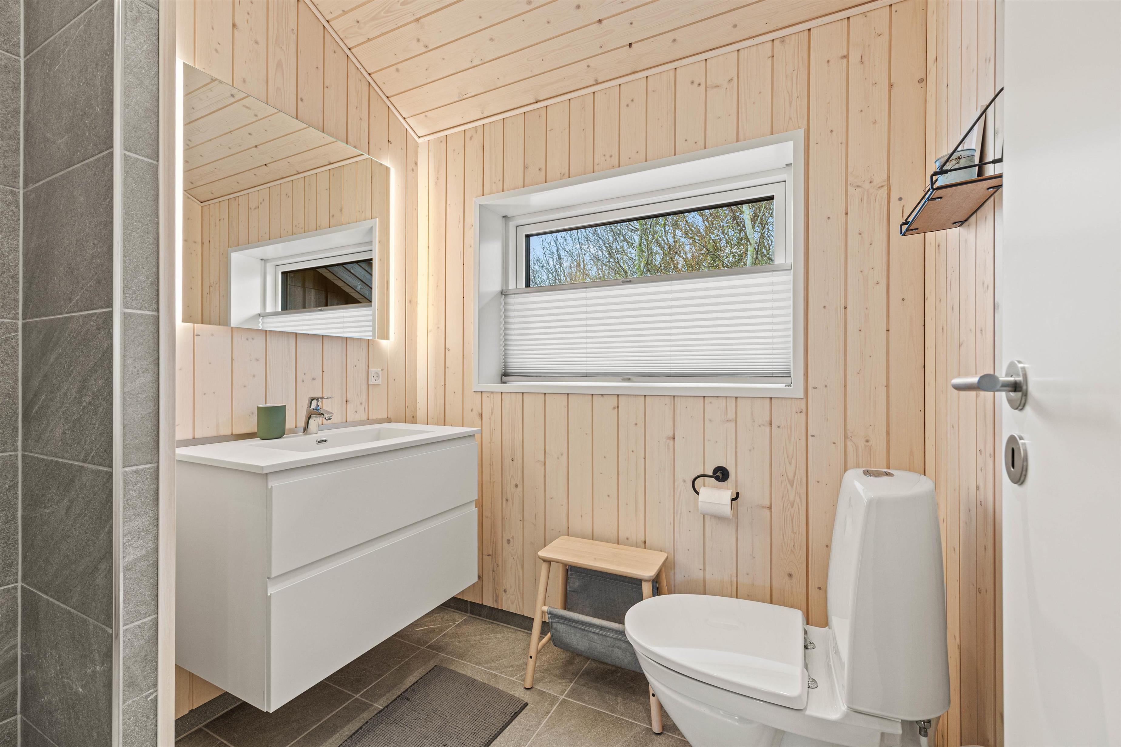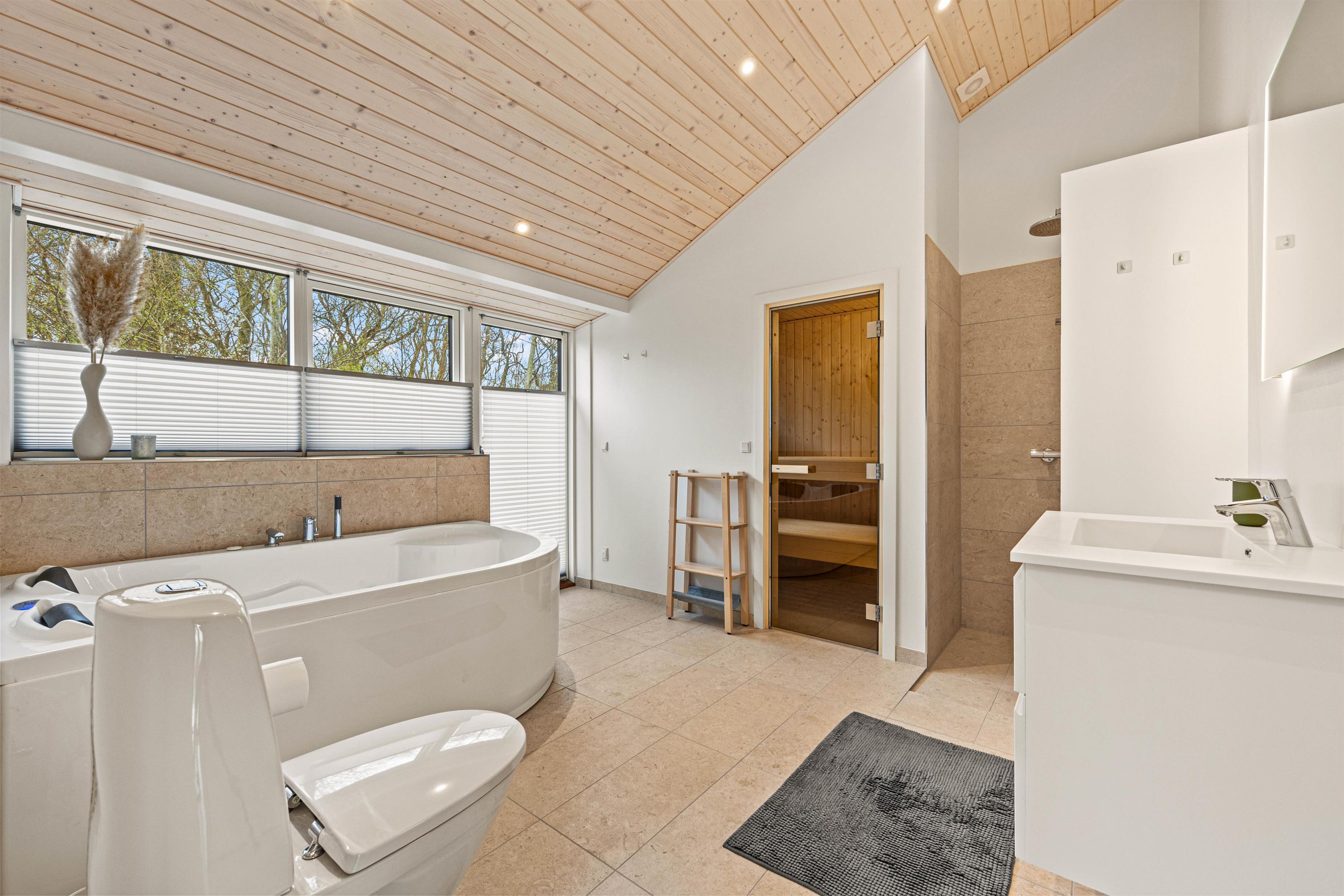Der er 2 badeværelser med gulvvarme i feriehuset. I forbindelse med det store badeværelse er også spabad og sauna, så I kan arrangere jeres egen lille wellnessaften. Når dagen er omme, er der i alt 5 hyggelige soveværelser med komfortable senge til rådighed. 3 dobbeltsenge, 2 enkeltsenge og 1 køjeseng giver mulighed for, at I kan arrangere jer, som det passer jer bedst og få en afslappende nattesøvn i den friske vesterhavsluft.