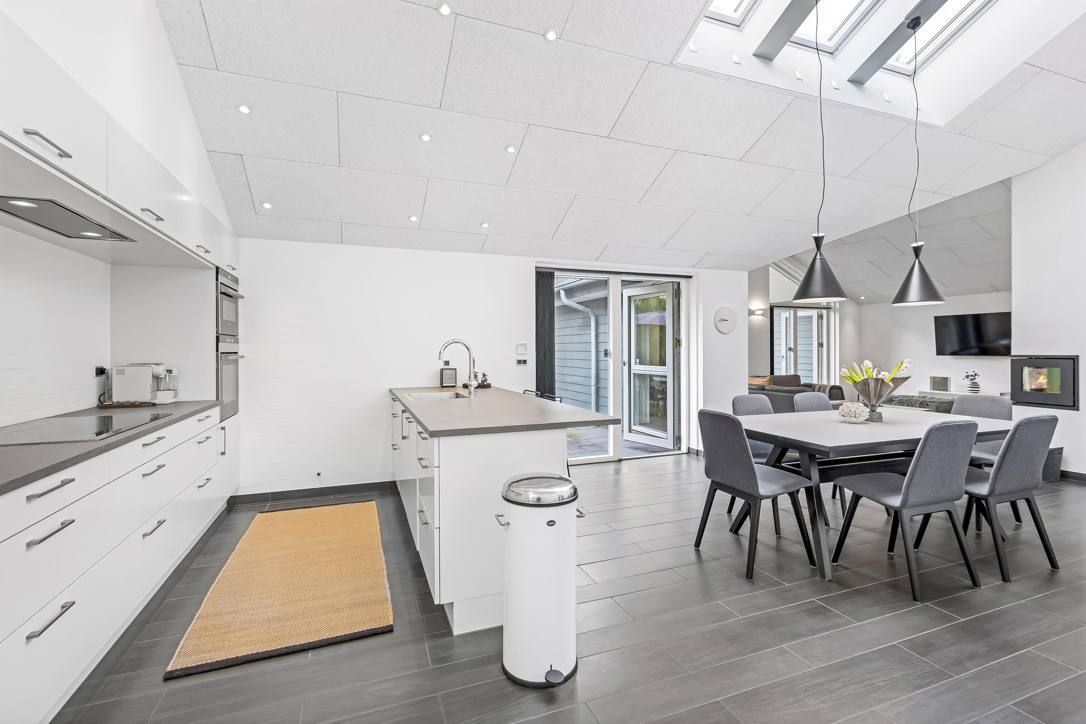 Det moderne køkken er fuldt udstyret med kvalitetsmaterialer og alt, hvad du behøver for at tilberede lækre måltider. Den åbne planløsning gør det nemt at være sammen, mens maden bliver tilberedt og opvaskemaskinen klarer resten. Huset er udstyret med en effektiv varmepumpe (luft til vand), der kombineret med en brændeovn giver både energieffektivitet og den hyggelige stemning, som gør aftenerne ekstra specielle.