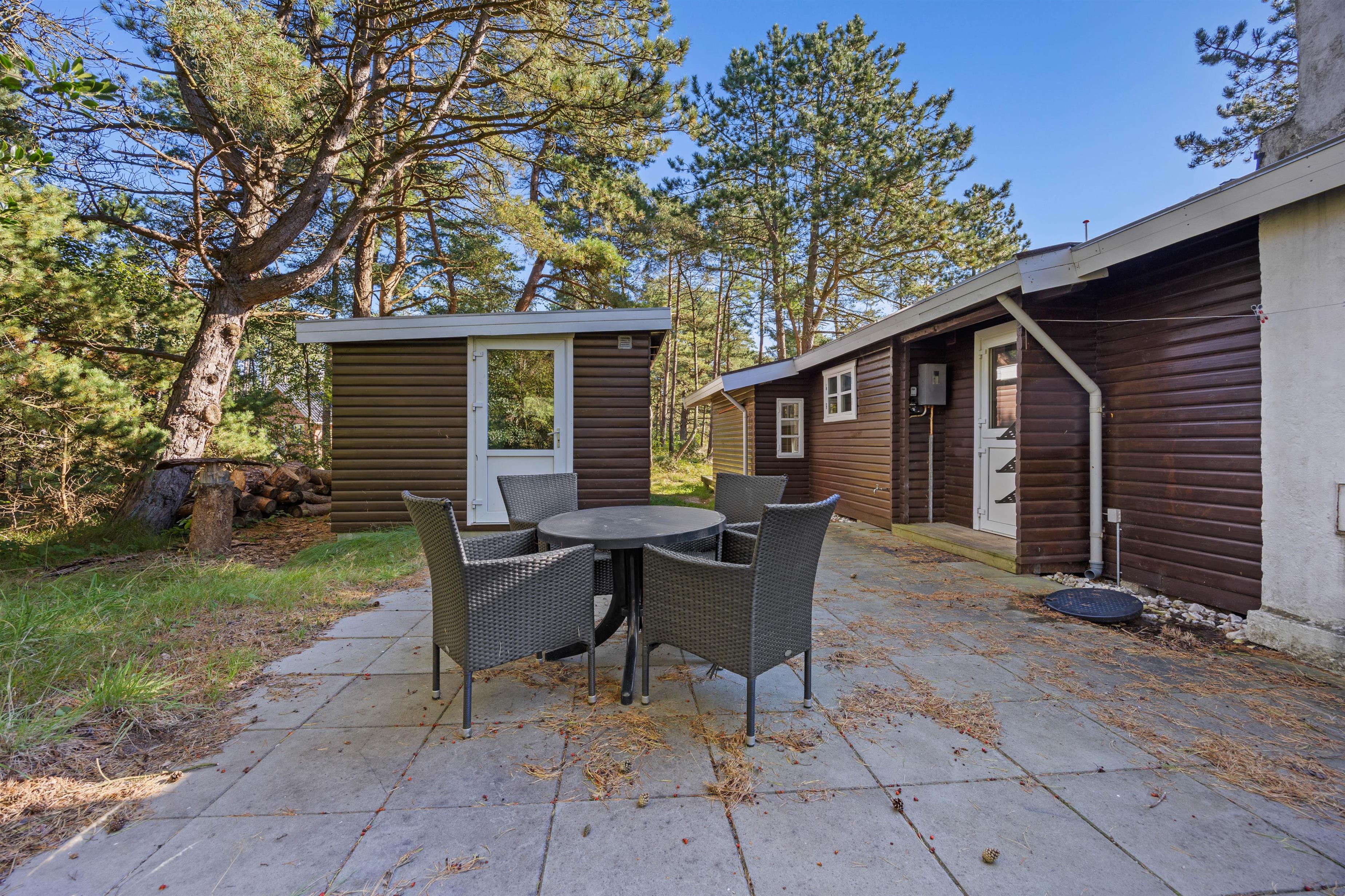 En af fordelene ved at vælge et sommerhus i Sønderstrand, Rømø, er den fantastiske adgang til naturen omkring jer. Feriehuset er beliggende på en idyllisk naturgrund, hvor træerne skærmer for naboerne og her er rig mulighed for at slappe af på terrassen. Terrassen indbyder til dejlige solskinstimer, hyggelige grillaftner og så er her også et shelter, der giver jer mulighed for at overnatte under åben himmel.