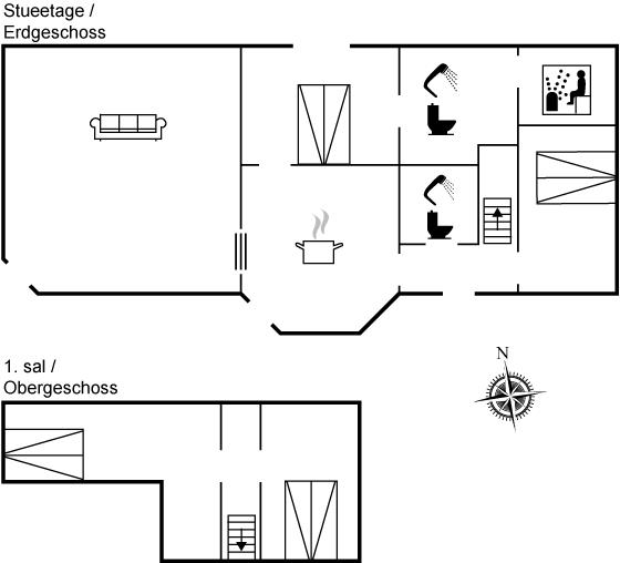 Der er 2 badeværelser med bruseniche og 2 toiletter. Der er gulvvarme på 2 badeværelser. I saunaen er der mulighed for afslapning.