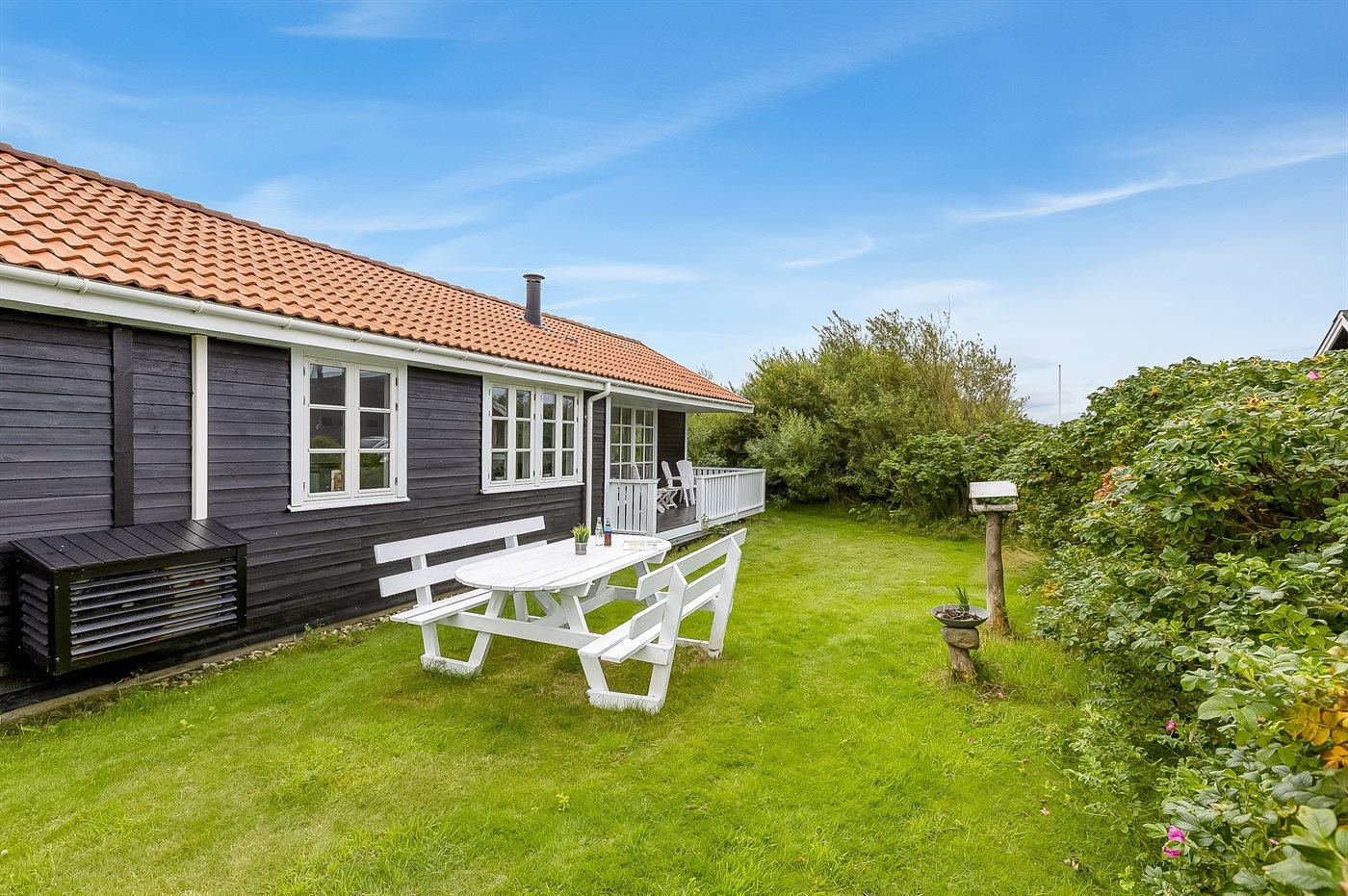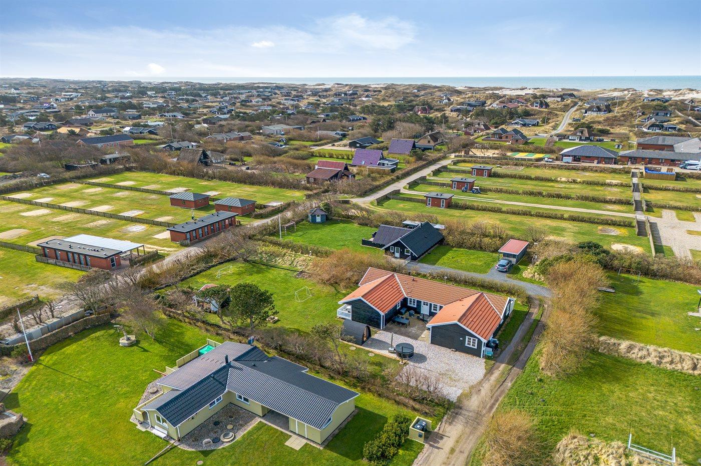 Ferieboligen er beliggende på en 1200 m² stor naturgrund. Der er 700 m til havet. Nærmeste forretning er beliggende i en afstand af 800 m. Desuden er der 10 m² overdækket terrasse. Til ferieboligen hører åbent terrasseareal. Gynge. Sandkasse. Legetårn. Udendørs sauna. Udendørs bruser. Der er installeret stik til opladning af elbil. Type 2 stik. Med 11 kW ladeeffekt. Parkering ved ferieboligen.