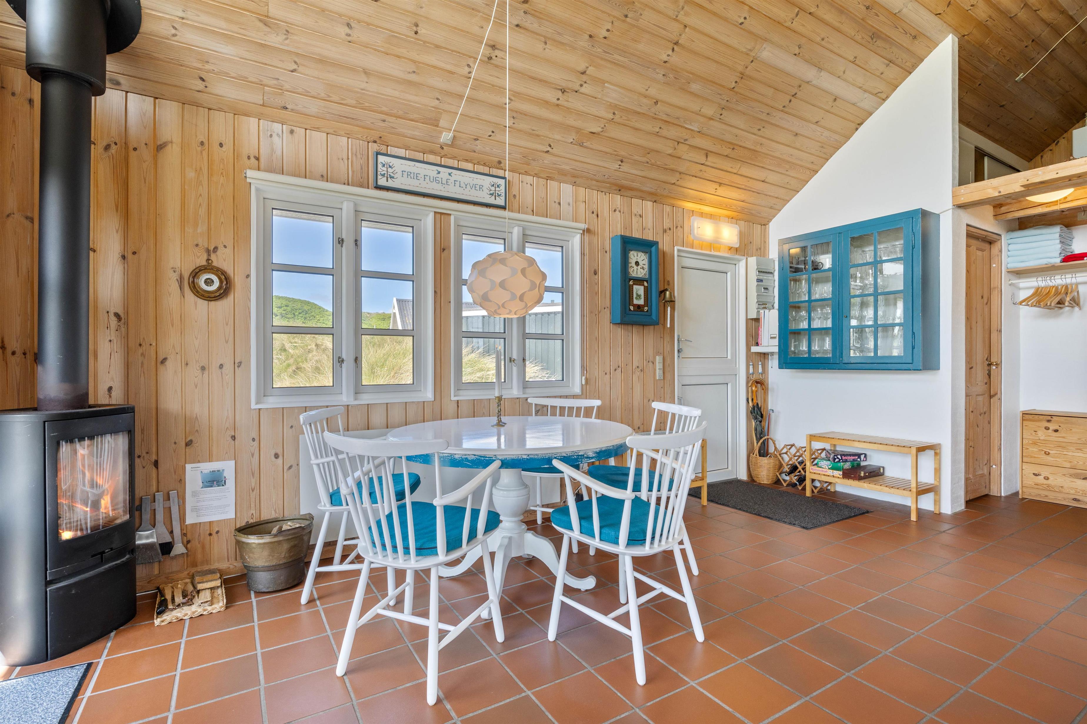 Når I træder ind i sommerhuset, vil I blive mødt af masser af feriestemning. Væggene er beklædt med træ, og loftet er åbnet til kip – det giver sammen med brændeovnens flammer den hyggeligste atmosfære og de perfekte rammer for samvær med familien. Der er 2 gode soveværelser, hvoraf det ene er indrettet med en dobbeltseng og det andet er indrettet med to enkeltsenge. Den femte soveplads finder i på hemsen.