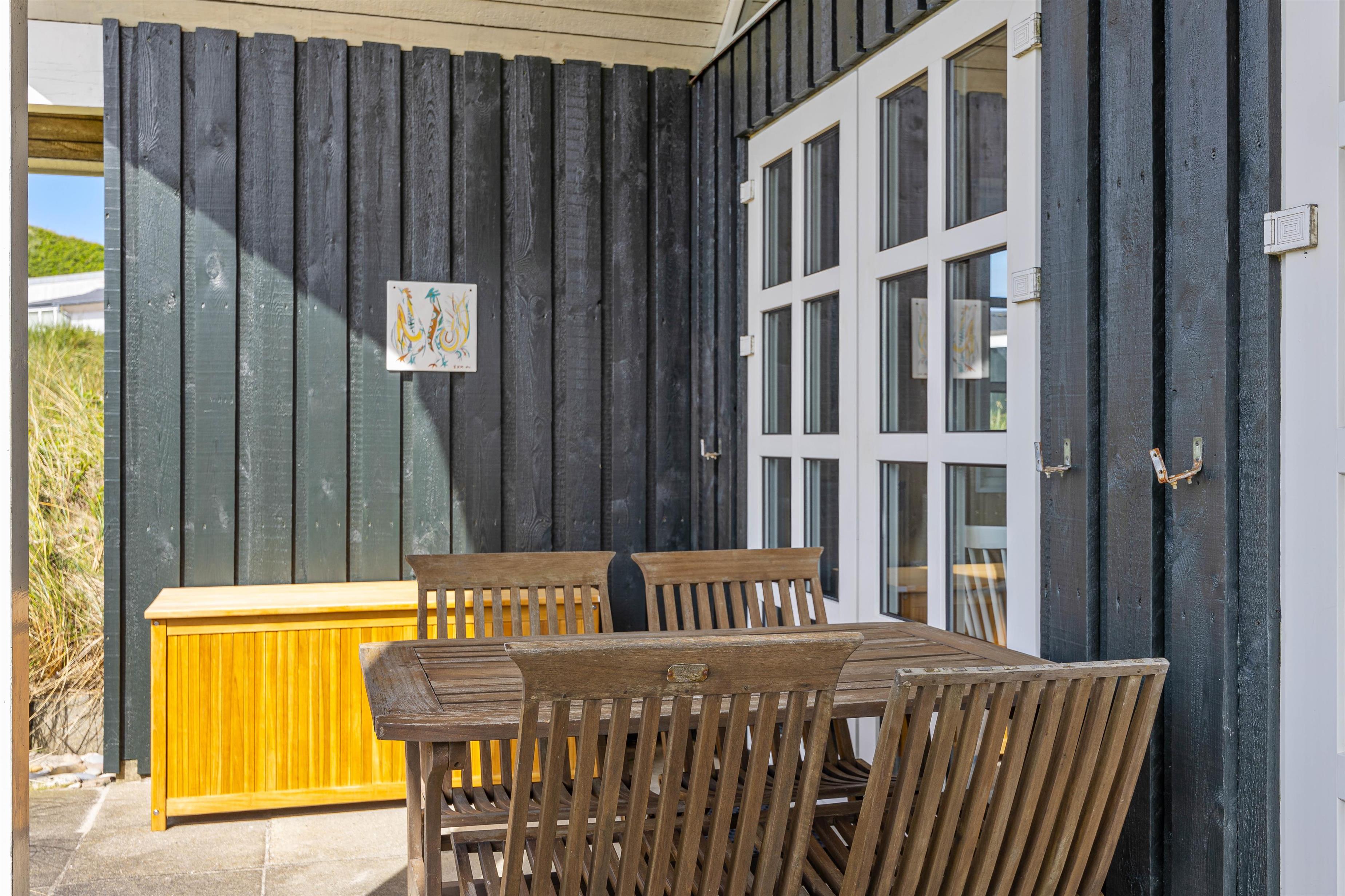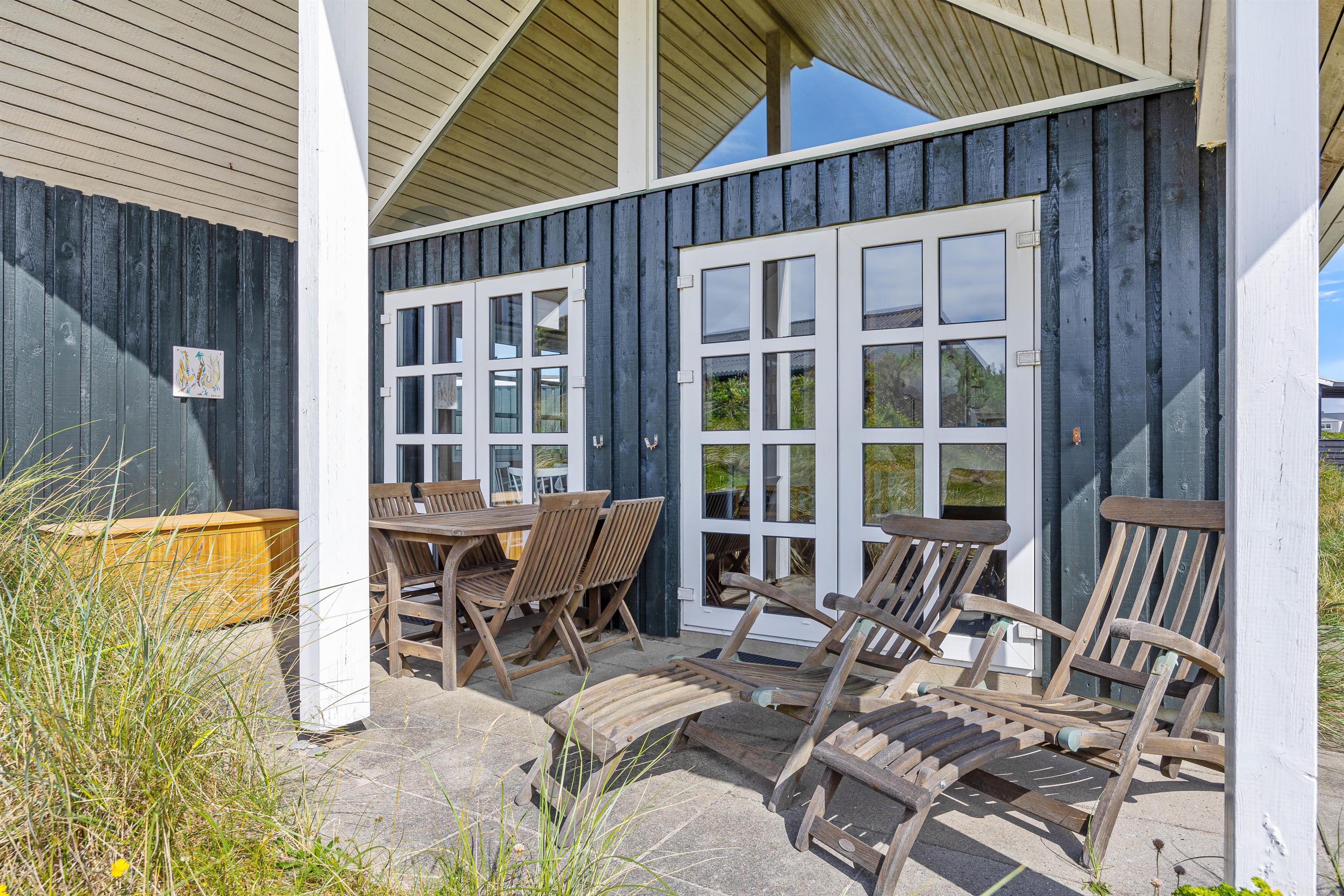 På de solrige feriedage kommer I uden tvivl til at bruge de fleste timer udendørs på en af sommerhusets gode terrasser. Den ene terrasse er sydvendt og delvist overdækket. Her kan I nyde den friske luft i alt slags vejr.