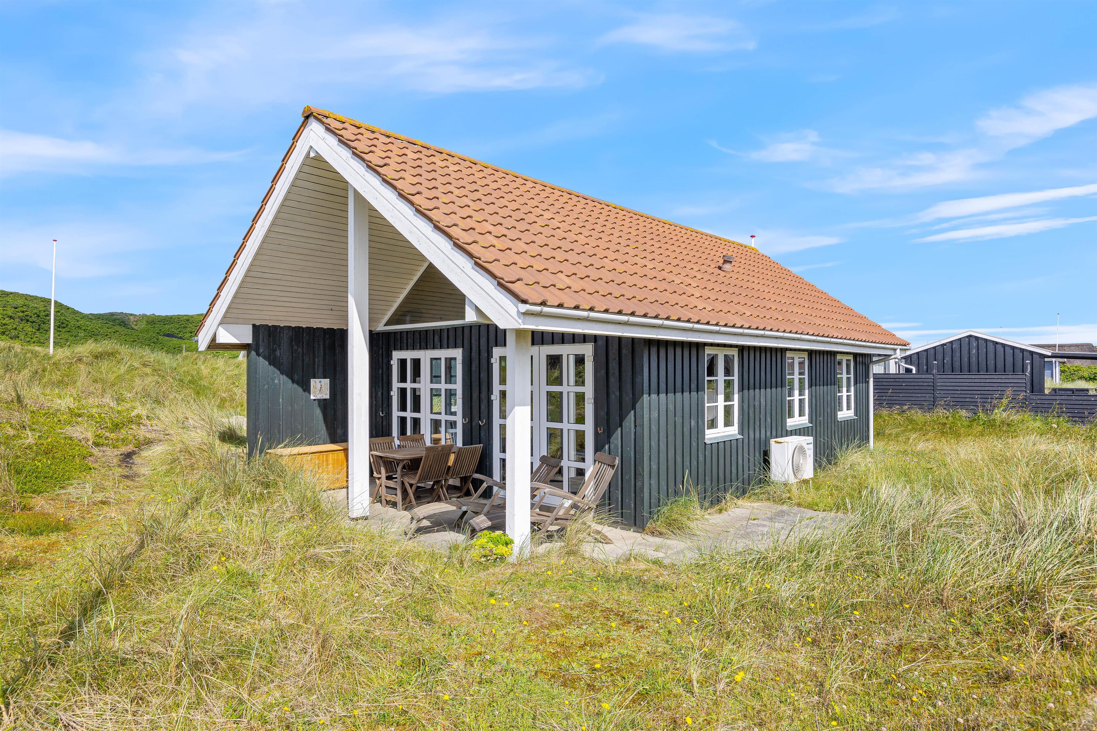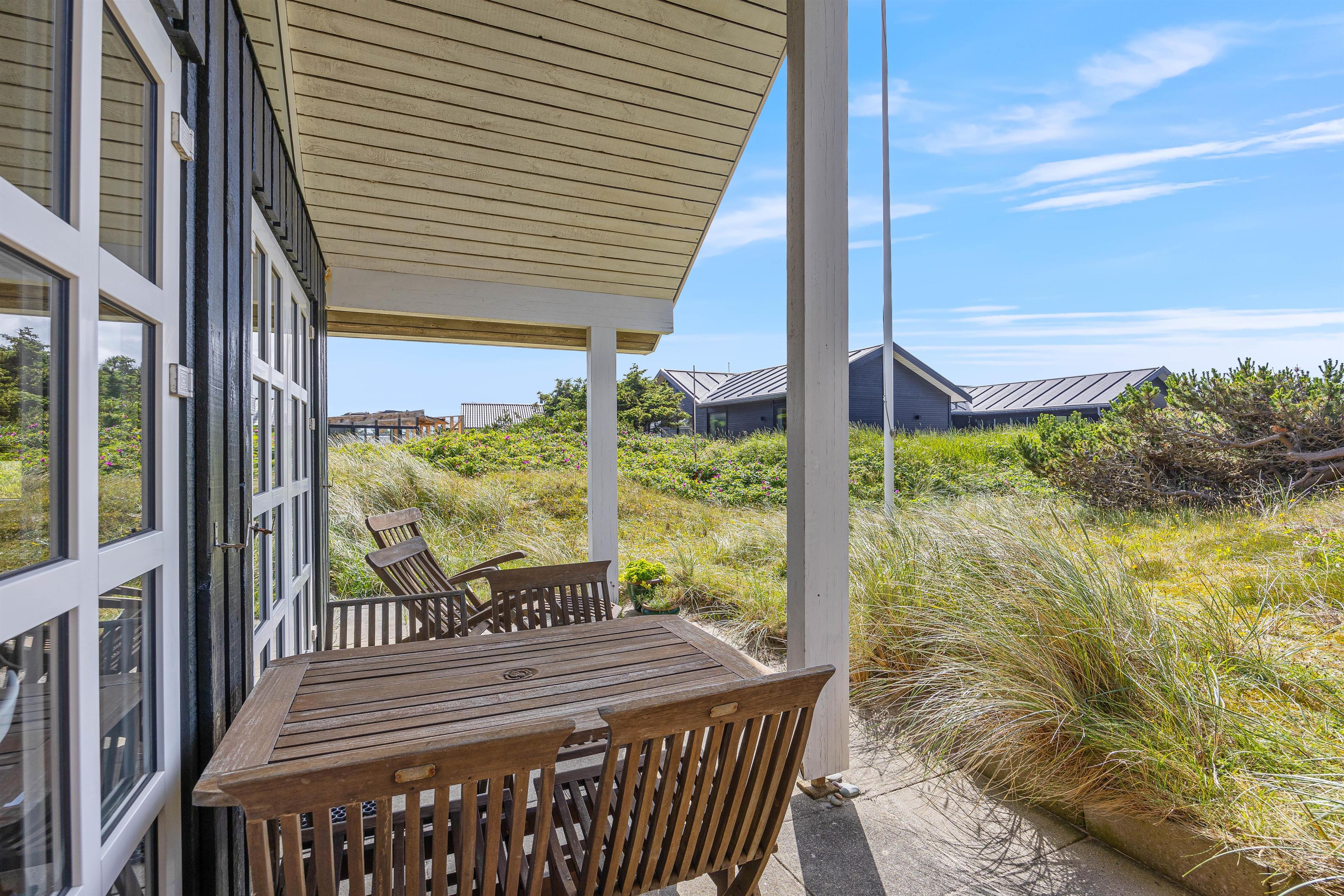 Den anden terrasse finder I mod vest. Her har I masser af sol om eftermiddagen og om aftenen, så I må ikke snyde jer selv for et godt aftensmåltid tilberedt på sommerhusets grill – det kunne jo nydes til den flotte solnedgang med et godt glas vin?