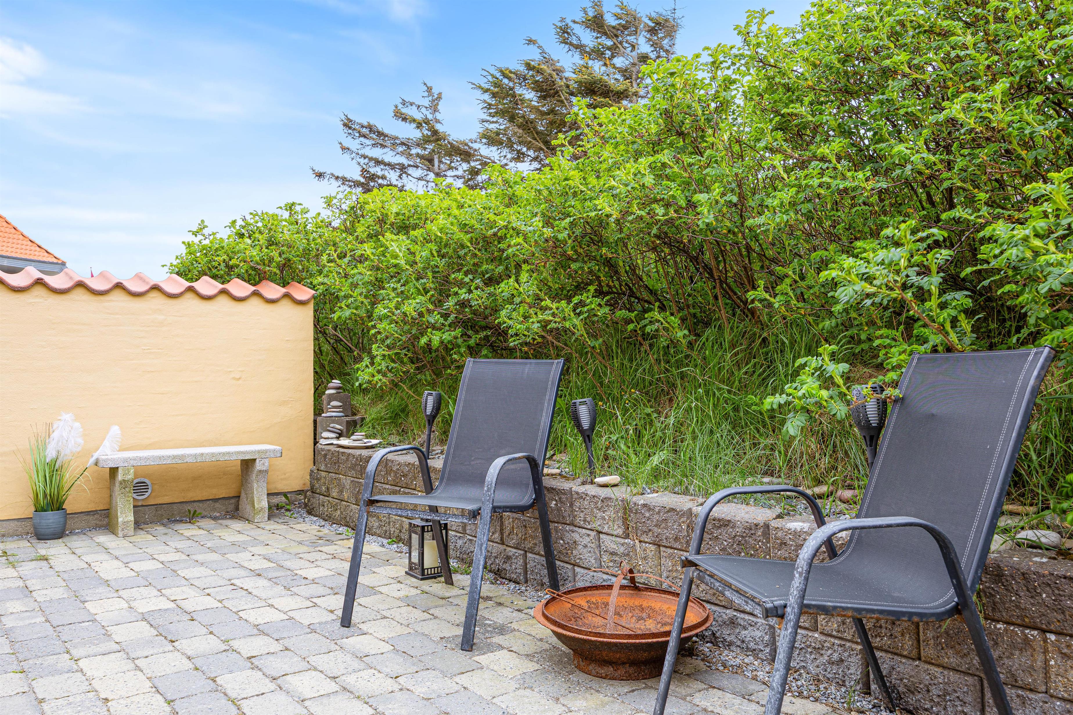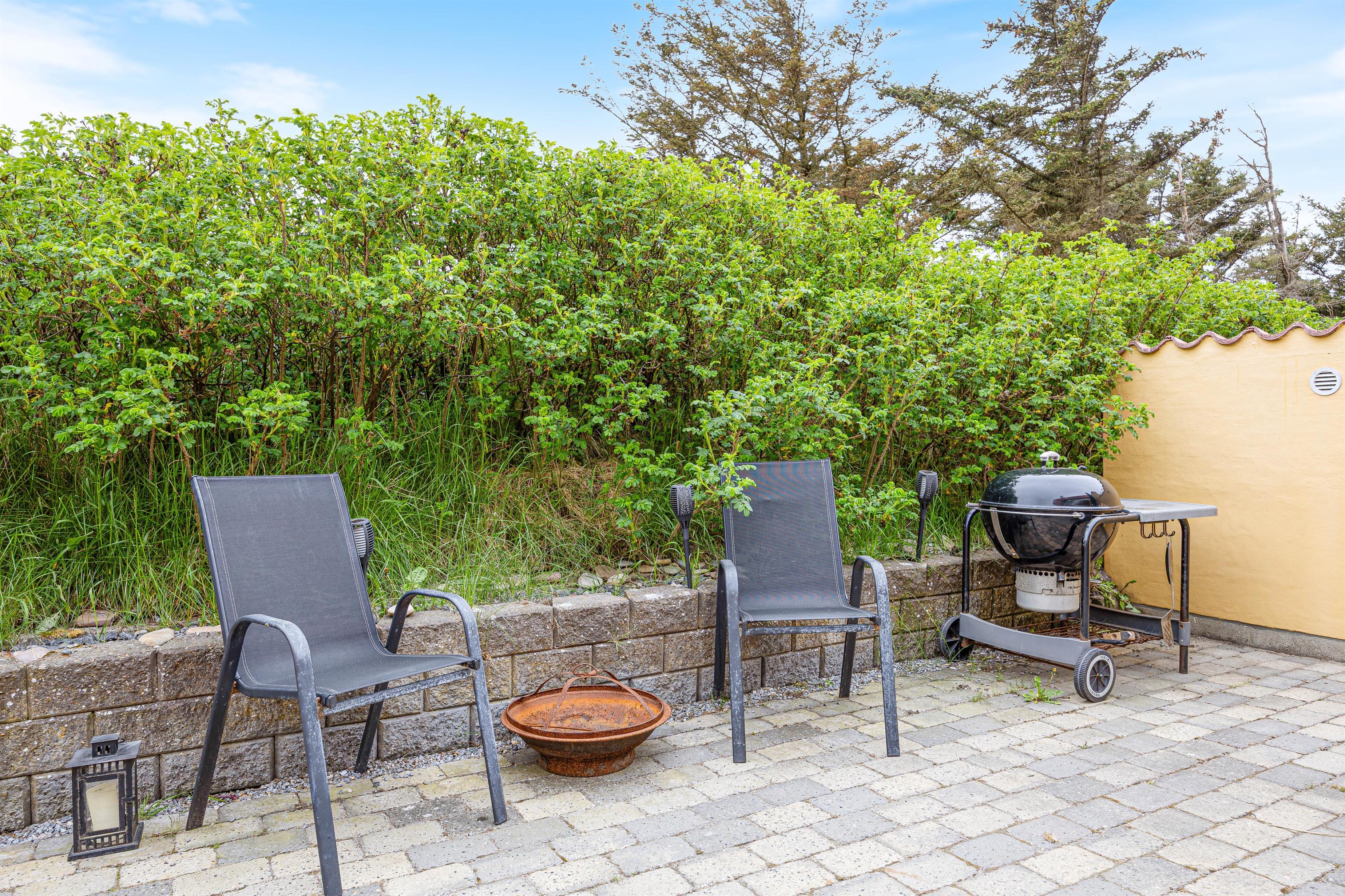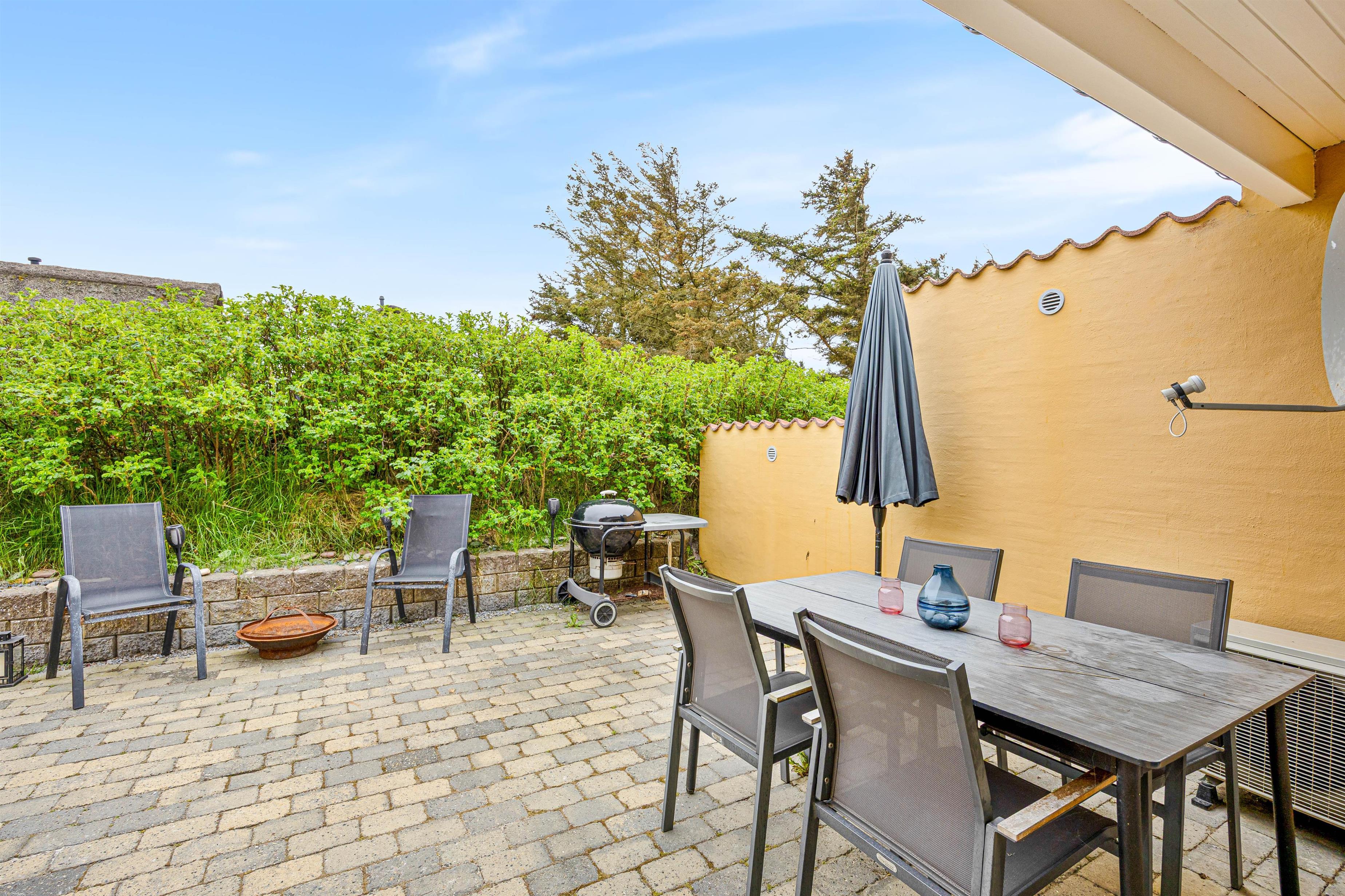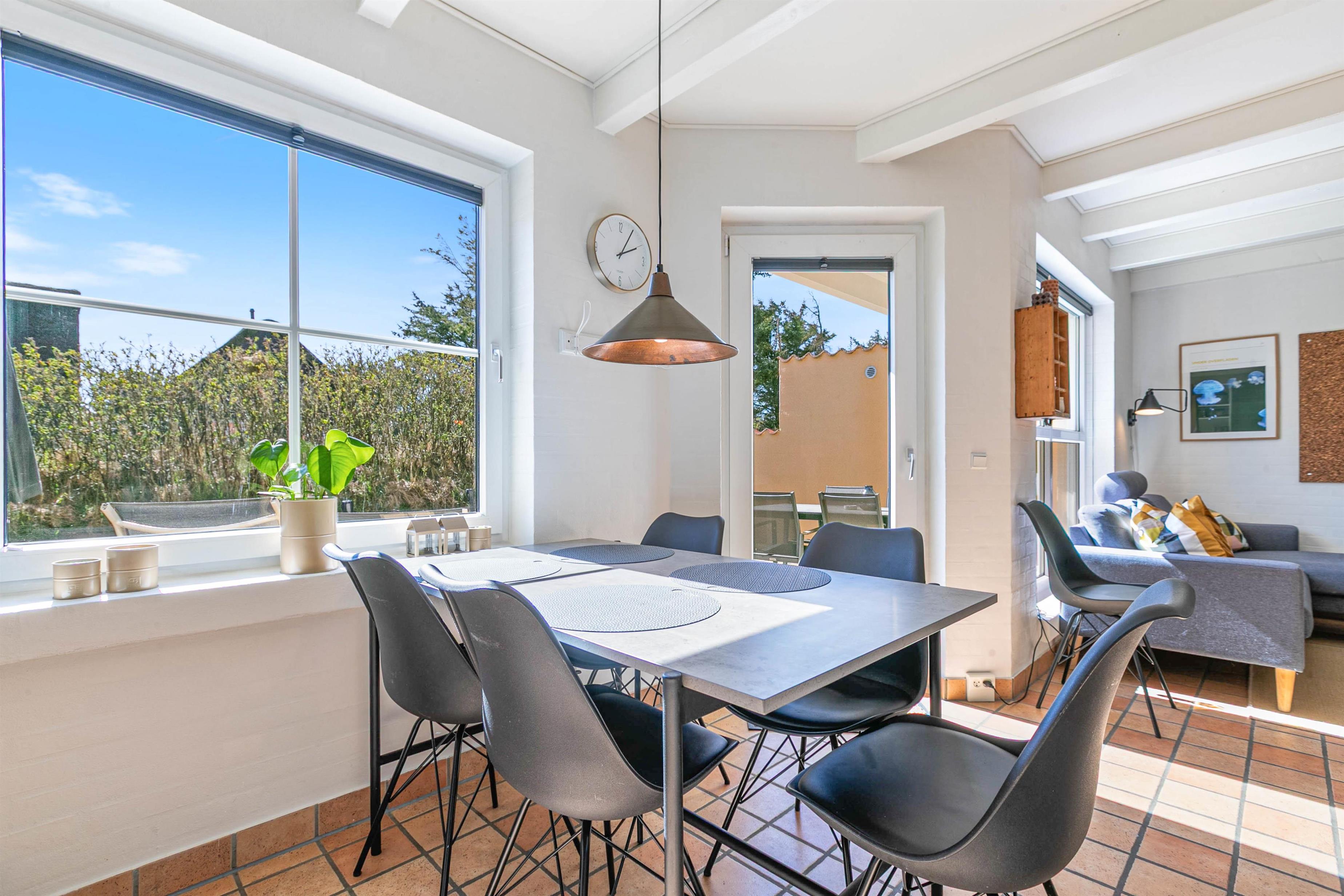 Fra midten af feriehuset har I tilmed adgang til den fine, sydvendte og lukkede terrasse med parasol og 2 liggestole. Den lukkede terrasse er ideel, hvis I har børn eller hund med, og trods den helt centrale placering, midt i Søndervig, kan du stadig sidde helt ugeneret på terrassen.