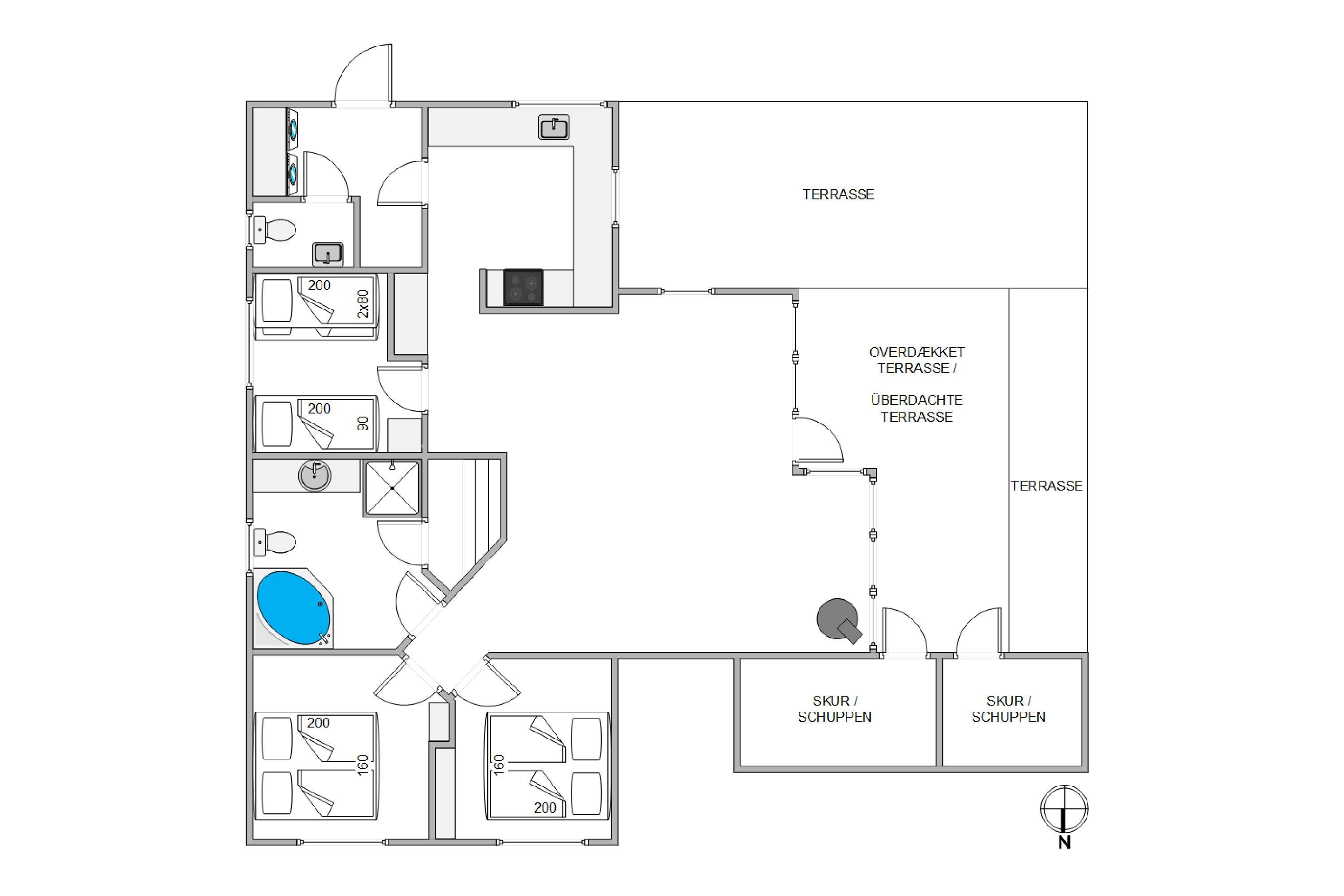 Feriehuset byder jer velkomment med et åbent køkkenalrum, som sørger for at I kan have en samtale sammen, uanset om I sidder i sofaen og slapper af, eller om I står i køkkenet og er i gang med at tilberede et lækkert måltid mad. Køkkenet er praktisk indrettet, og opvaskemaskinen klarer opvasken, hvor I imens kan sidde sammen ved køkkenbordet og spille et spil sammen. Den knitrende ild i brændeovnen skaber en behagelig feriestemning, når I hygger jer i sofaen og nyder en hyggelig aften foran tv´et. De er også muligt at se tyske tv-programmer.