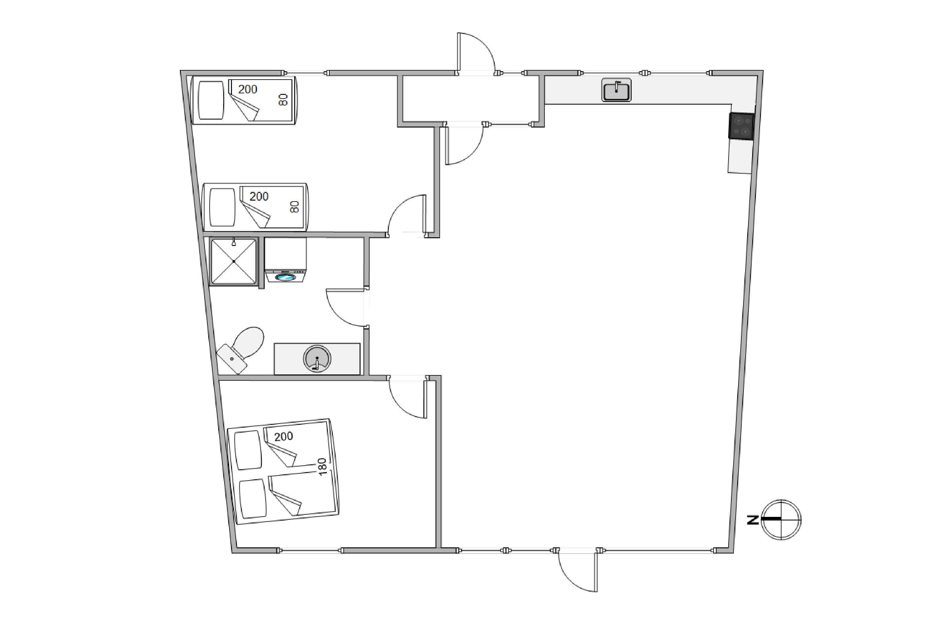 Ferieboligens seks sovepladser har alle gulvvarme og er fordelt med et værelse med dobbeltseng, et værelse med to enkeltsenge og en sovesofa i stuen. Derudover er der et rummeligt badeværelse med gulvvarme, bruseniche, vaskemaskine og tørretumbler.