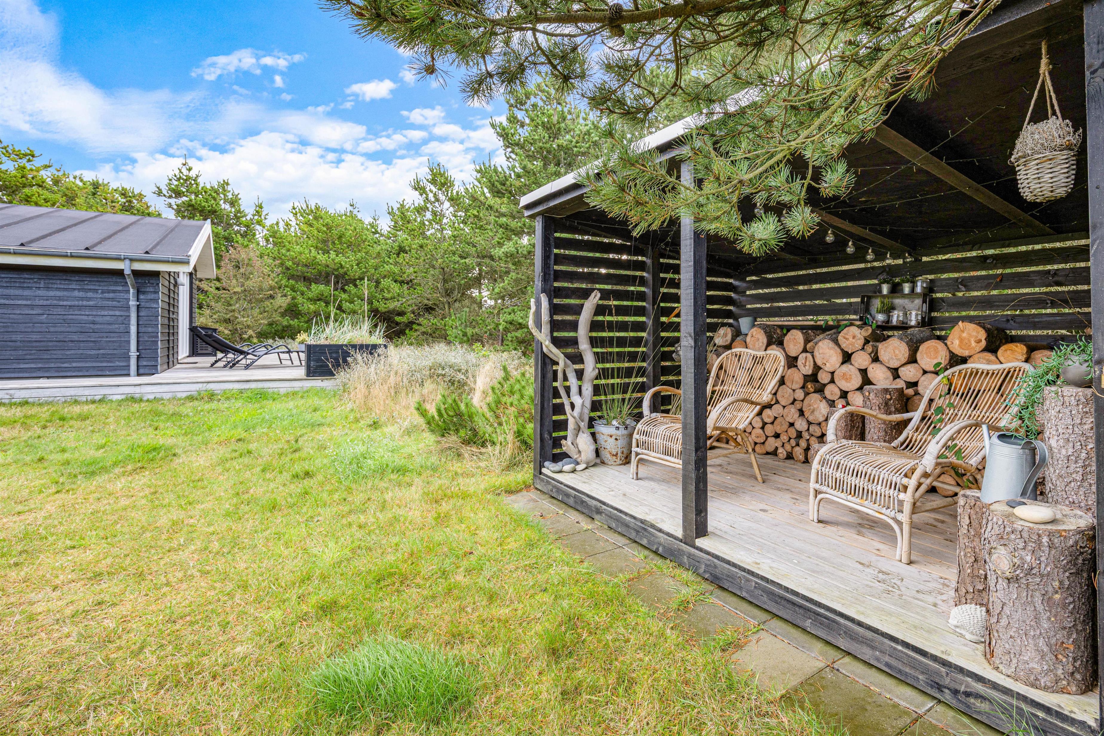 Med en imponerende grund på 1333 m2, er der masser af plads til udendørs aktiviteter. Sommerhuset har flere forskellige terrasse med grill og havemøbler, perfekt til de lange sommeraftener. Her er også plads til, at I kan tage jeres hund med - én hund er tilladt i sommerhuset. Grunden er en naturgrund, hvilket betyder, at I kan opleve den smukke, naturlige flora og fauna direkte fra jeres feriehus. Den egenerede terrasse vender mod nordvest, og her kan i uforstyrret nyde den friske vestenvind men også timevis af dasning på solsengen helt uforstyrret for naboerne. Selv hvis det regner, kan I sidde i ly og læ på husets lukkede terrasse.