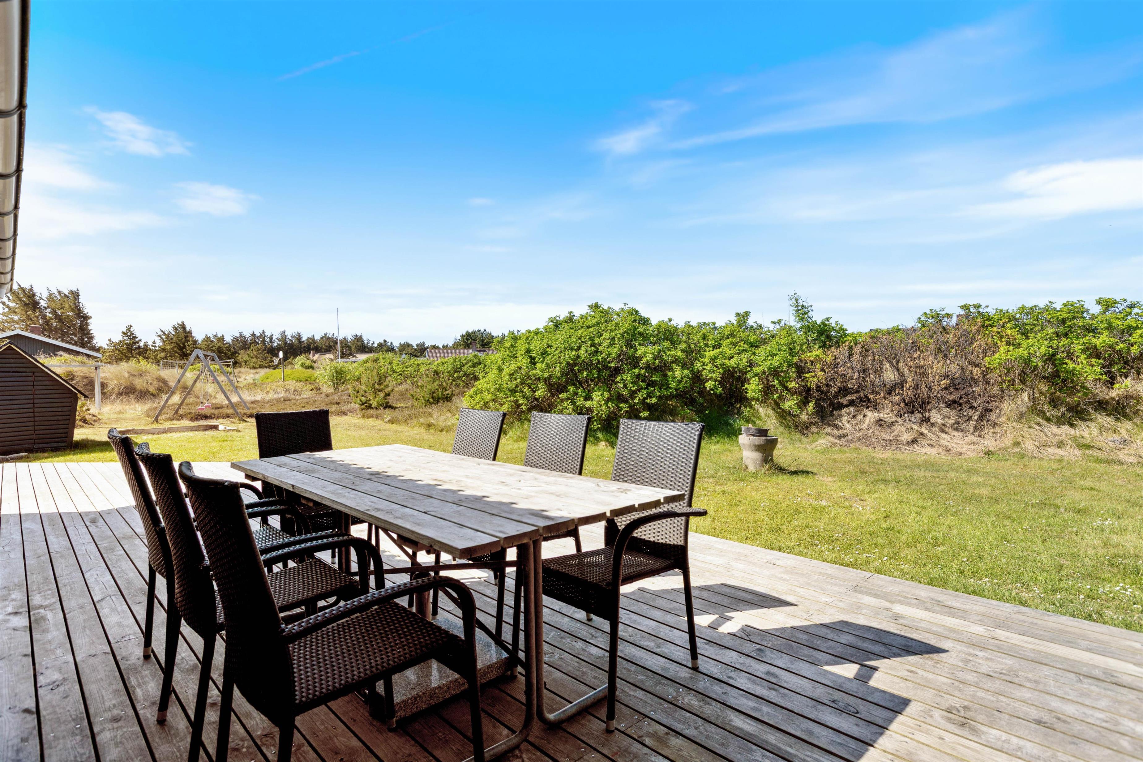På Frans Julius Vej 13 har I en dejlig stor uforstyrret træterrasse, der er åben ud til et græs- og let kuperet lyngareal. Med både gynge, sandkasse og legehus er den store grund et eldorado for børnene, og imens de små tumler rundt i den friske luft, kan de store gøre det sig bekvemt på terrassens gode havemøbler og fordybe sig i en god bog.