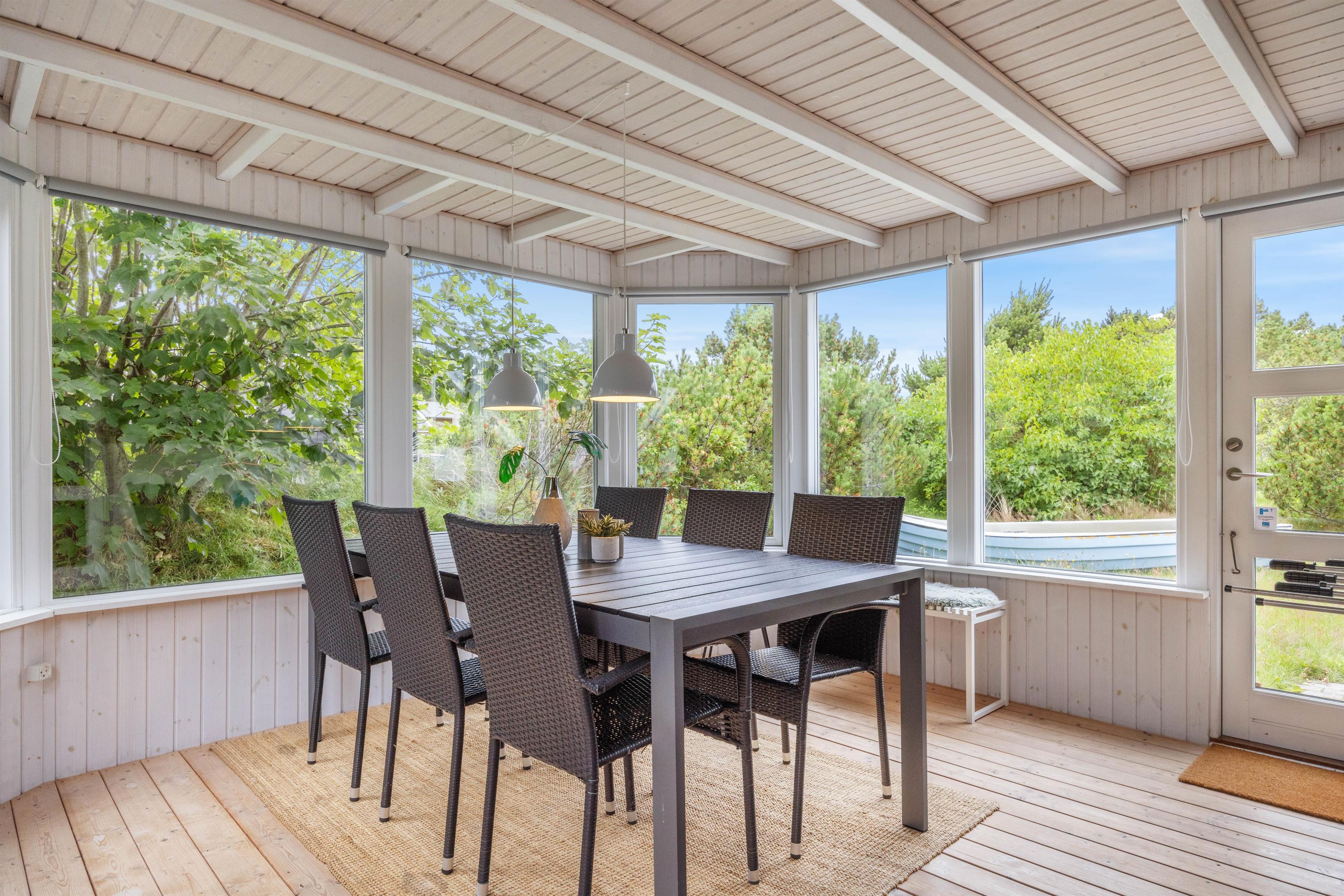 Den rummelige udestue er en af de mest specielle ting ved feriehuset: Allerede om foråret, når vejret stadig er en smule koldt, kan I få følelsen af at sidde udenfor. I kan nyde de første solstråler med en god bog og samtidig sidde helt beskyttet for vejr og vind.