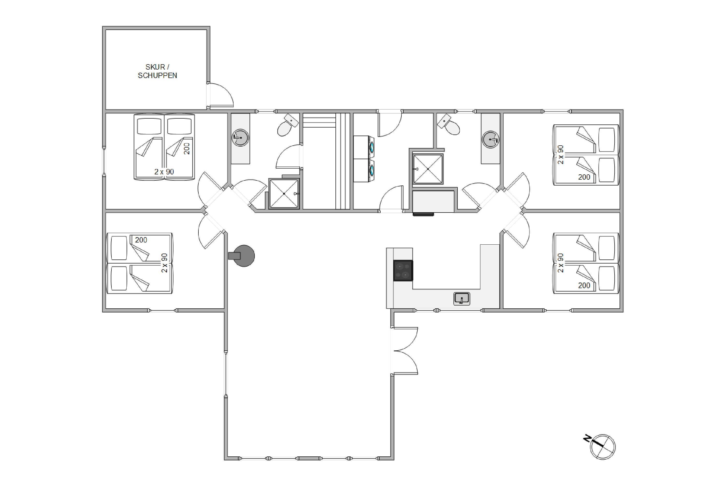 Sommerhuset byder på 120 kvadratmeterfordelt på fire rummelige soverum, hver med deres egen dobbeltseng, så I kan nyde en rolig og afslappet nattesøvn. To moderne badeværelser med gulvvarme sikrer, at komforten er i top, selv på de køligere dage. Om aftenen kan I samles i den hyggelige stue hvor der er loft til kip, hvilket skaber en skøn og dejlig rummelig stue. Her er der en brændeovn, der er med til at sprede varme og hygge, mens I nyder hinandens selskab.