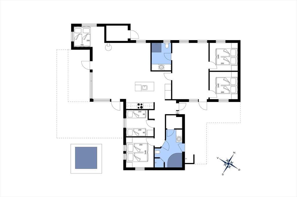 Huset har 4 gode soverum, en stor hems, alkove, åbent køkken/alrum, stor stue, 2 flotte badeværelser, aktivitetsrum og et lækkert udendørs spabad.
