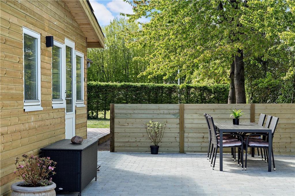 Stor ugenert grund omkranset af træer og buske. Åben og overdækket terrasse med havemøbler.